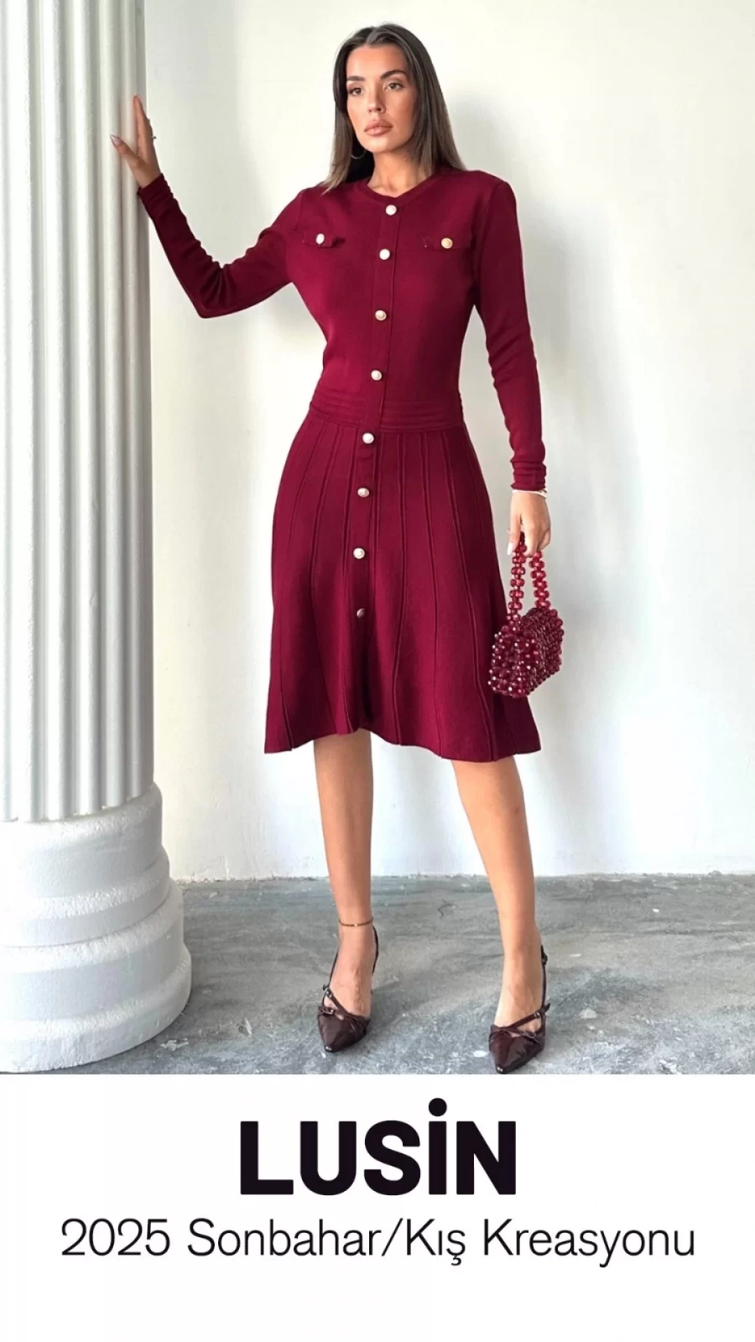 Kadın Bordo Şık Yaka Detaylı Midi Boy Triko Elbise
