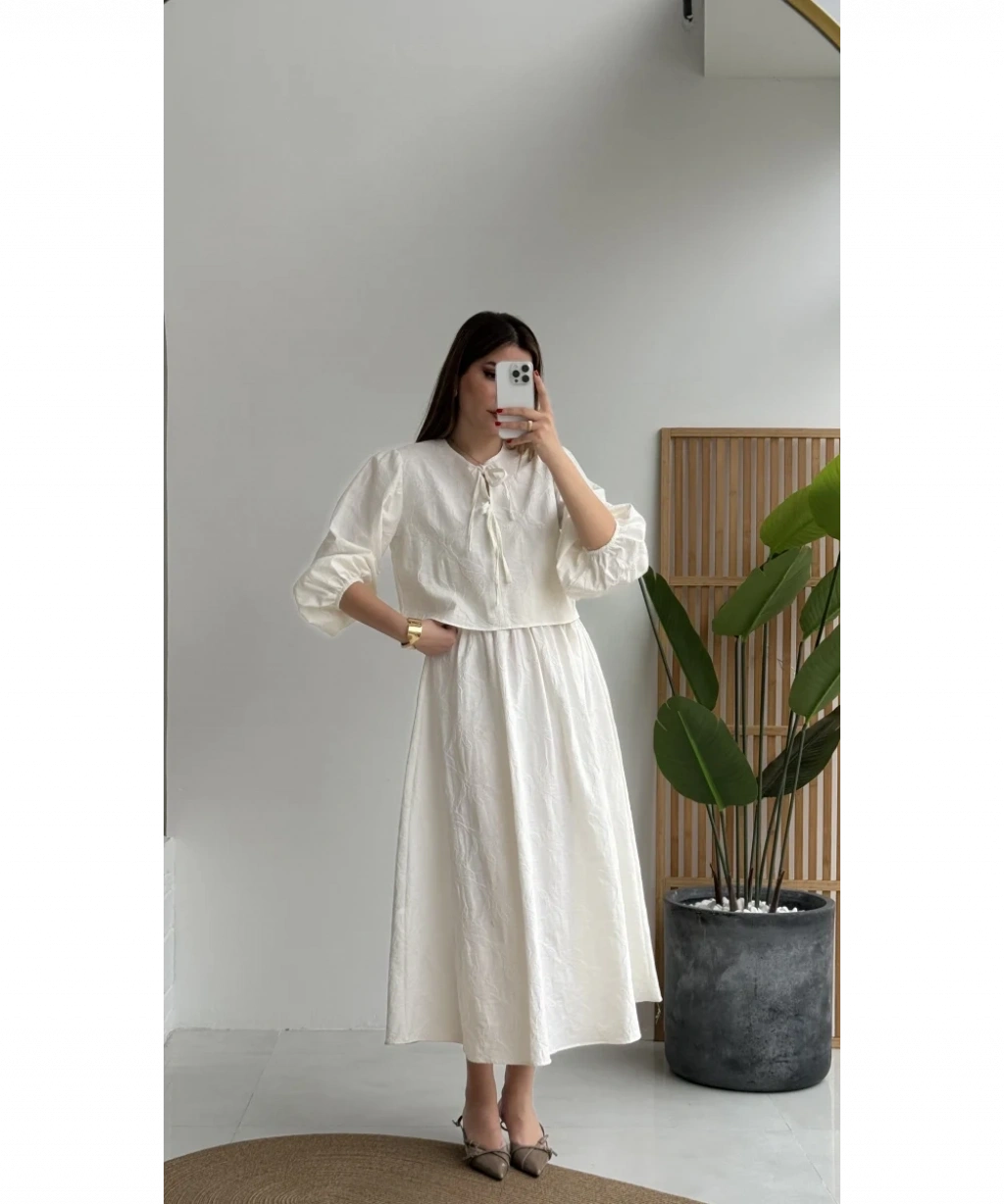 Kadın Ekru Çiçek Nakışlı Gömlek Beli Lastikli Etek Bluz İkili Takım