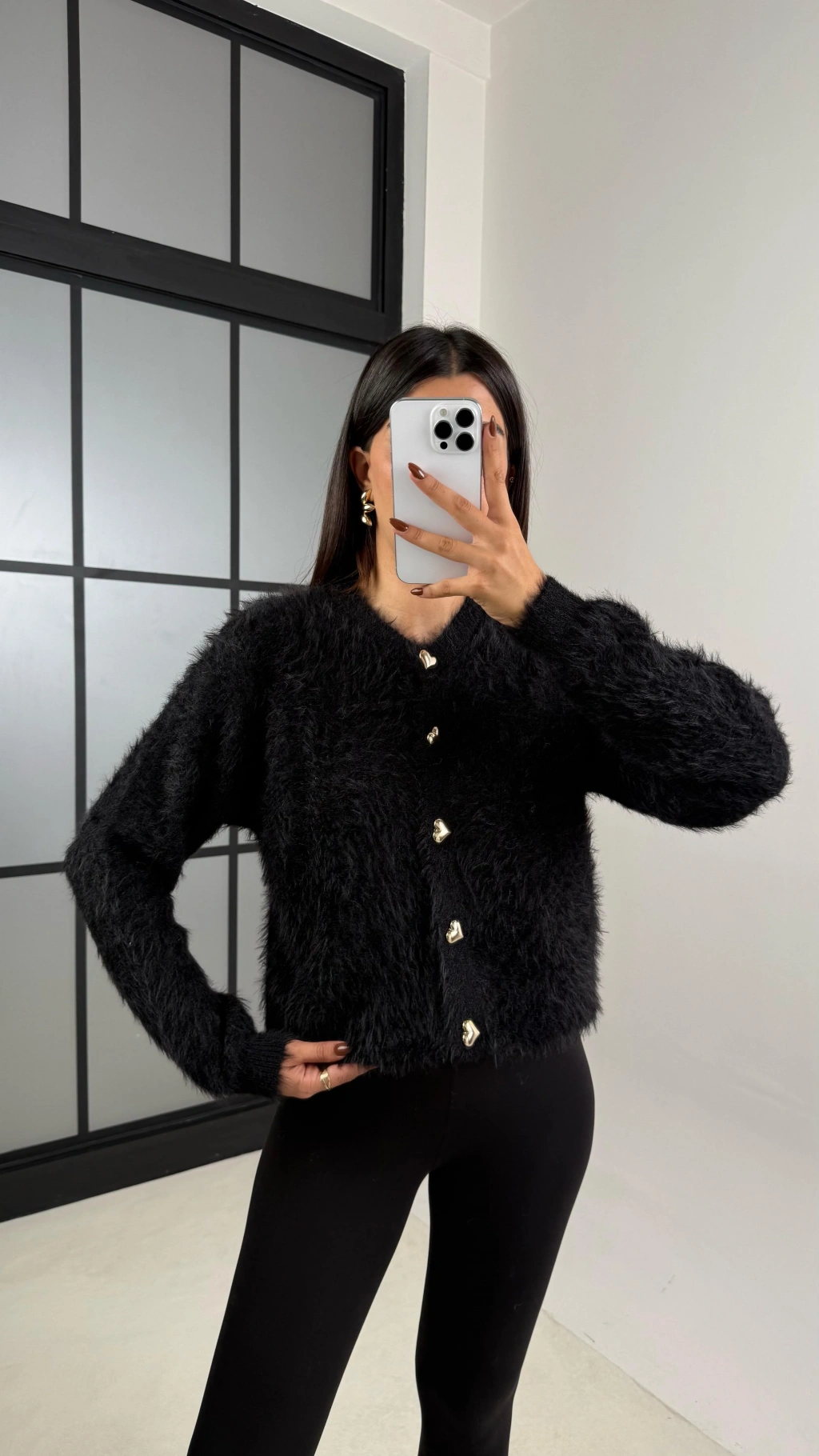 Kadın Siyah Kalp Düğme Detaylı Yumuşak Dokulu Premium Kalite Hırka