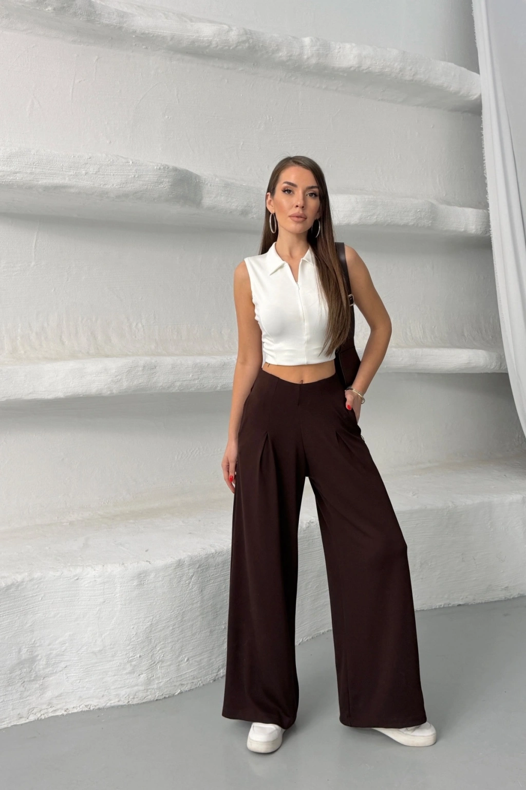 Kadın Acı Kahverengi Yüksek Bel Likralı Cırt Bant Kapamalı Geniş Paça Palazzo Pantolon