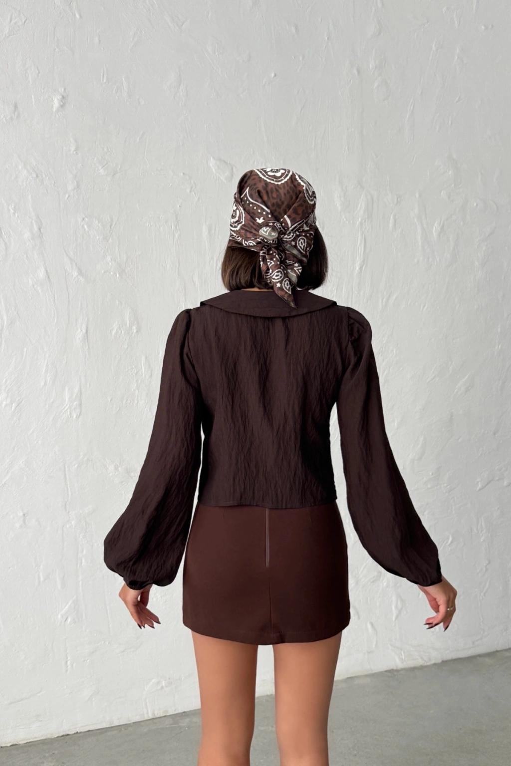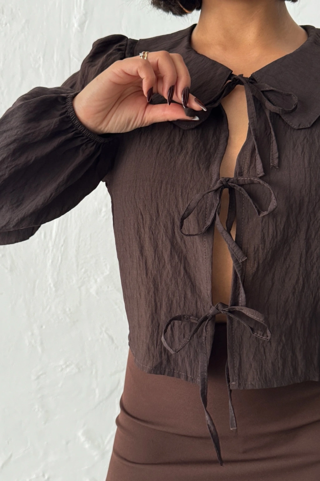 Kadın Acı Kahverengi Bağlamalı Önü Açık Büyük Yaka Balon Kol Mevsimlik Yazlık Gömlek Bluz