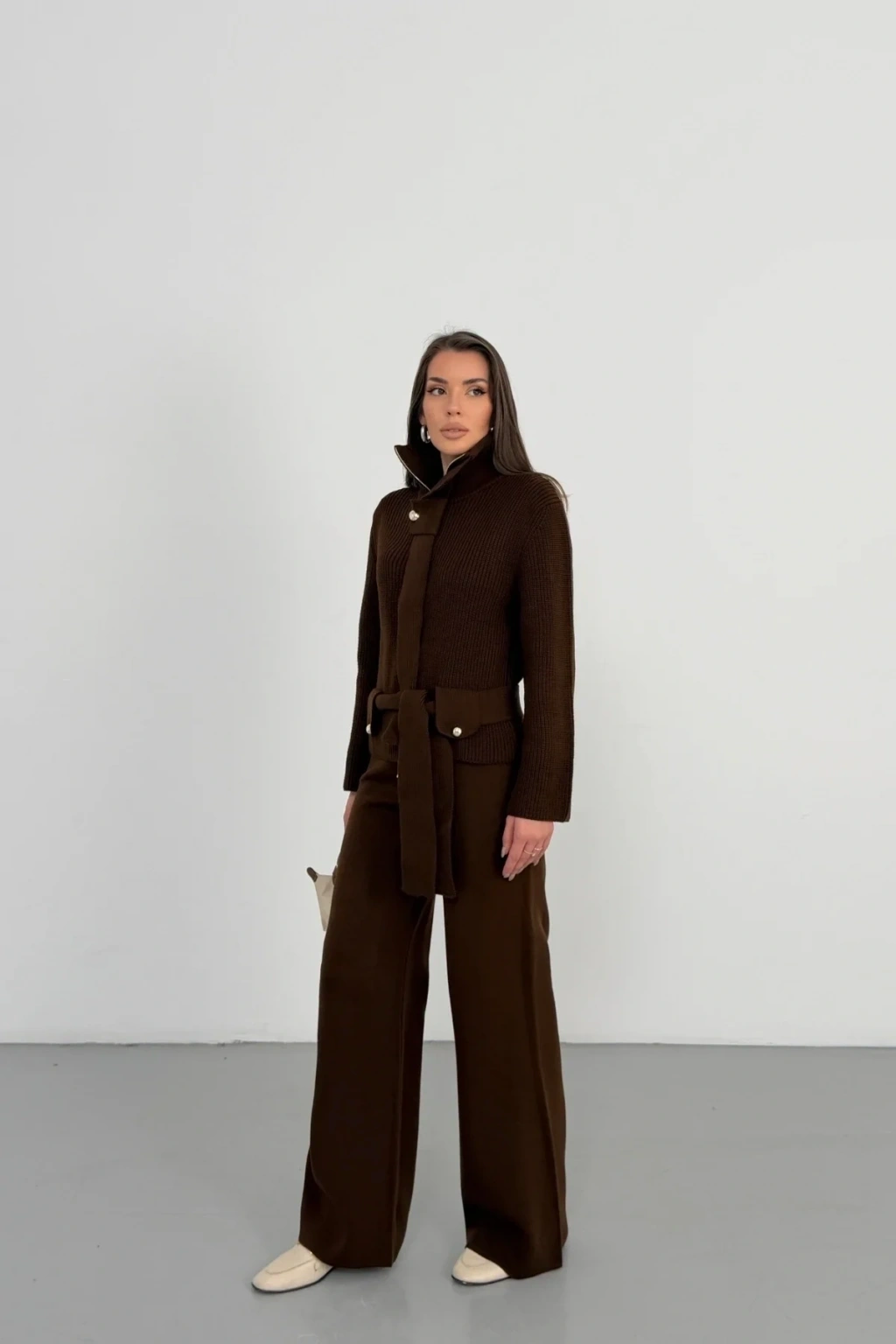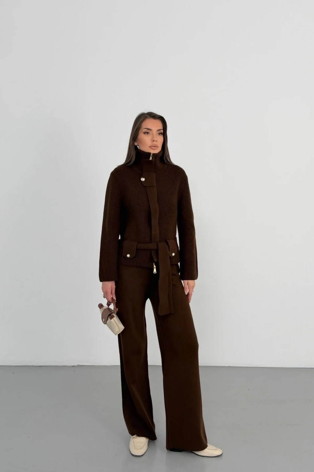 Kadın Acı Kahverengi Dik Yaka Kuşaklı Premium Kalite Triko Hırka Bol Paça Pantolon Triko Takım