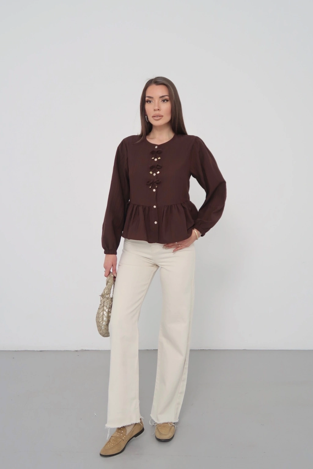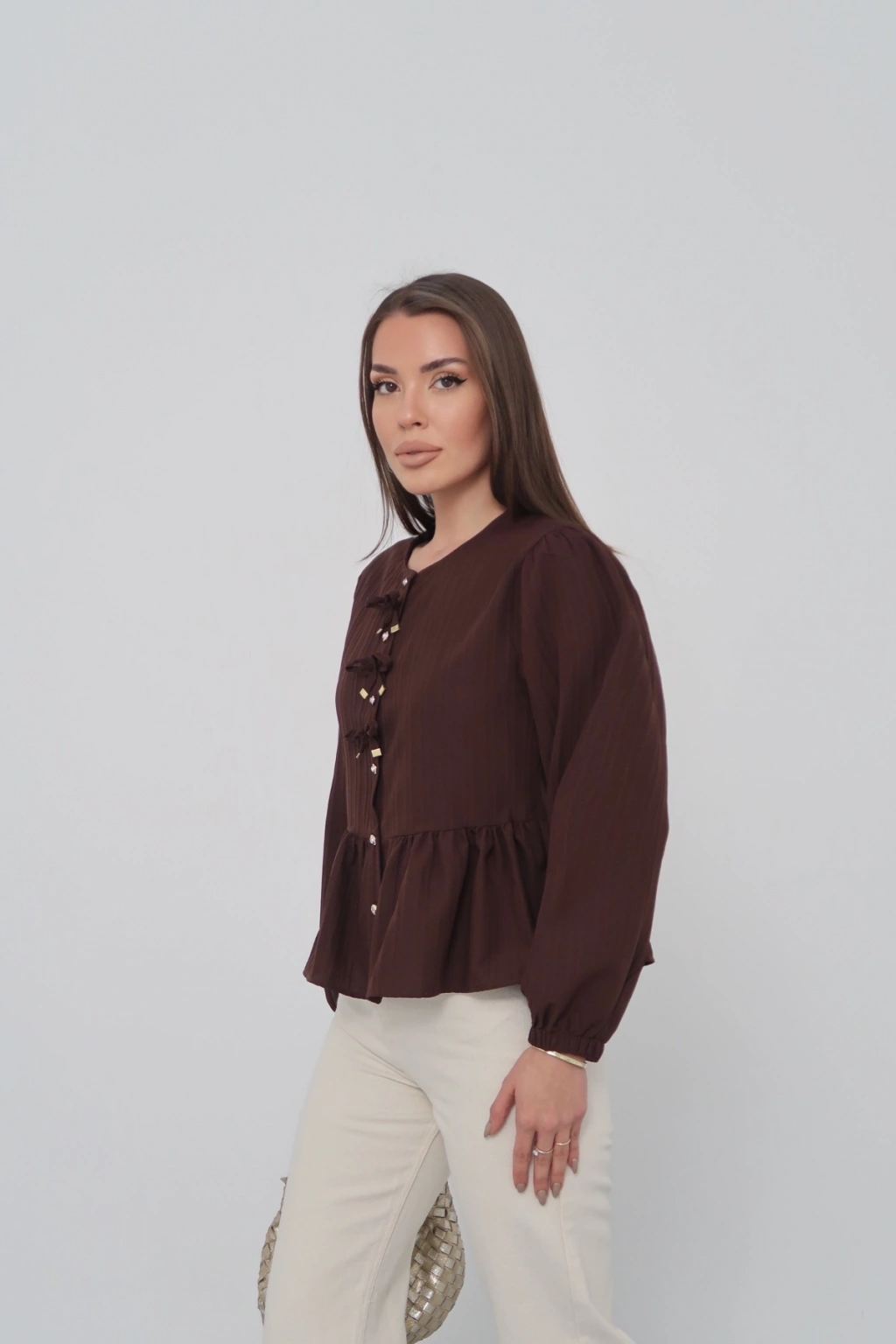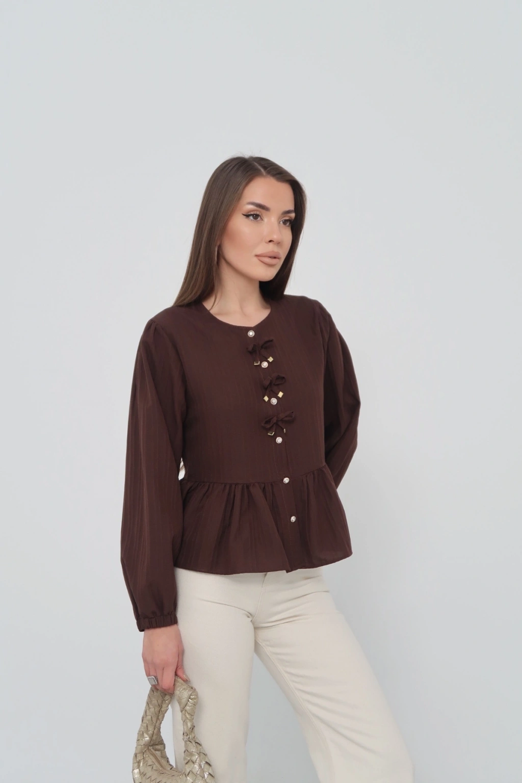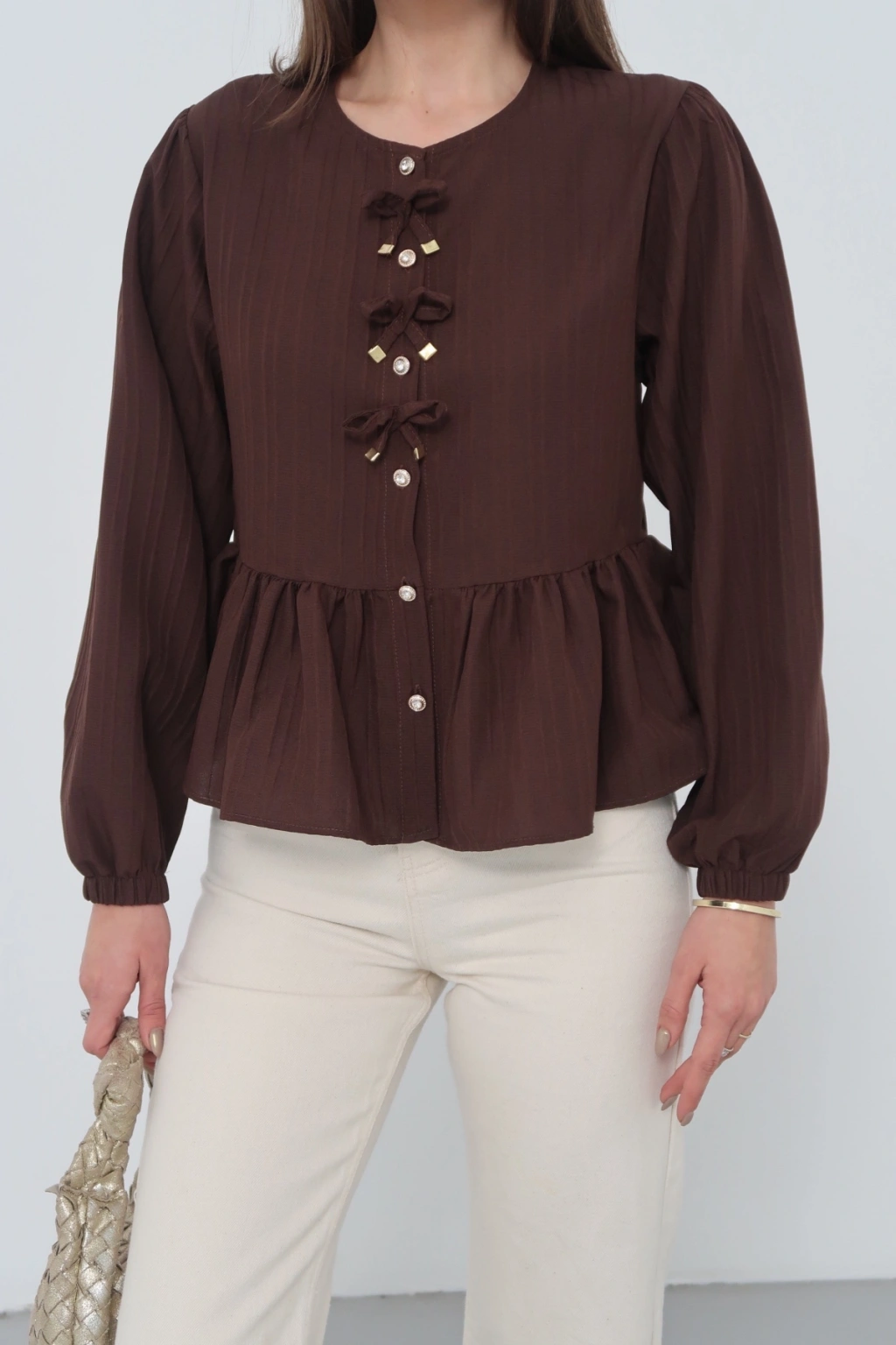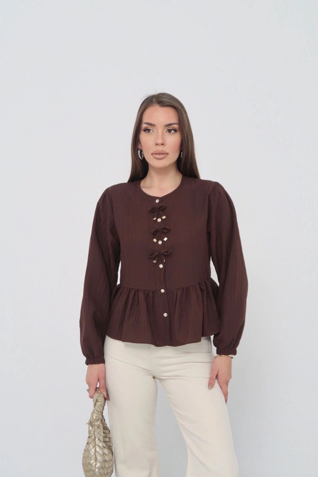 Kadın Acı Kahverengi Fiyonk Detaylı Düğmeli Uzun Kol Gömlek Bluz