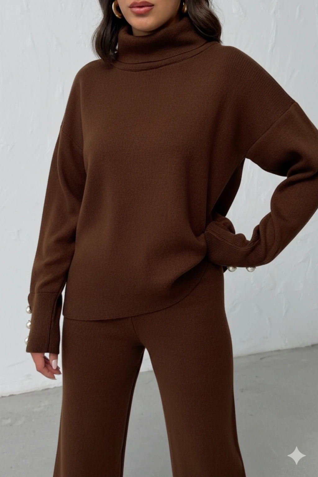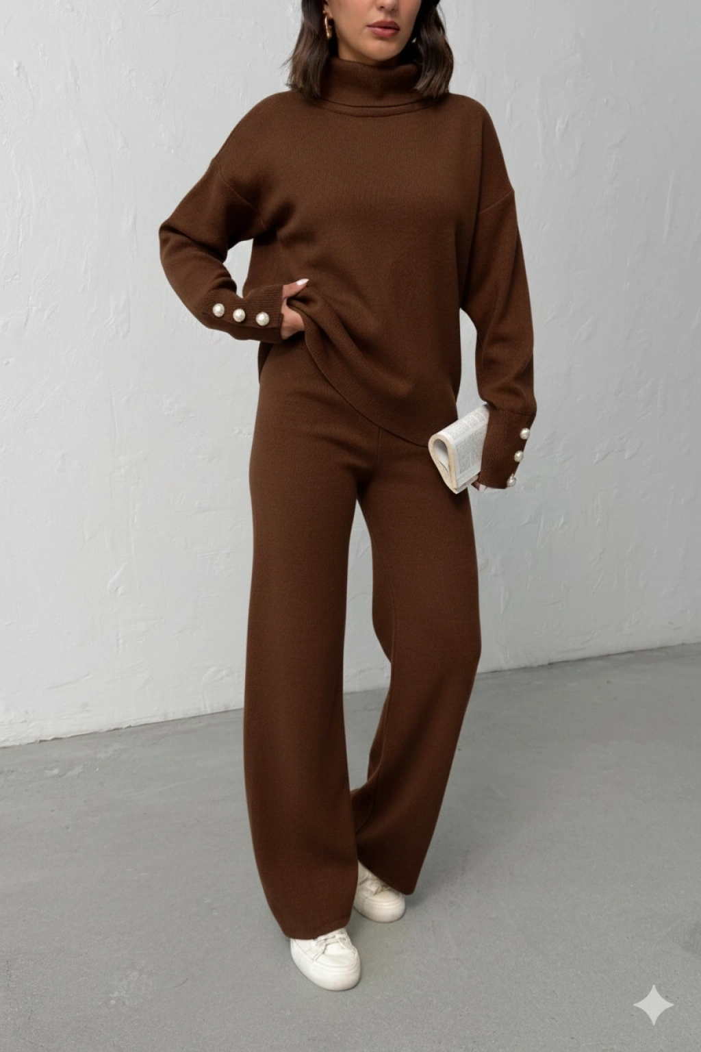 Kadın Kahverengi Şık Yaka Detaylı Düğmeli Bluz Pantolon Alt Üst İkili Triko Takım (Yeni Renk)