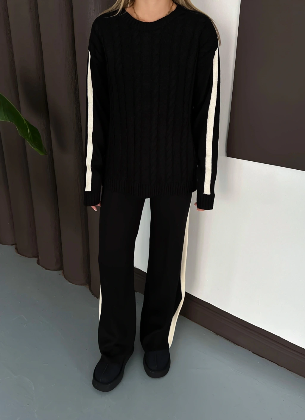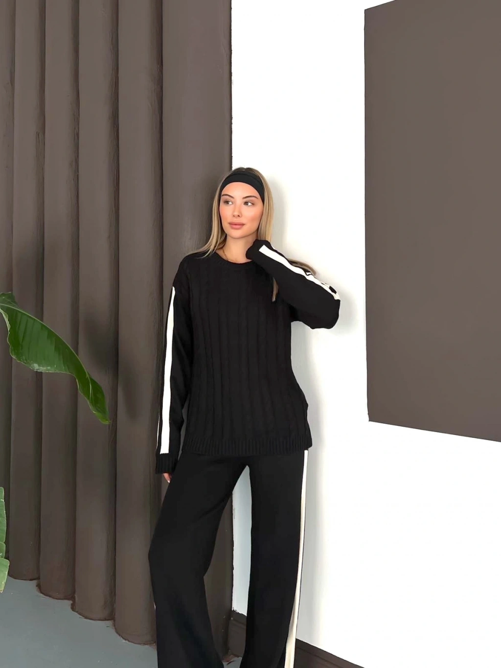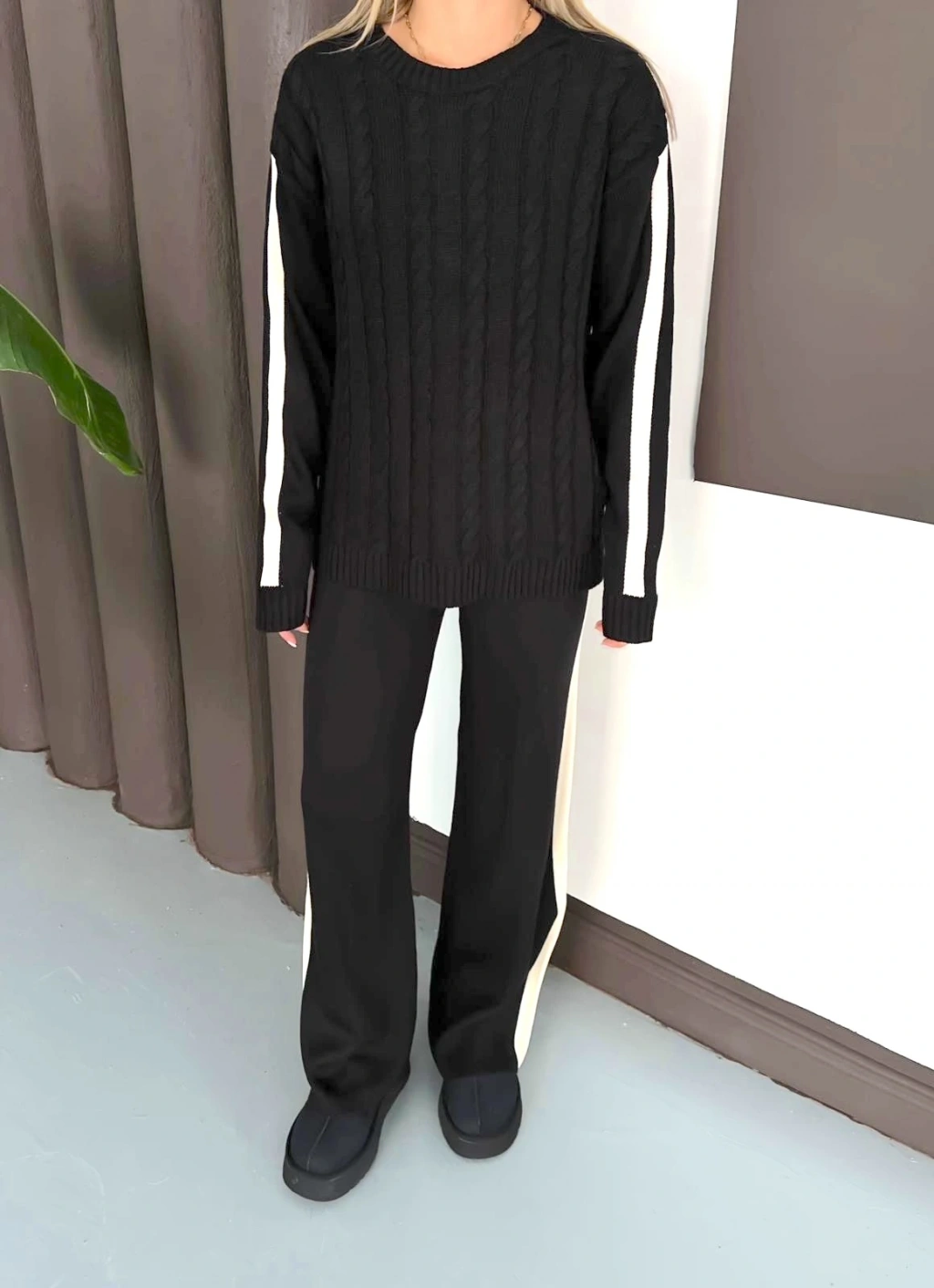 Kadın Siyah Şerit Detaylı Kazak Pantolon Alt Üst İkili Triko Takım