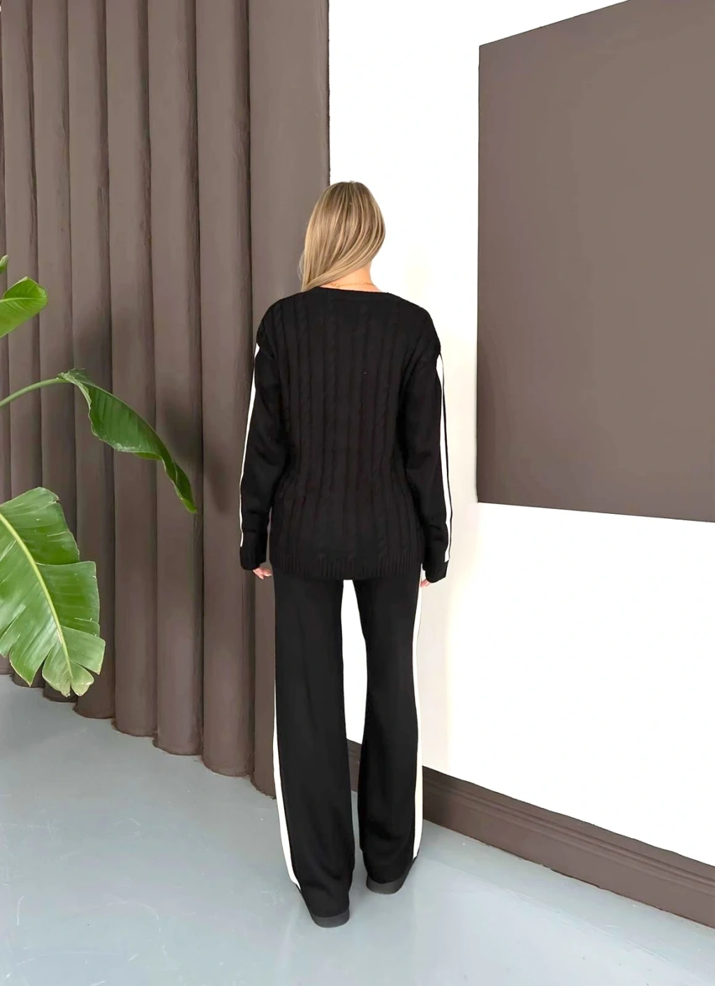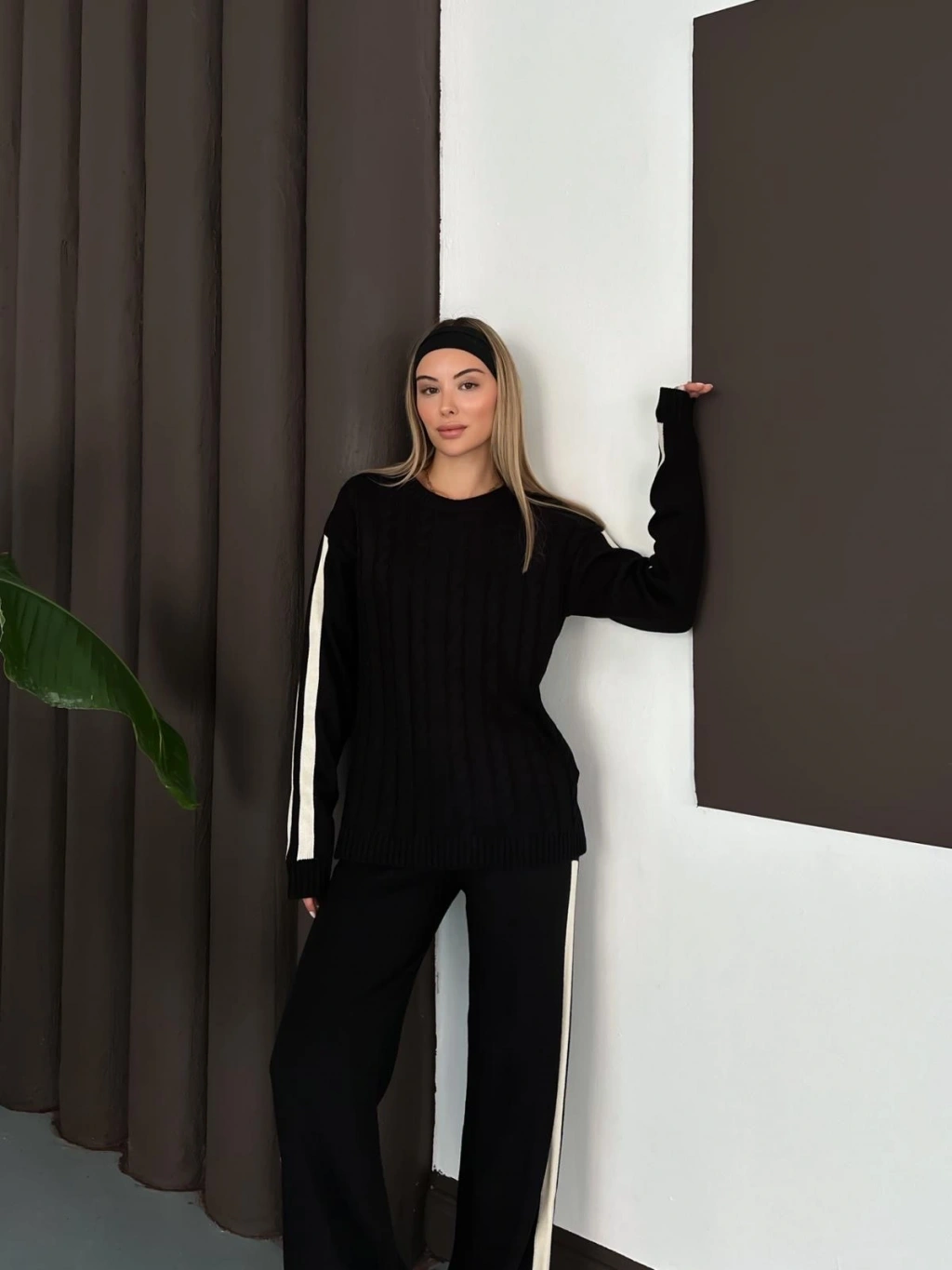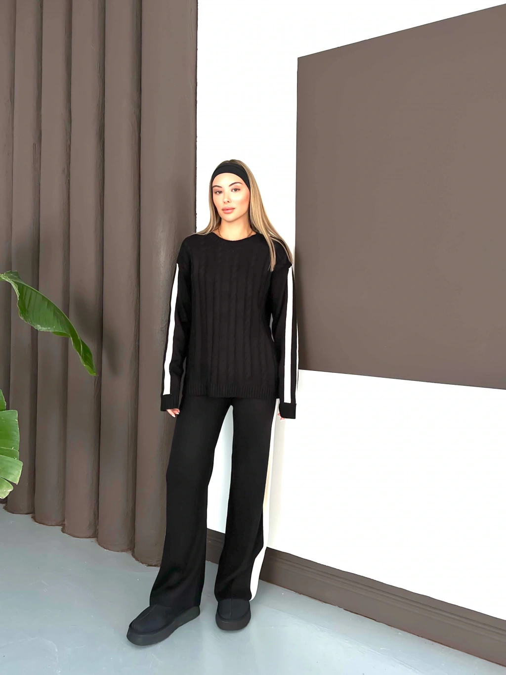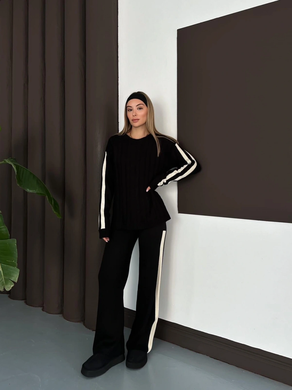 Kadın Siyah Şerit Detaylı Kazak Pantolon Alt Üst İkili Triko Takım