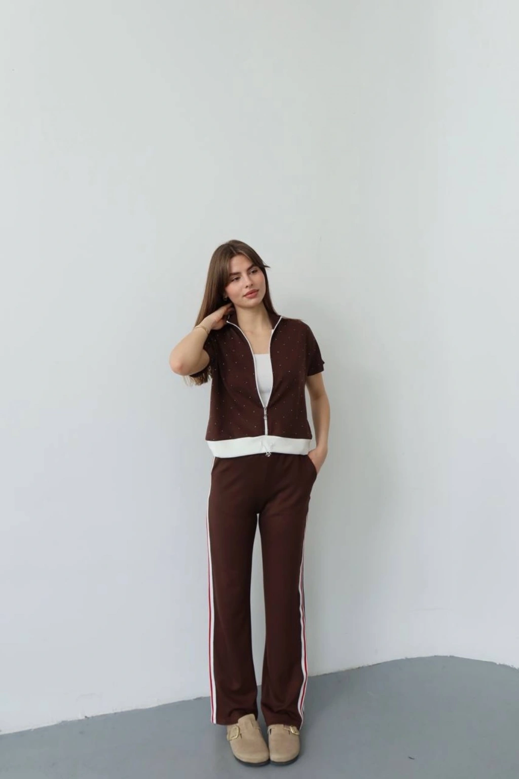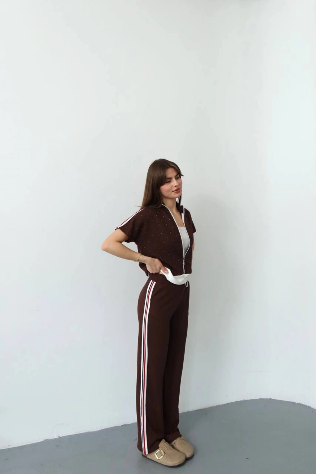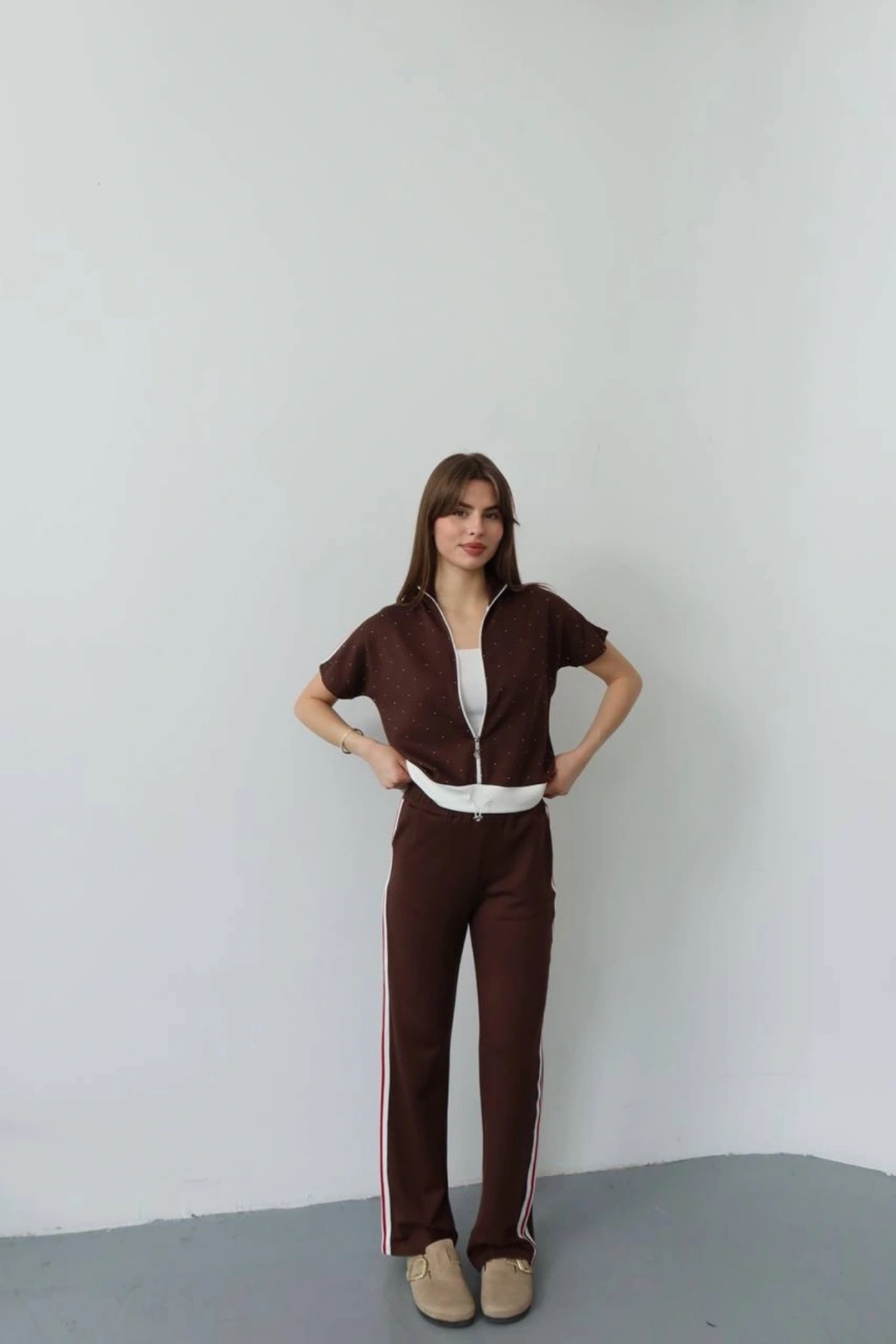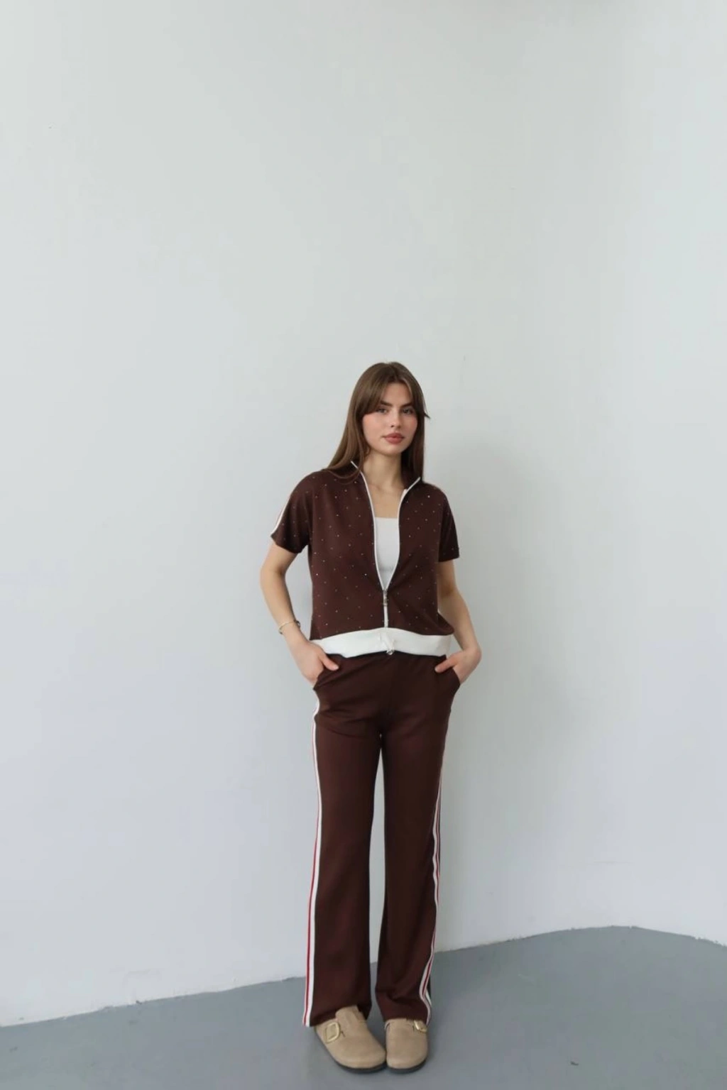 Kadın Acı Kahverengi Şık Taş ve Şerit Detaylı Pantolon Fermuarlı Bluz Alt Üst İkili Yumuşacık Takım