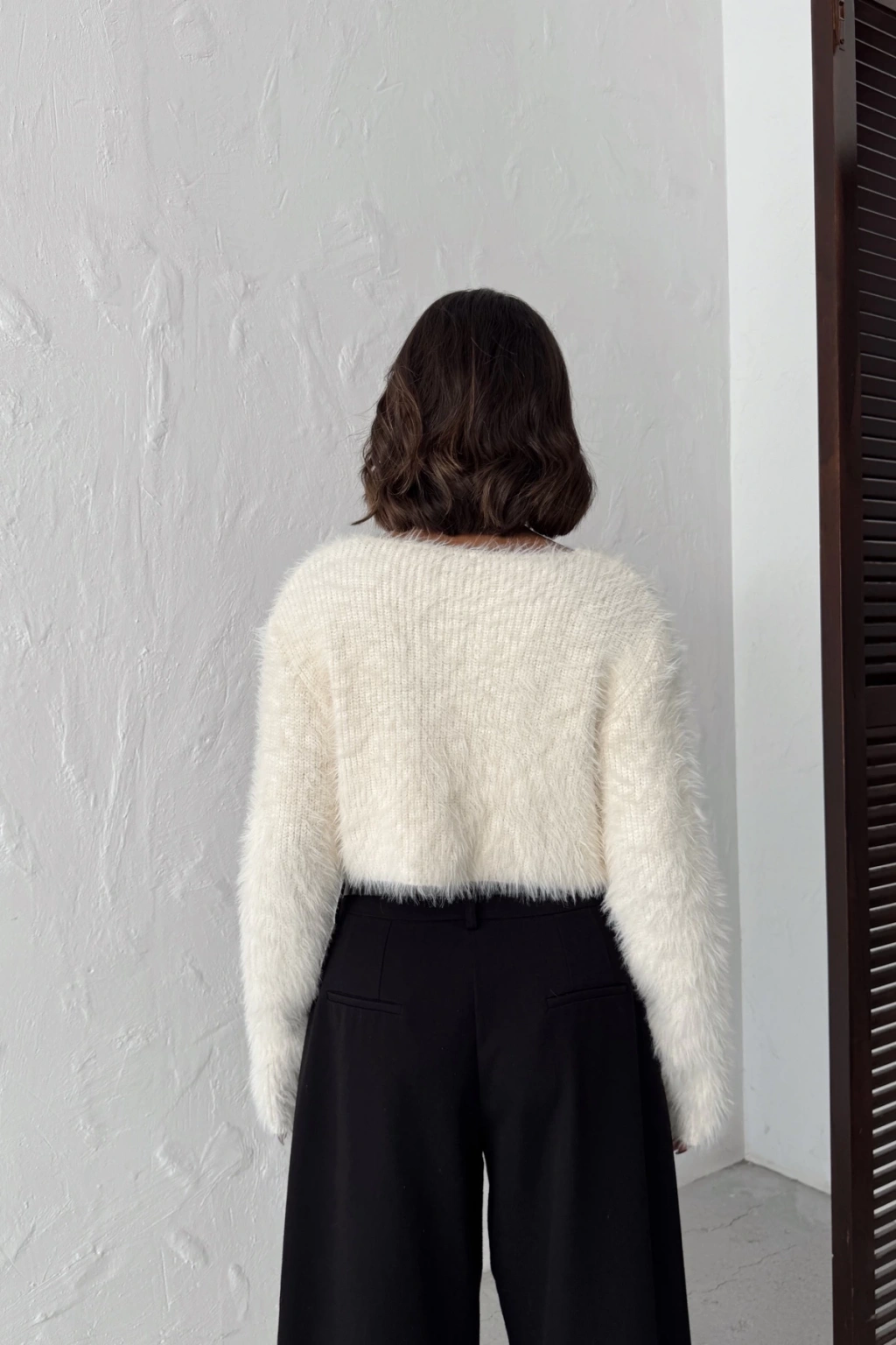 Kadın Beyaz Şık Yaka Detaylı Premium Yumoş Uzun Triko Hırka