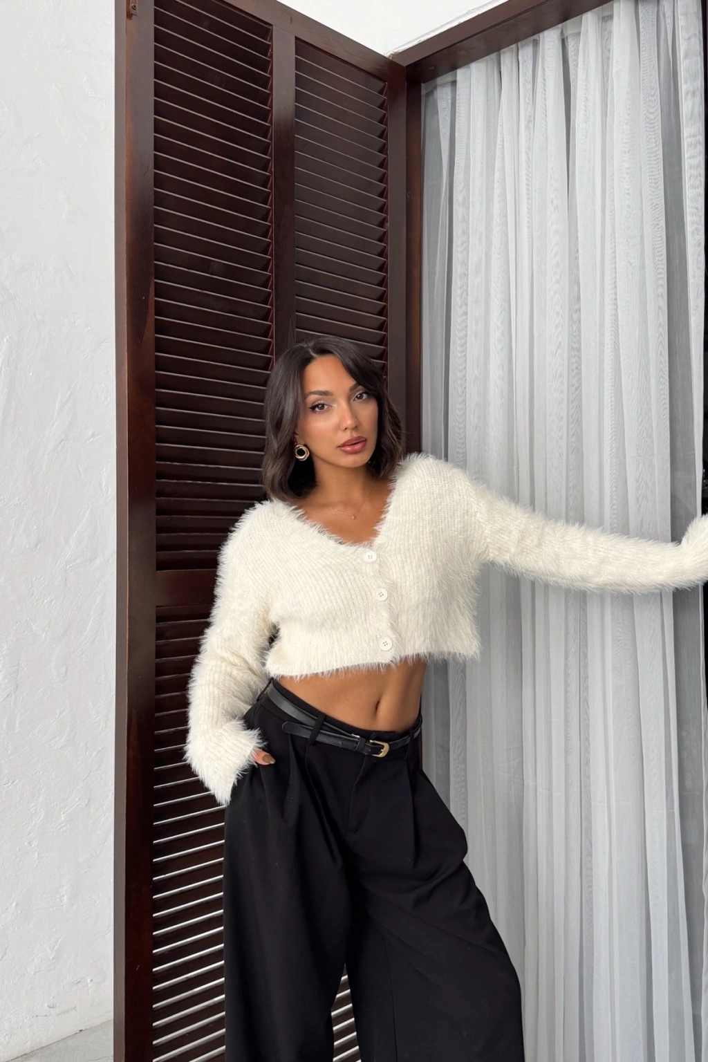 Kadın Gri Düğmeli Kısa Premium Peluş Hırka