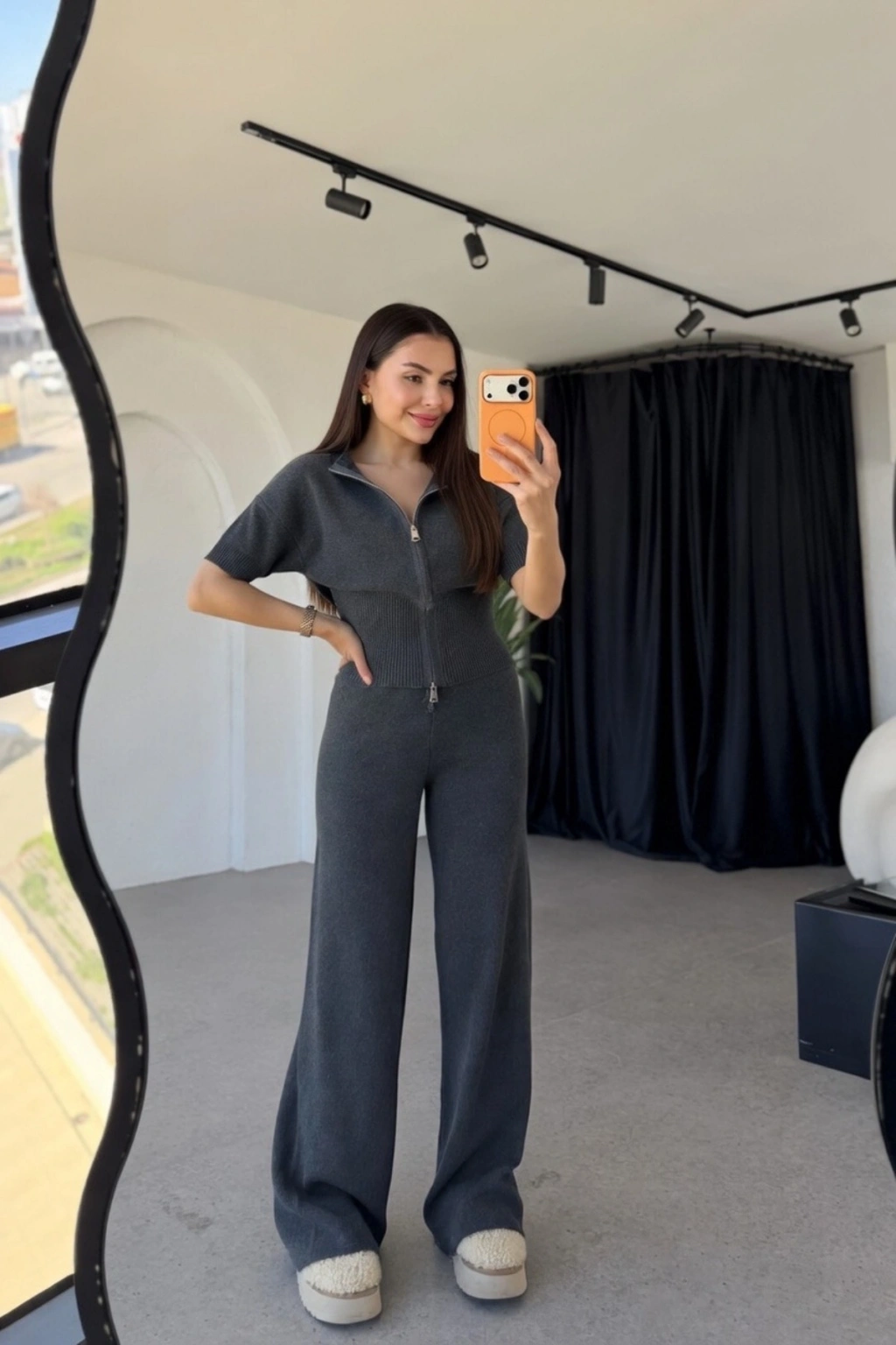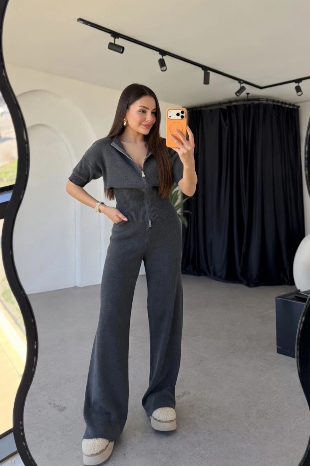 Kadın Antrasit Yarım Fermuarlı Crop Üst Geniş Paça Pantolon İkili Takım