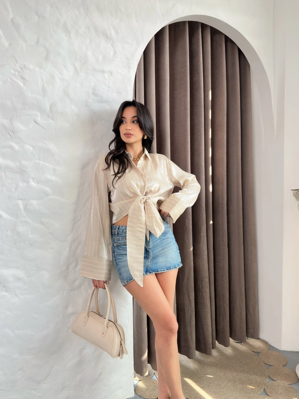 Kadın Bej Çizgili Öden Bağlama Detaylı Saten Yüzeyli Uzun Kol Gömlek