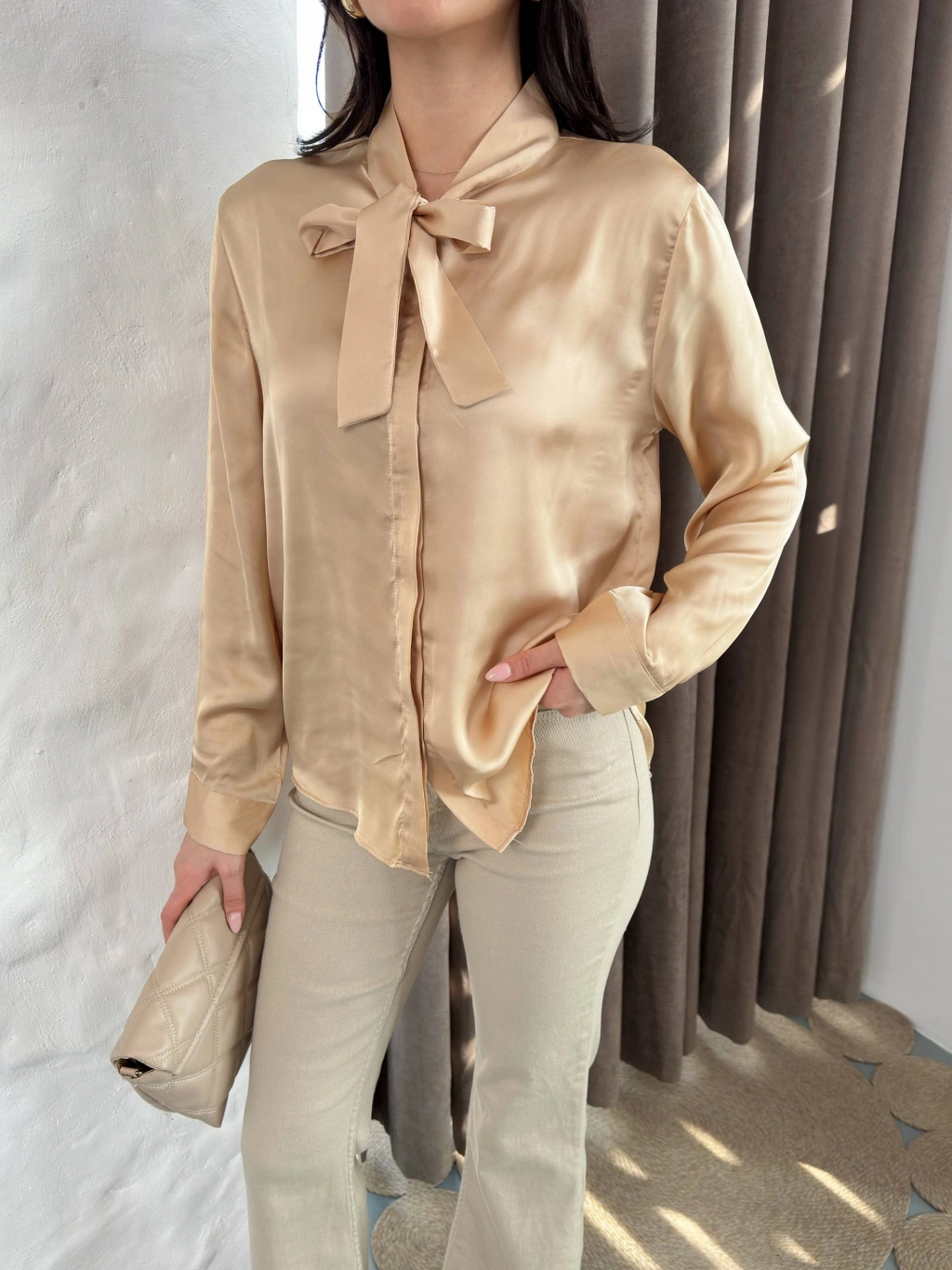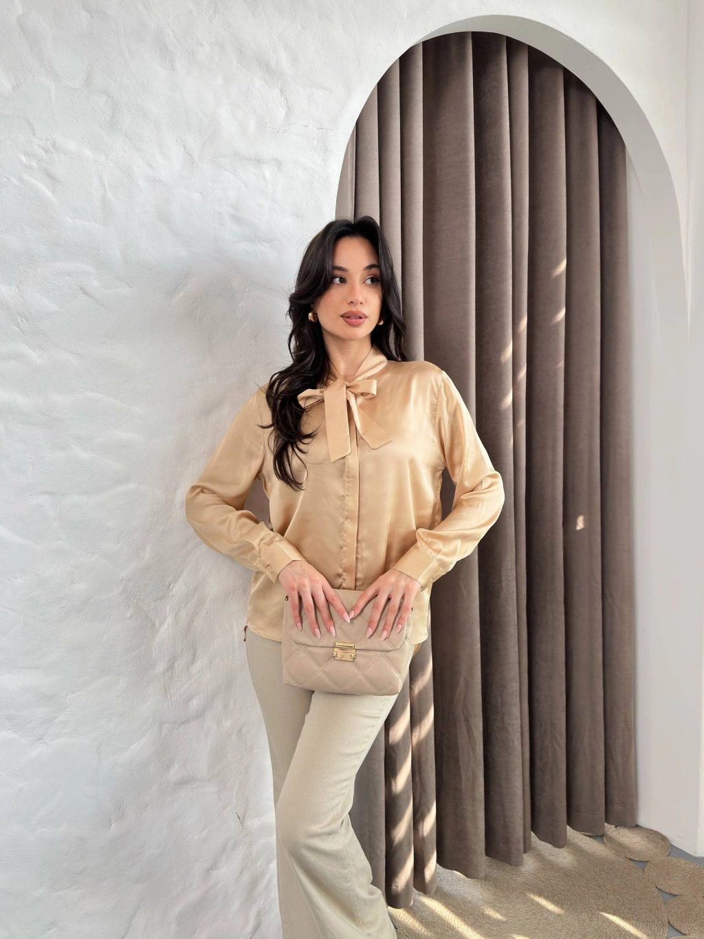 Kadın Bej Fiyonk Yaka Detaylı Uzun Kol Saten Gömlek