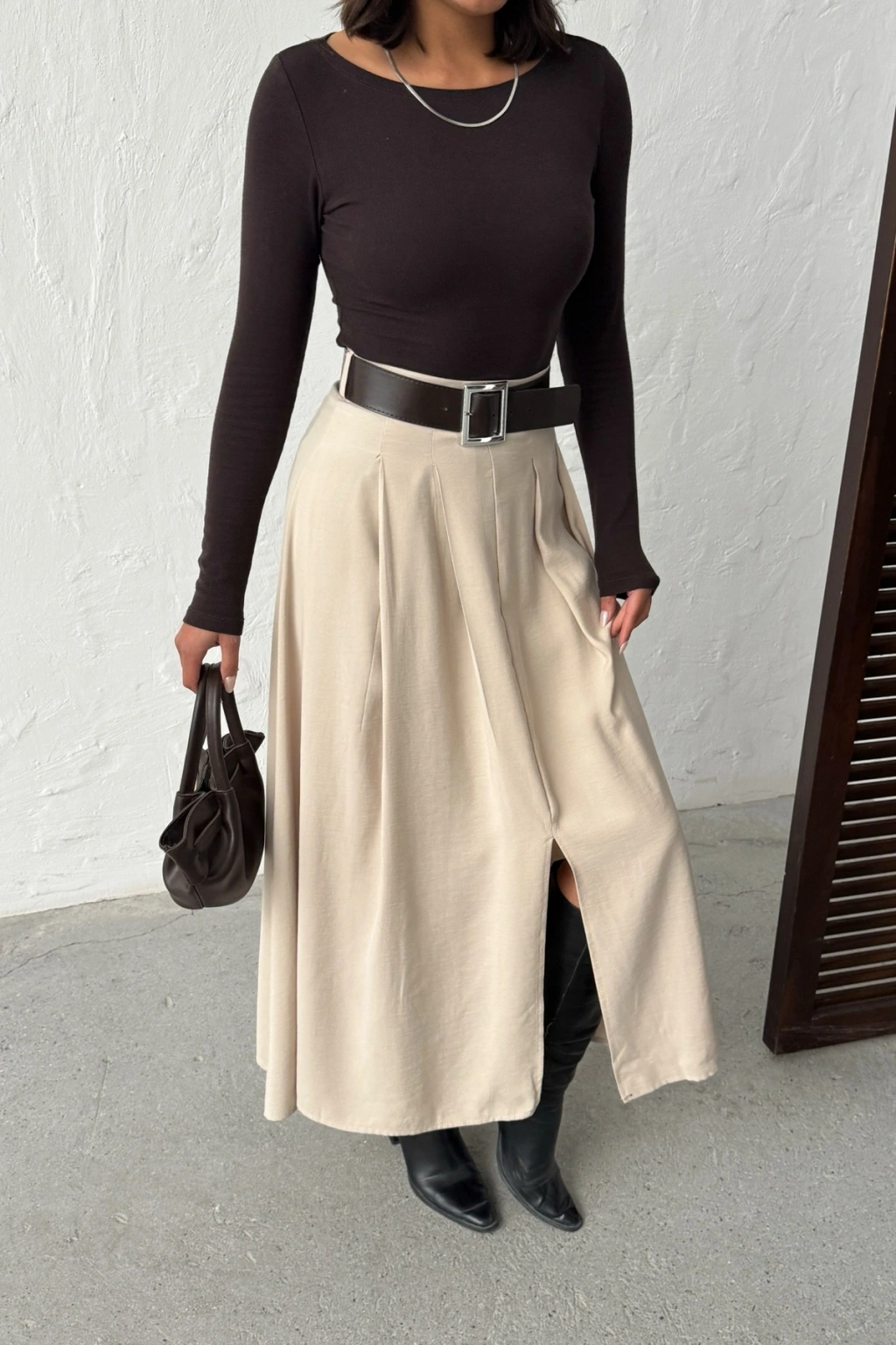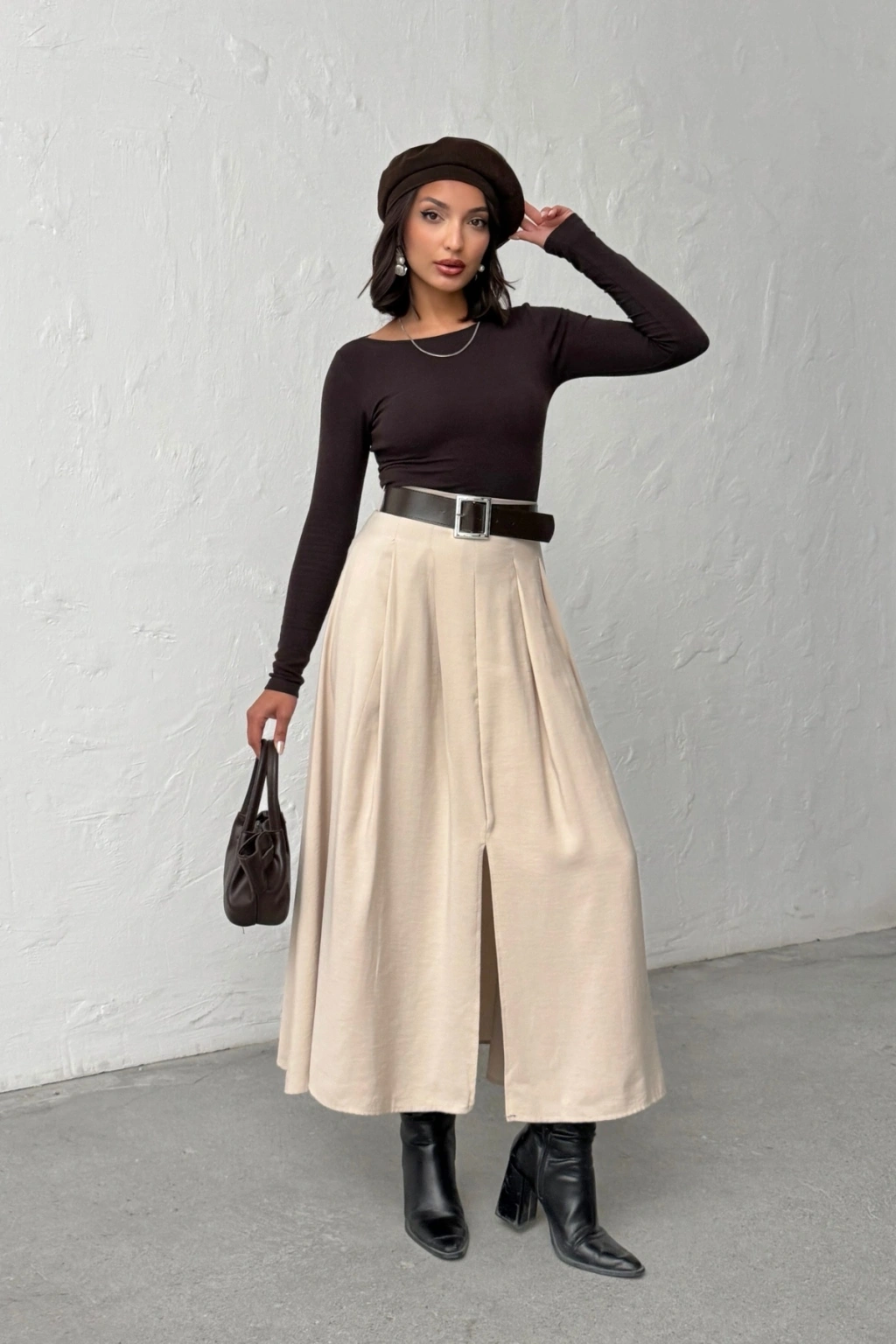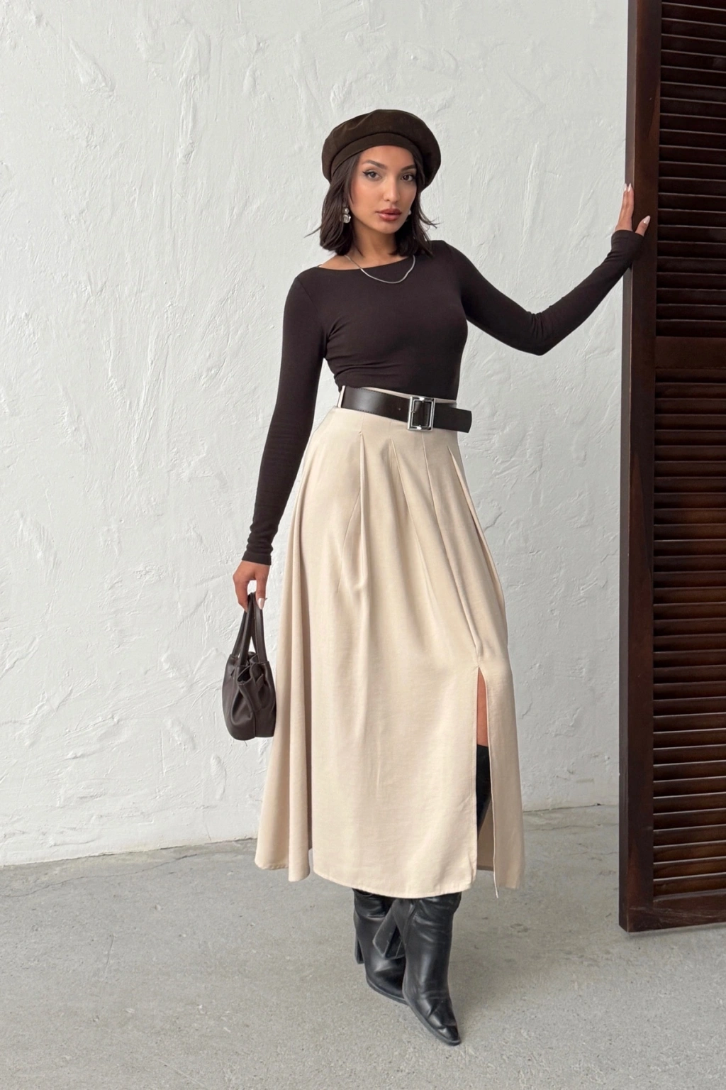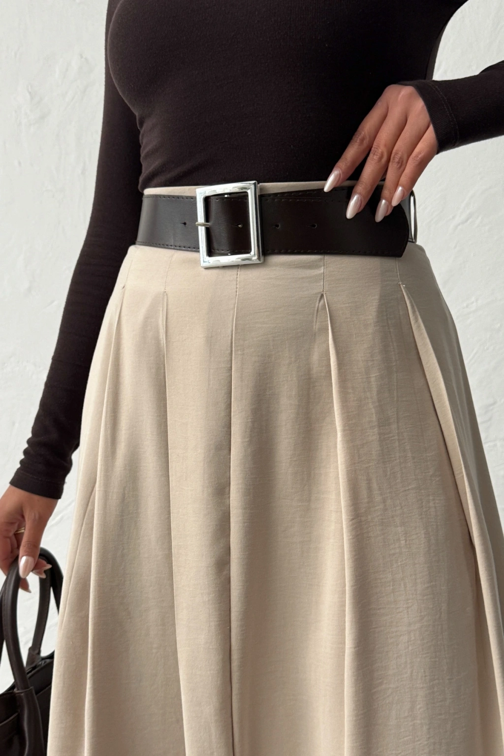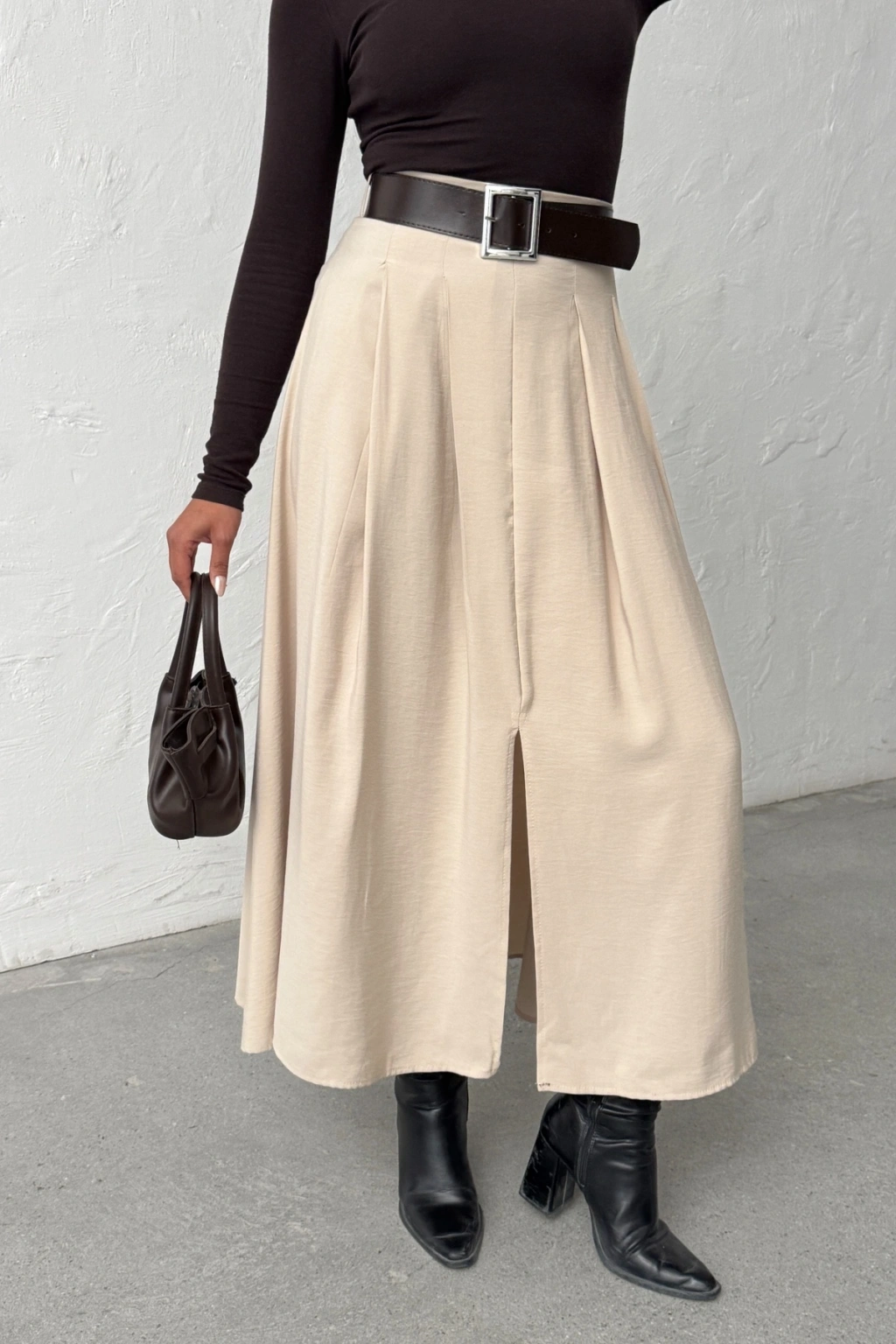 Kadın Bej Kemerli Tensel Kumaş Önden Yırtmaç Detaylı Premium Kalite Etek