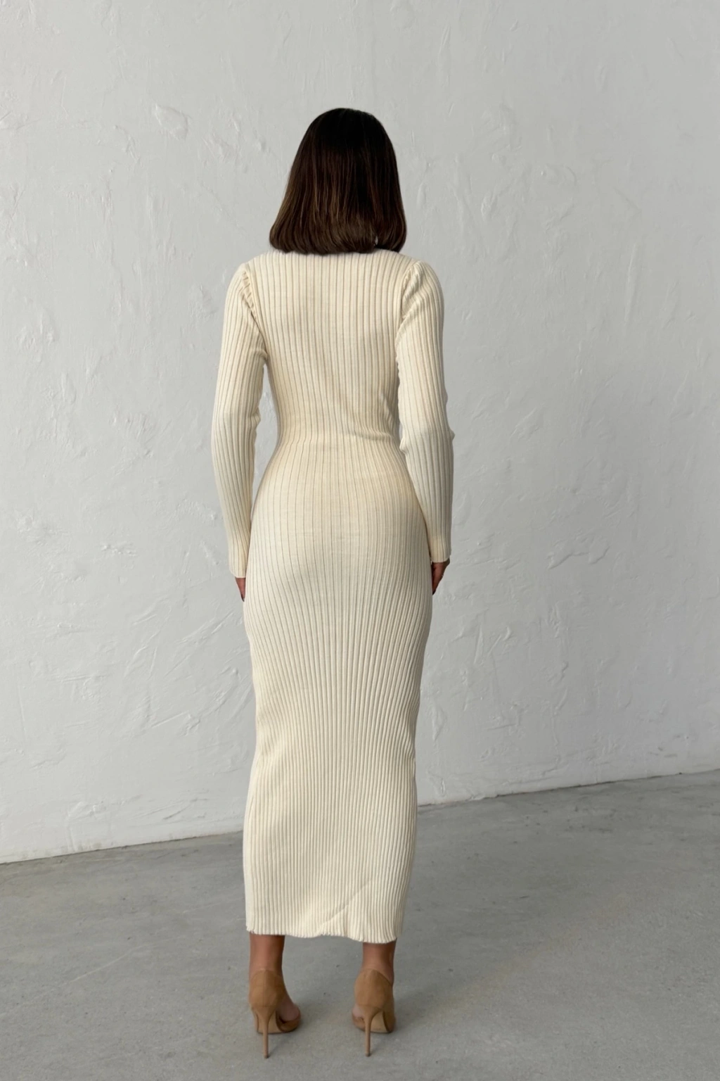 Kadın Bej Uzun kol Şık Zarif Midi Boy Triko Elbise