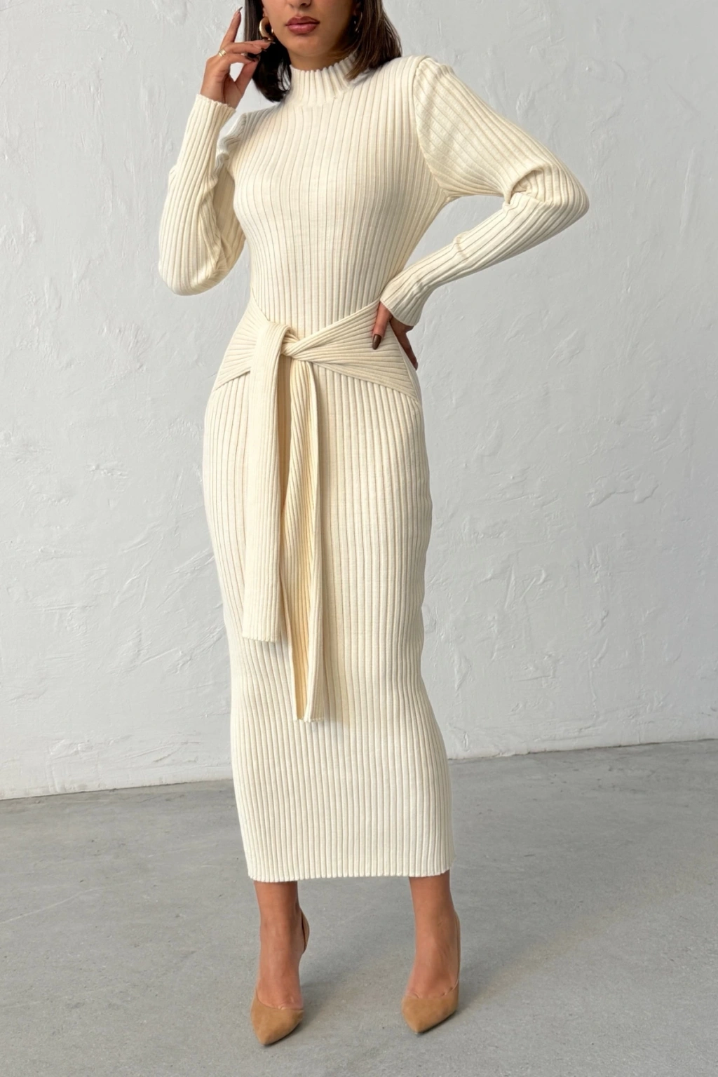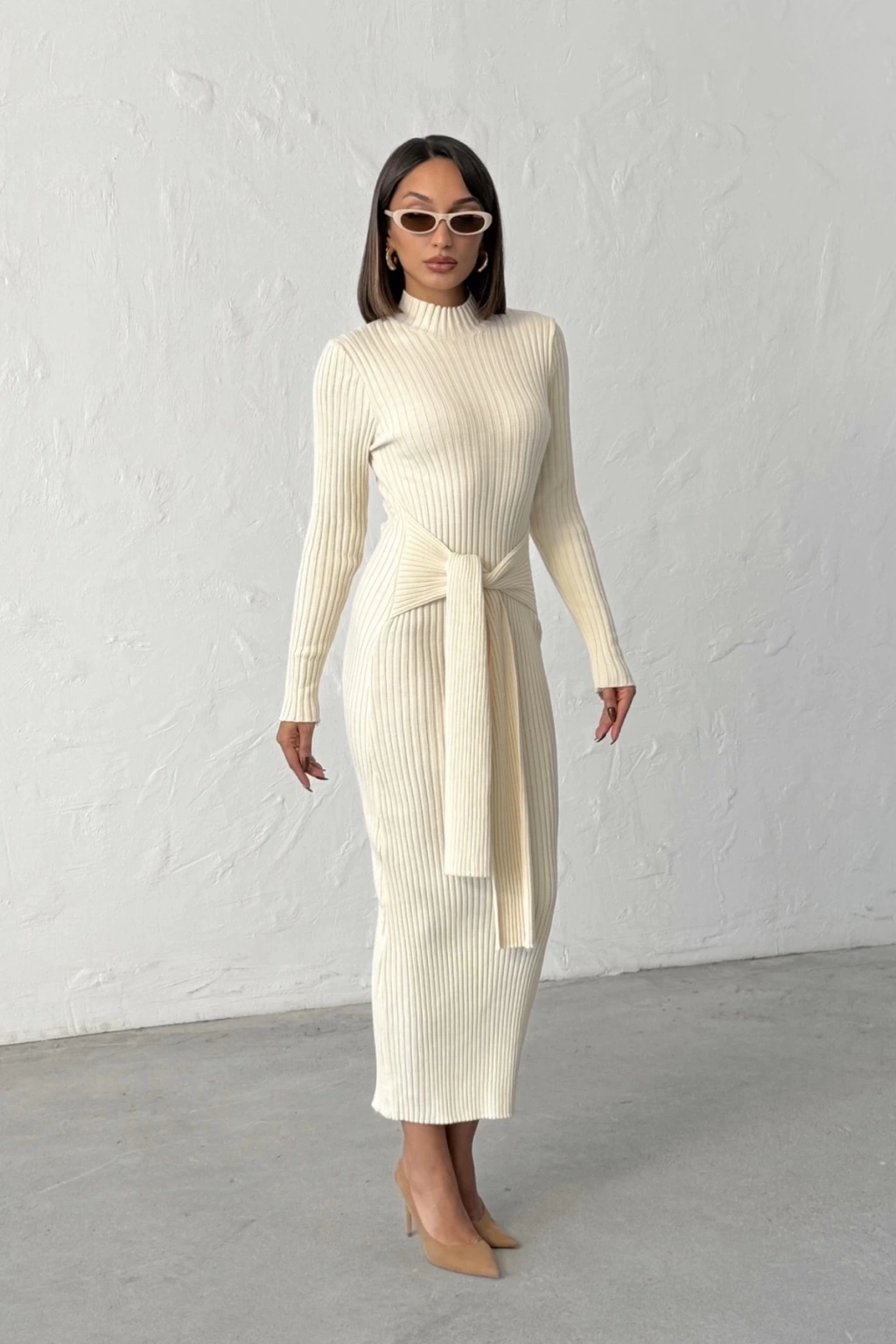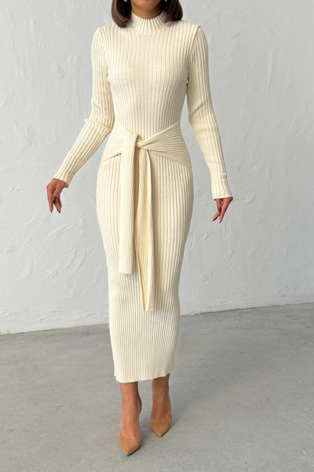 Kadın Bej Şık Bağlama Detaylı Midi Triko Elbise
