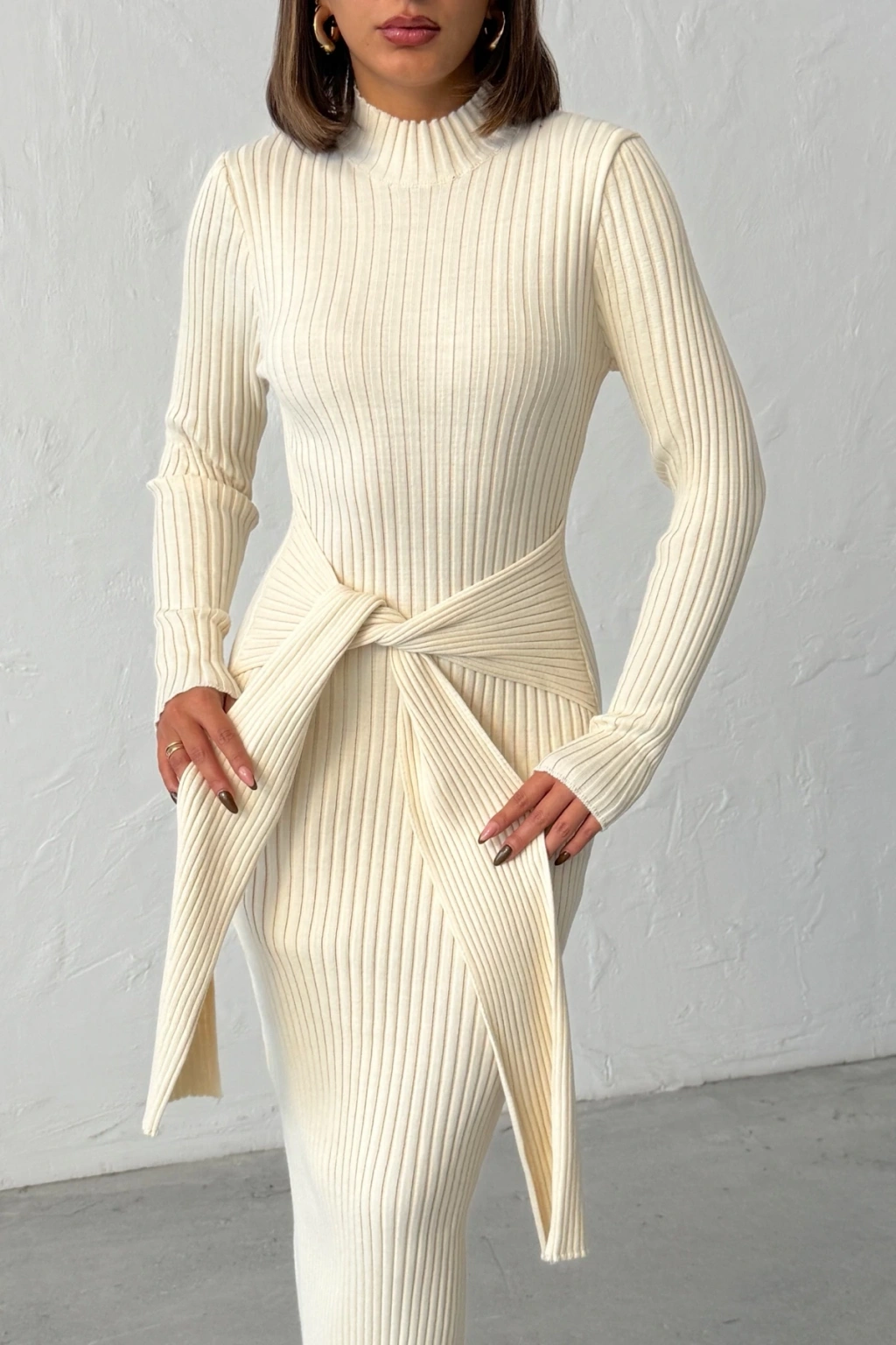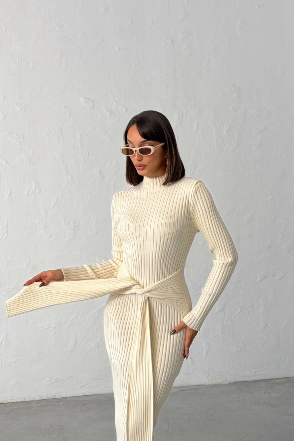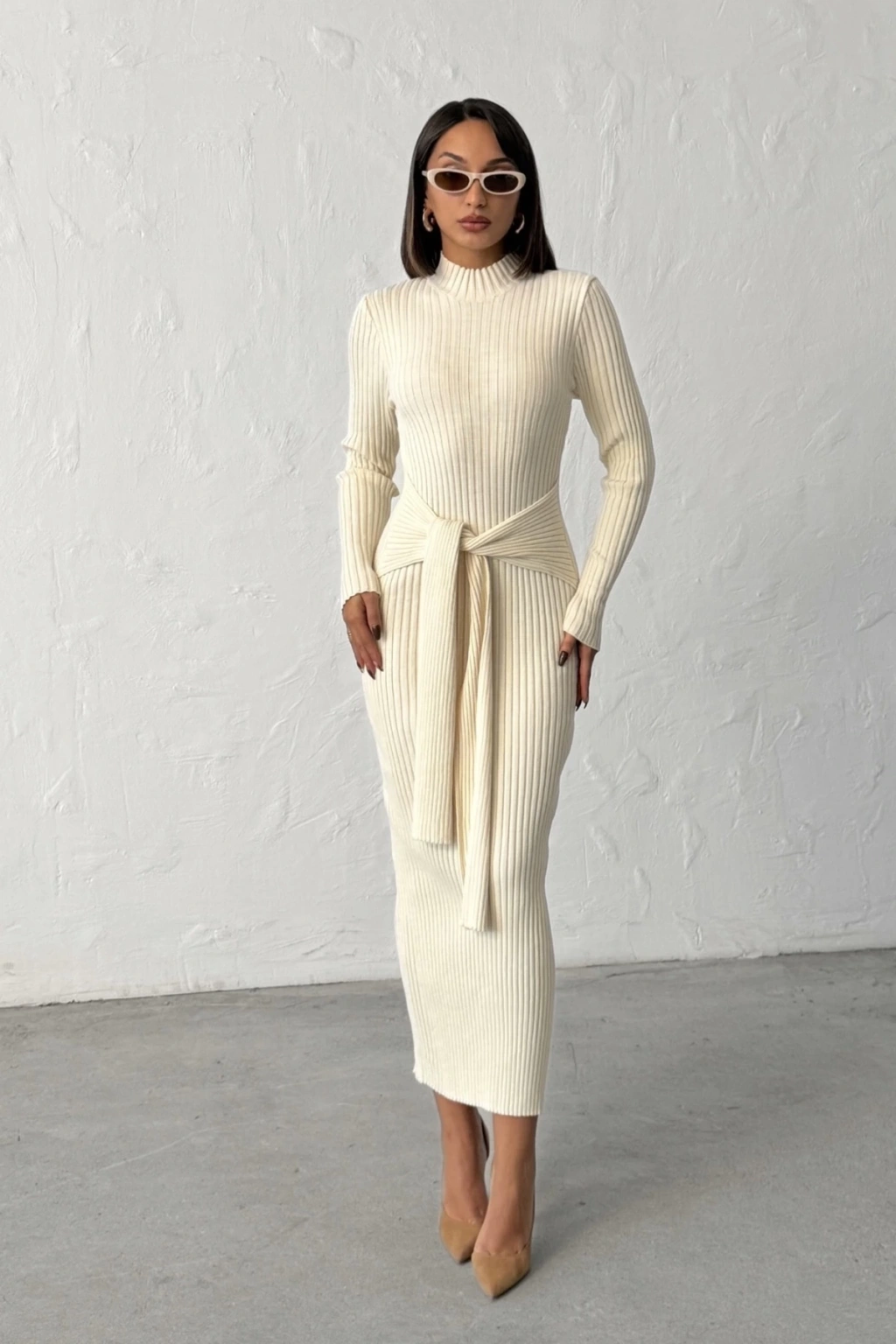 Kadın Bej Şık Bağlama Detaylı Midi Triko Elbise