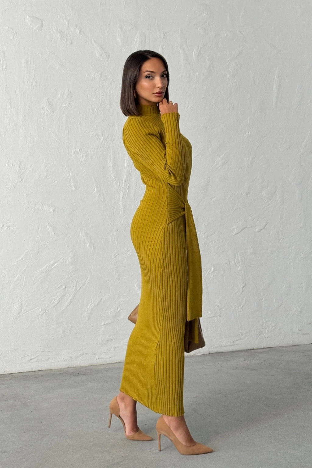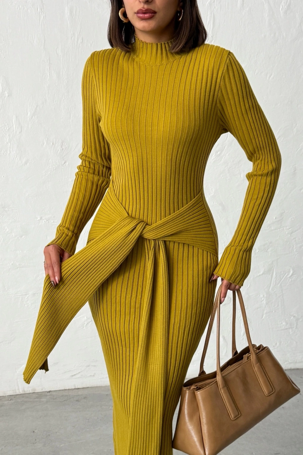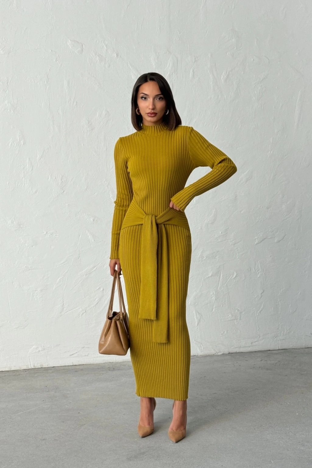 Kadın Hardal Sarısı Şık Bağlama Detaylı Midi Triko Elbise