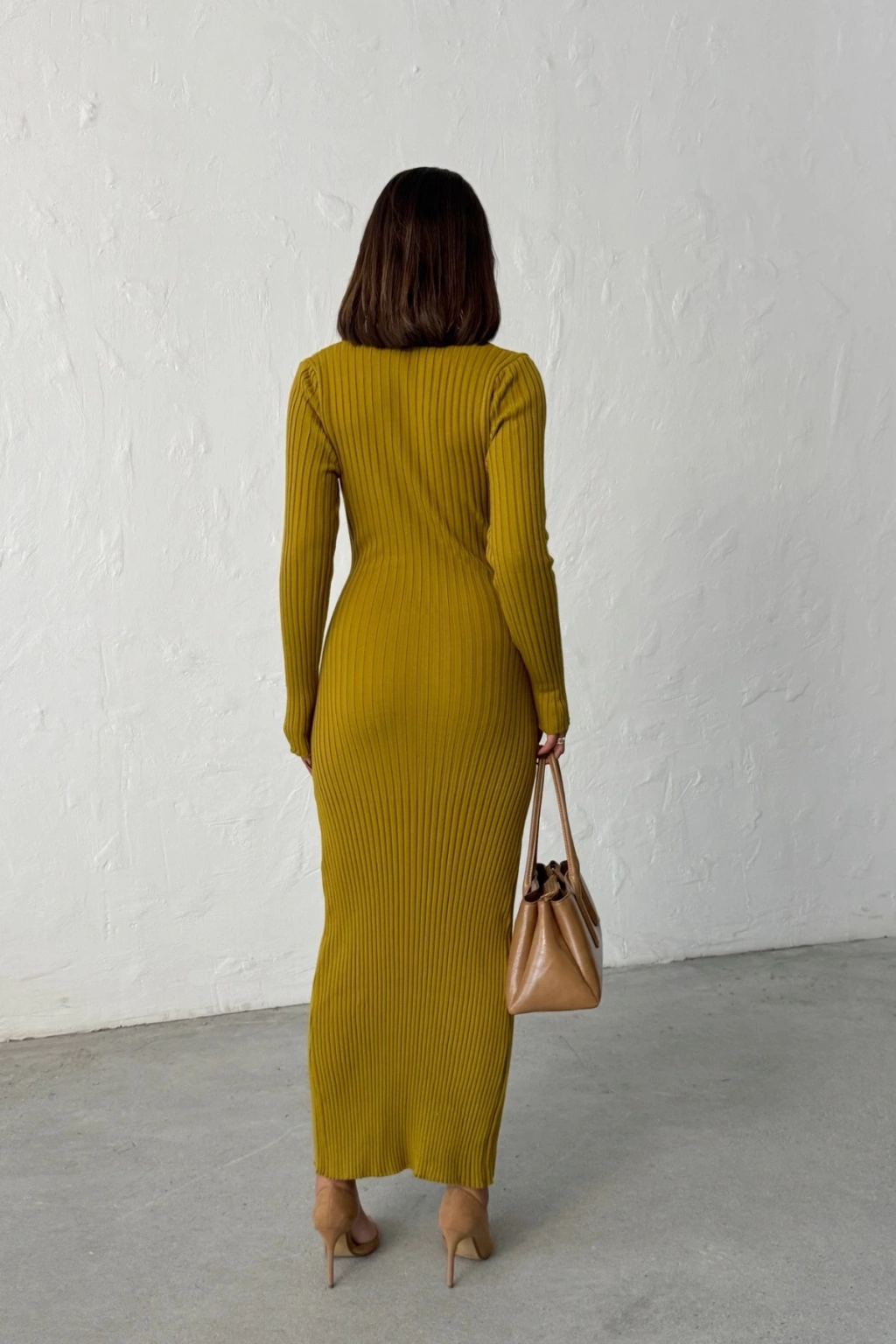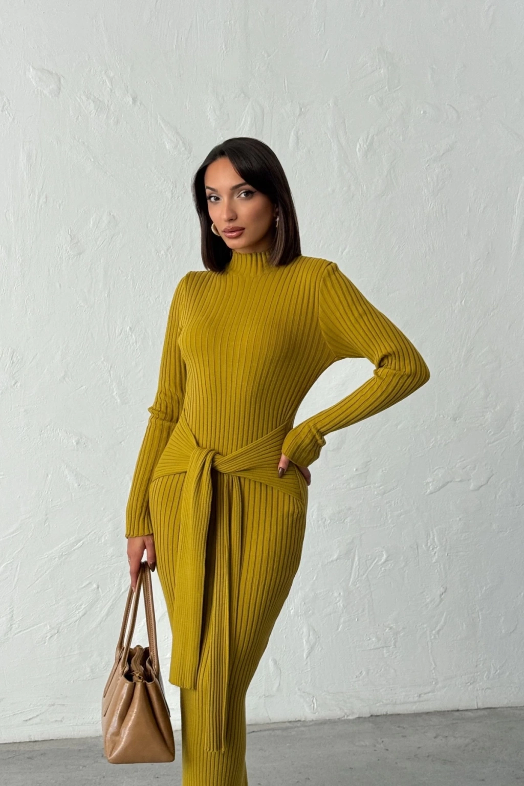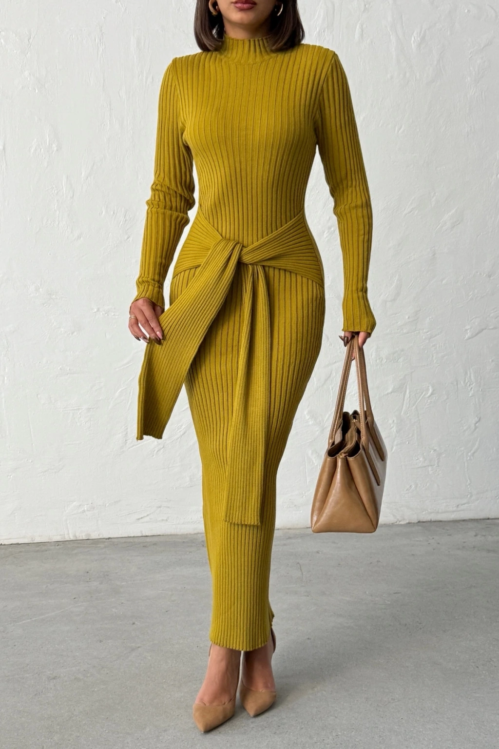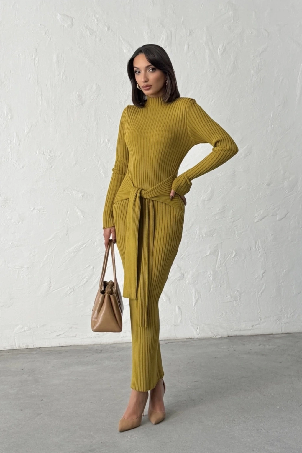 Kadın Hardal Sarısı Şık Bağlama Detaylı Midi Triko Elbise