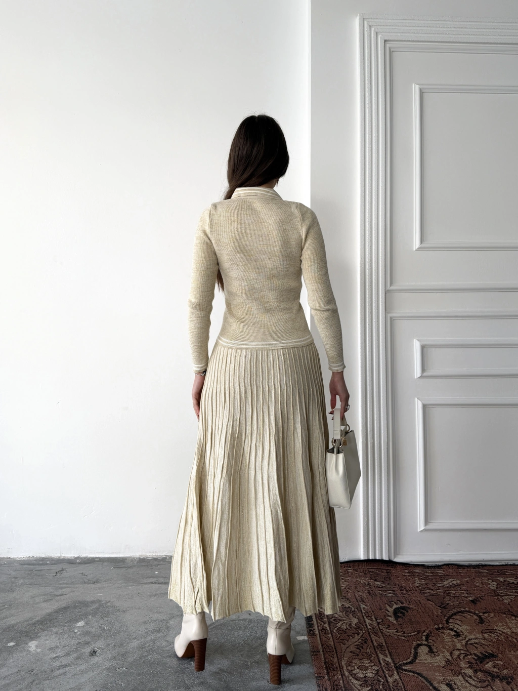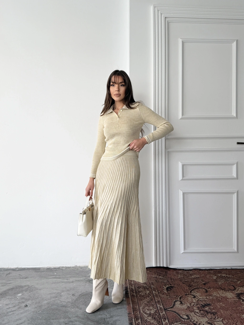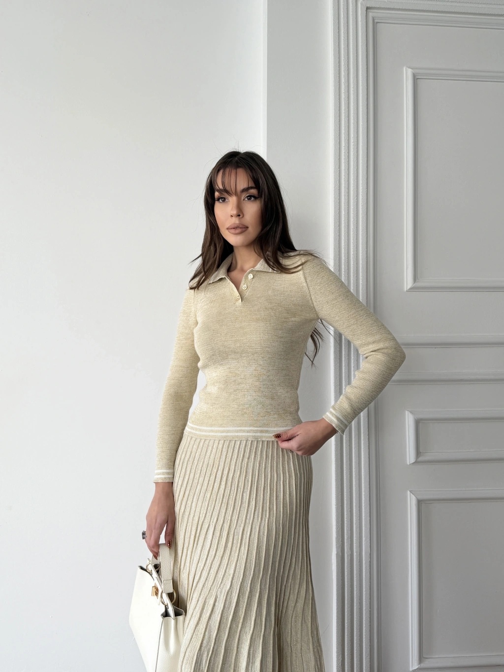 Kadın Bej Simli Şık Şeritli Bluz Etek Alt Üst İkili Premium Triko Takım