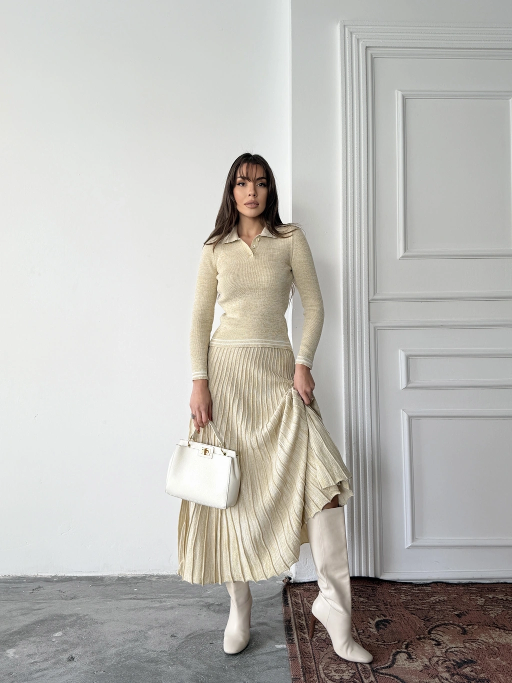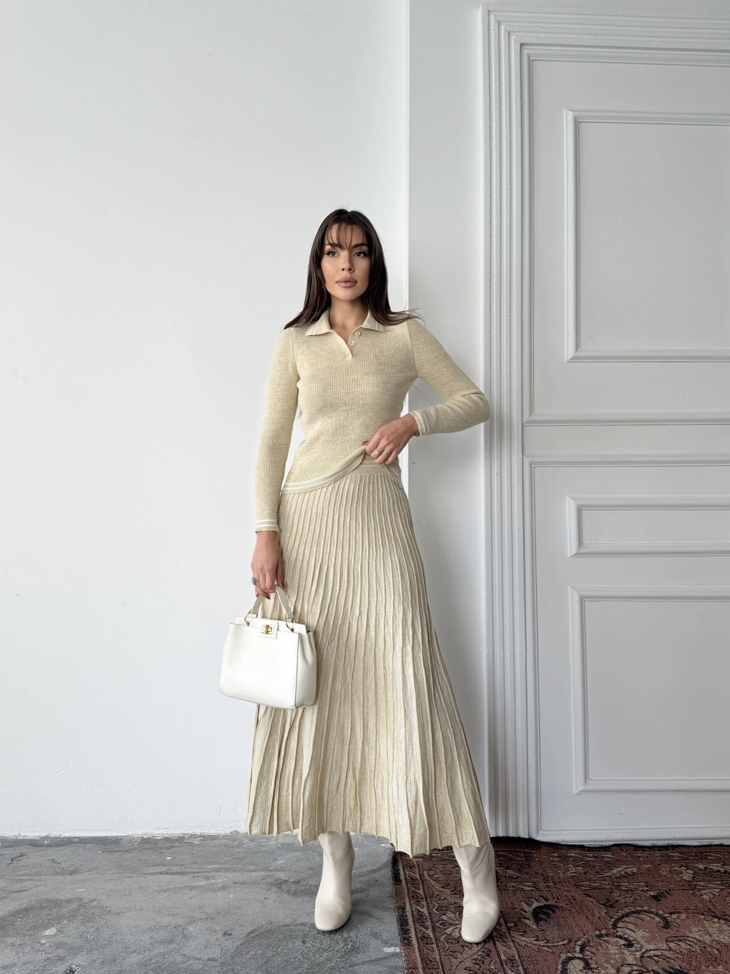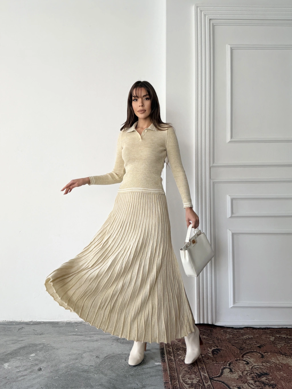 Kadın Bej Simli Şık Şeritli Bluz Etek Alt Üst İkili Premium Triko Takım