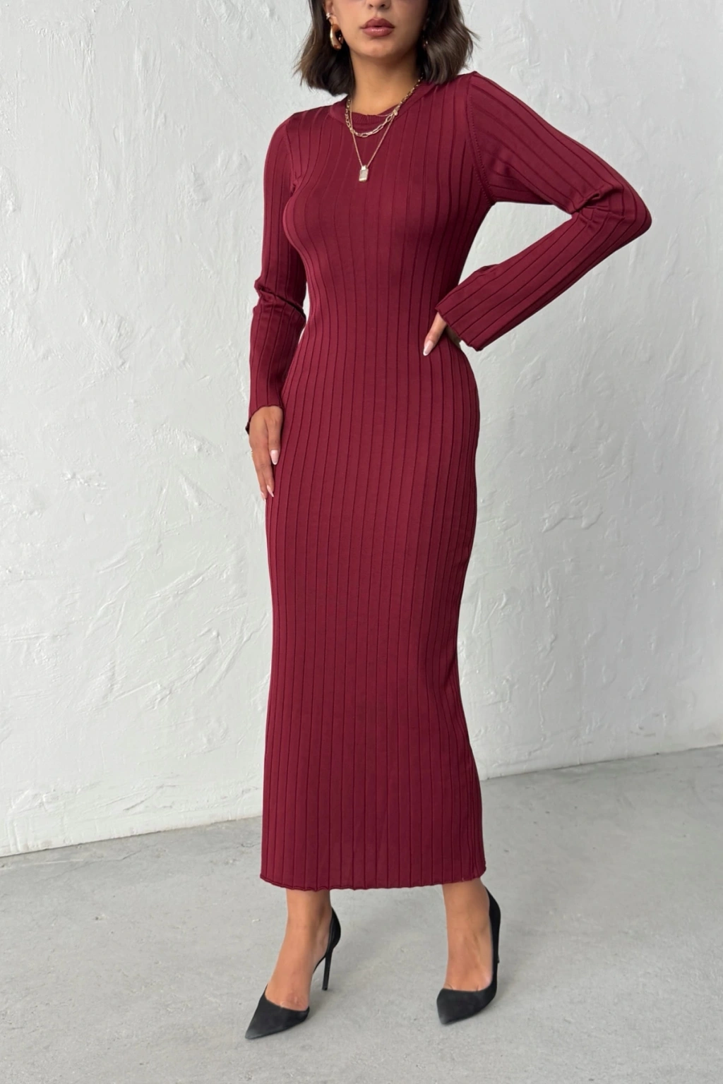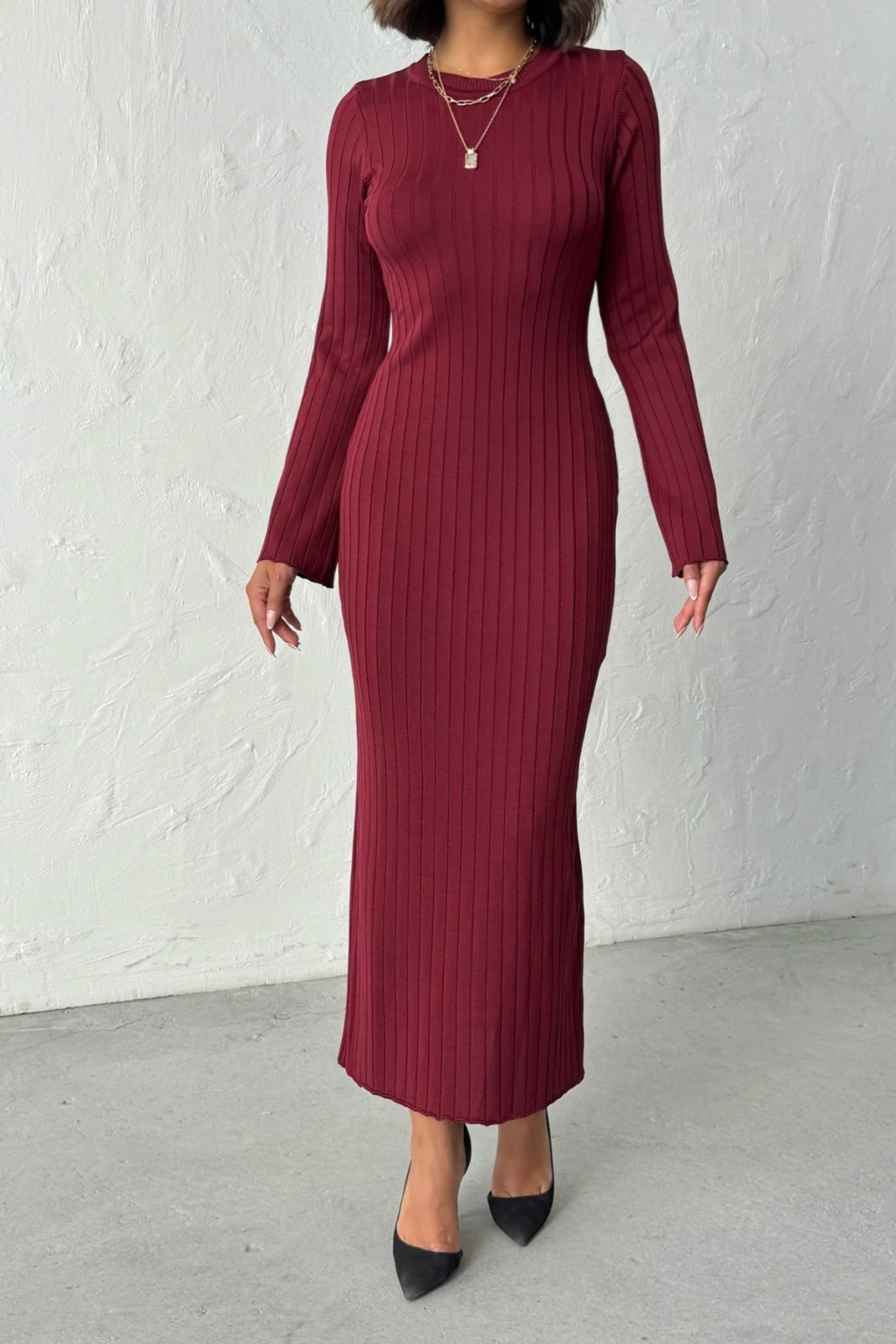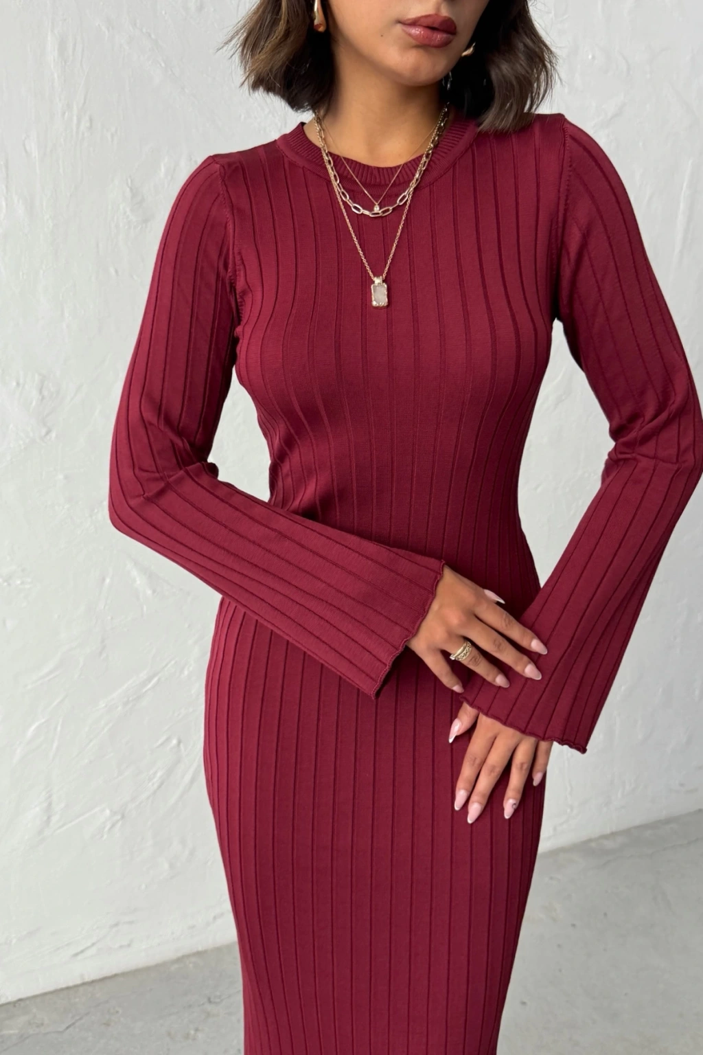 Kadın Bordo Uzun kol Şık Zarif Midi Boy Triko Elbise