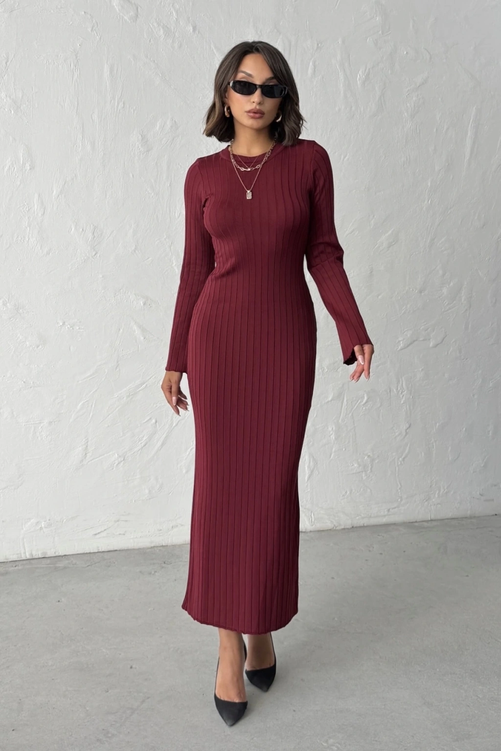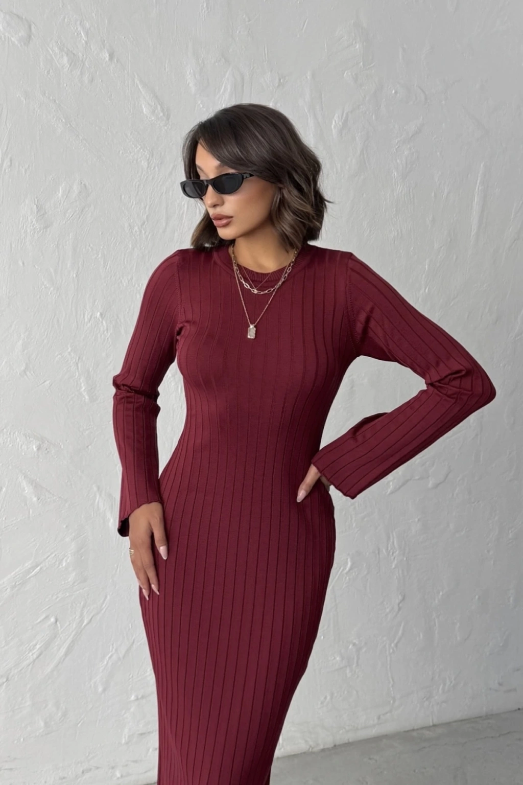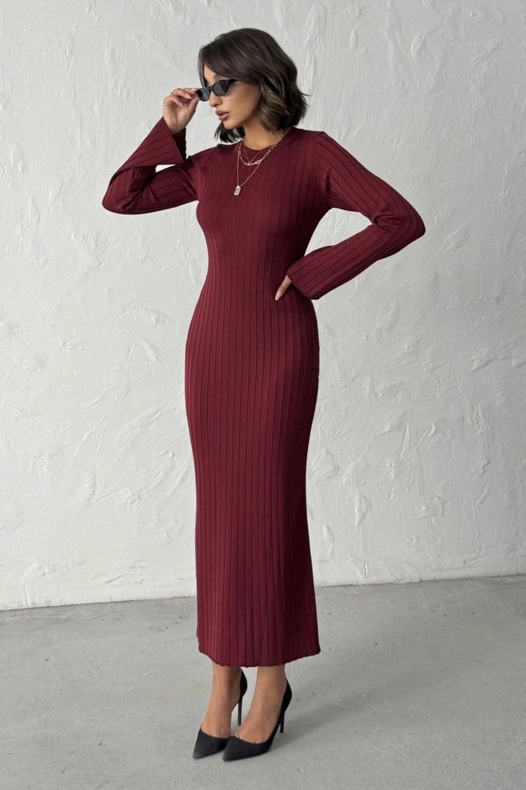 Kadın Bordo Uzun kol Şık Zarif Midi Boy Triko Elbise