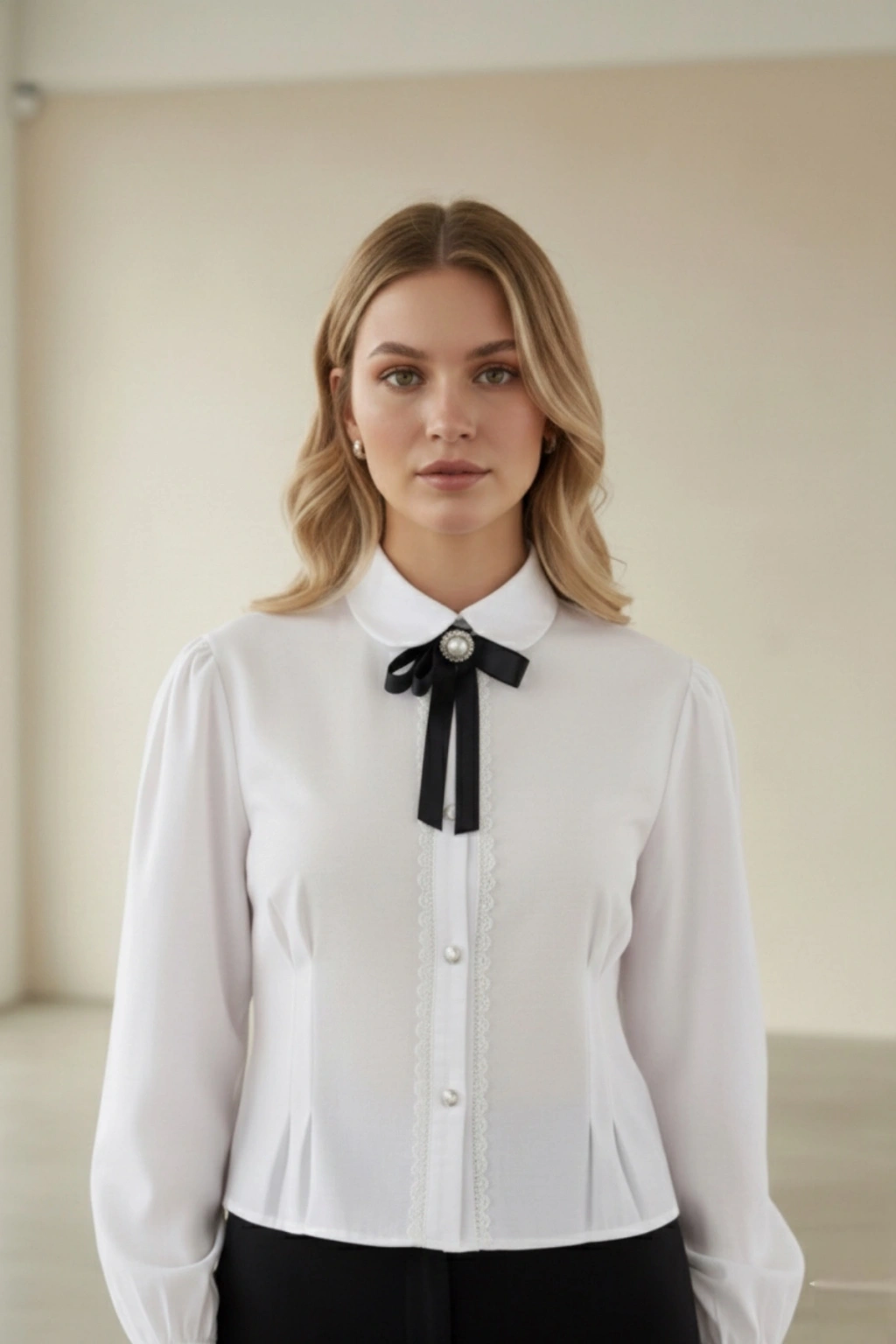 Kadın Beyaz Fiyonk ve Detaylı Şık Gömlek
