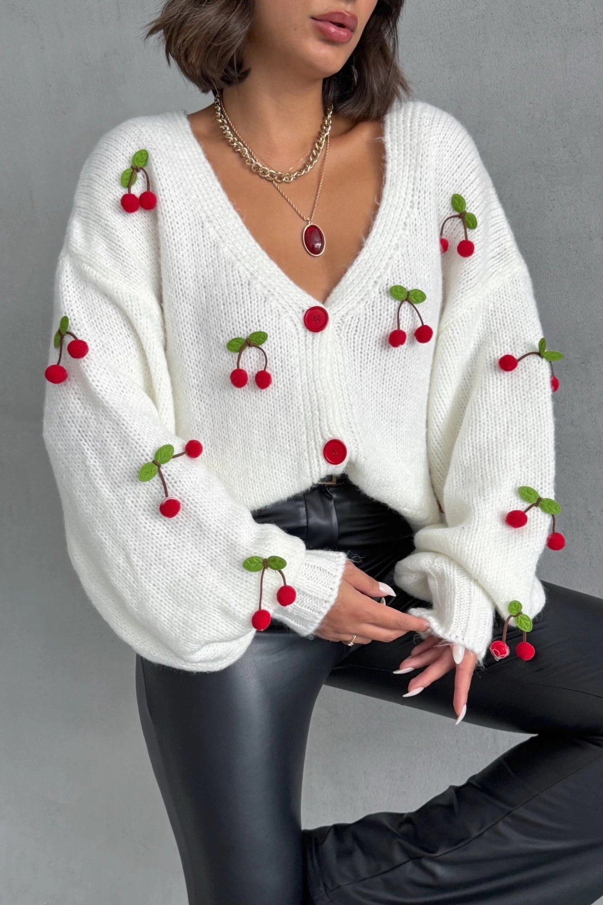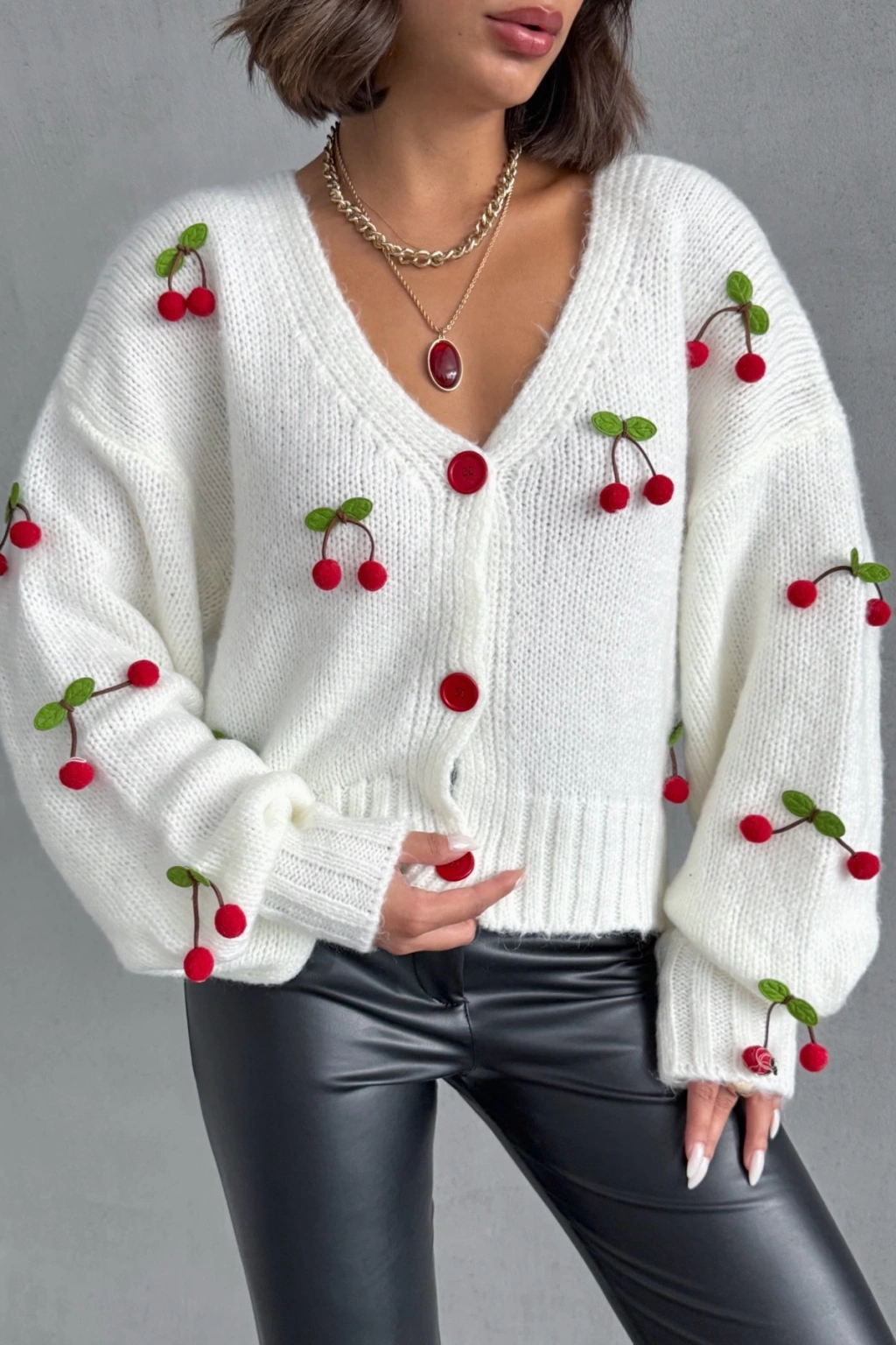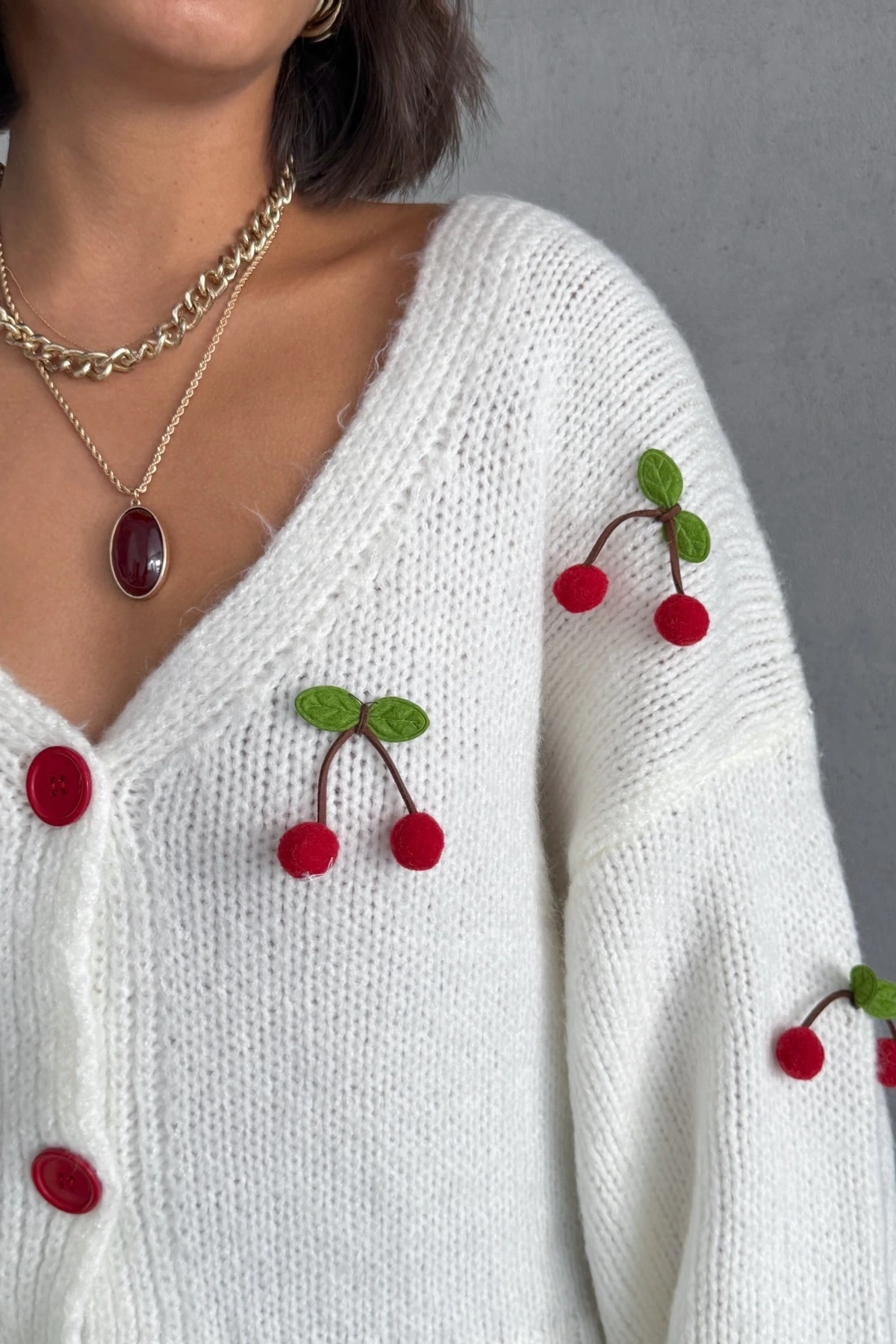 Gardırobunuza neşe katacak bu özel tasarım triko hırka, zarif dokusu ve sevimli kiraz aksesuarlarıyla tarzınıza eğlenceli bir dokunuş getiriyor. Yumuşacık triko kumaşı sayesinde hem sonbahar hem ilkbahar aylarında konforlu bir kullanım sunarken, detaylardaki özen sizi sıradanlıktan uzaklaştırıyor.