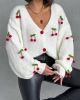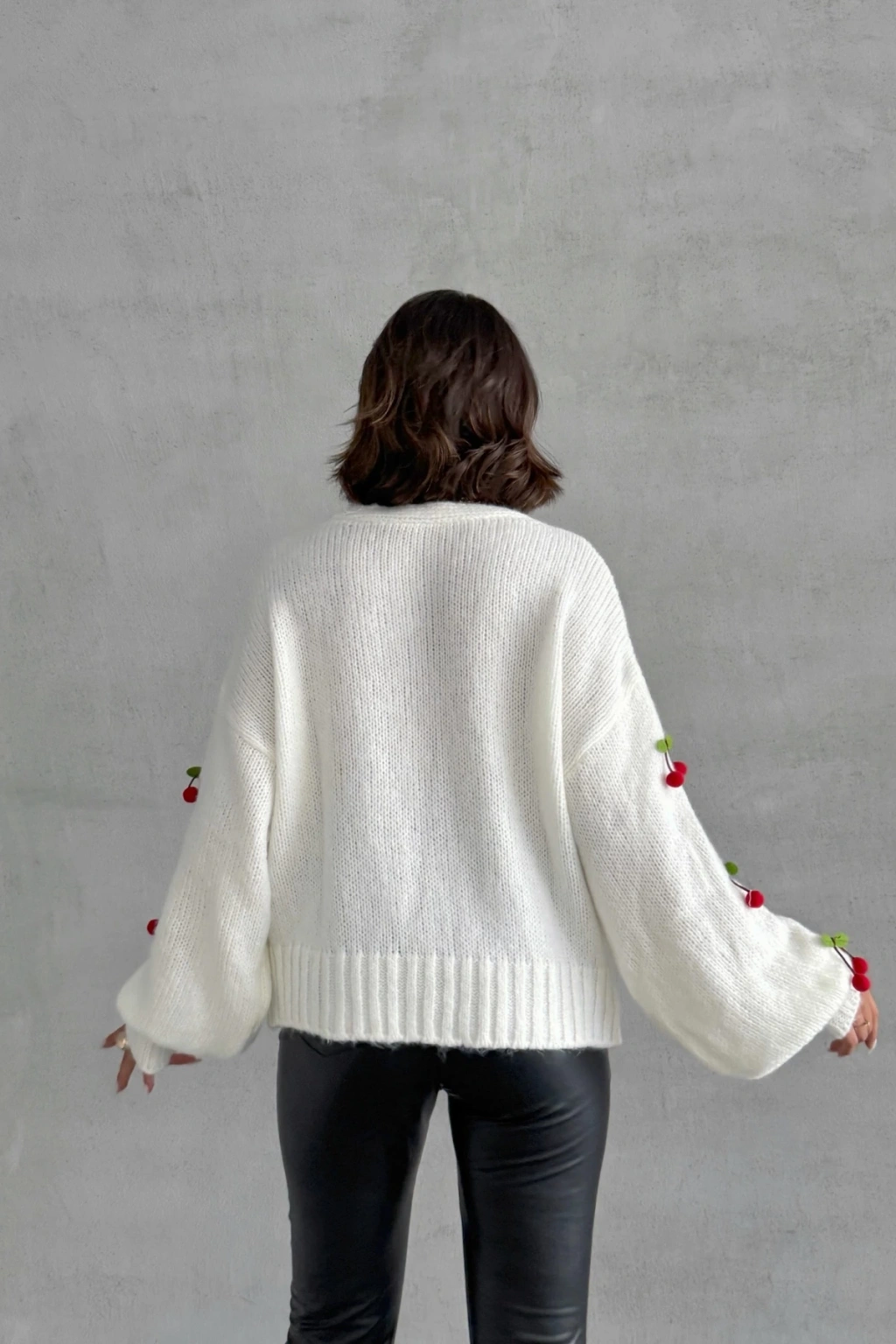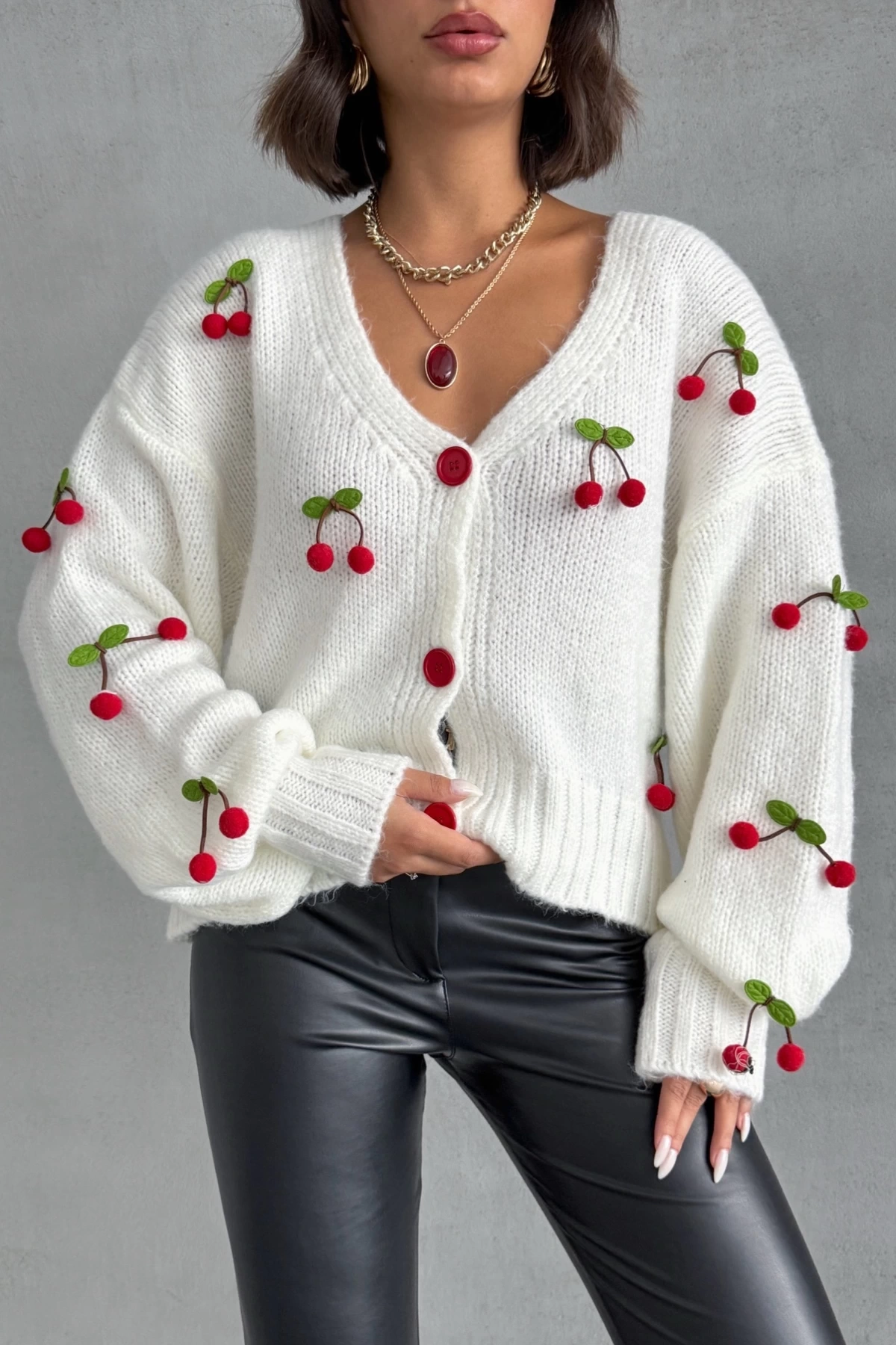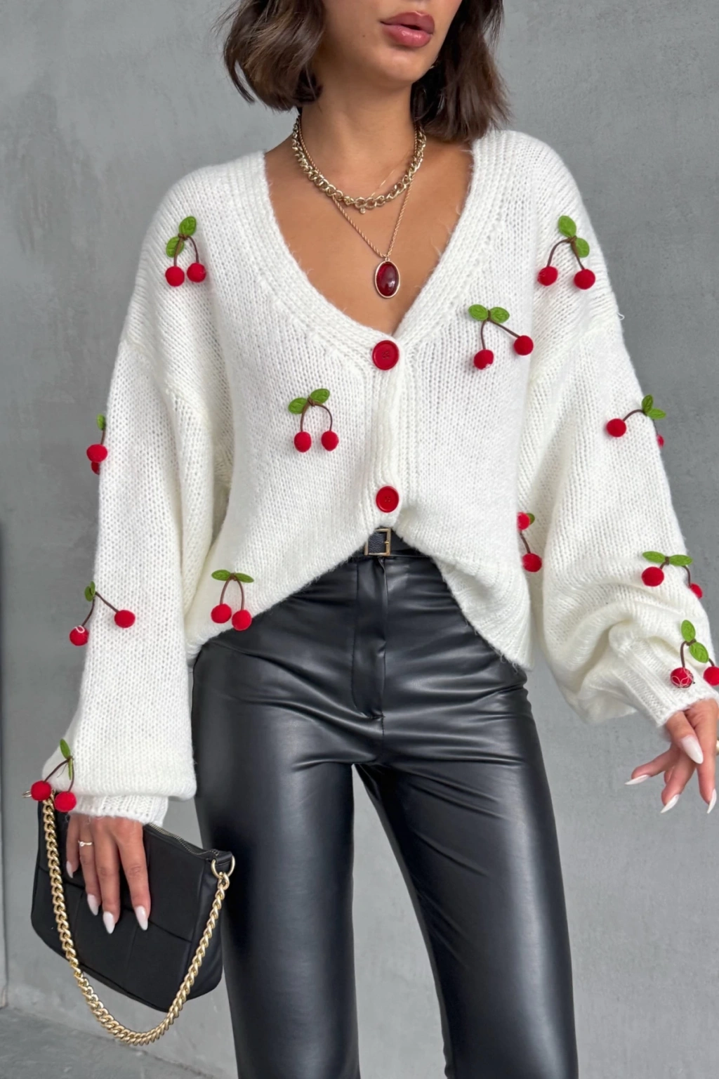 Gardırobunuza neşe katacak bu özel tasarım triko hırka, zarif dokusu ve sevimli kiraz aksesuarlarıyla tarzınıza eğlenceli bir dokunuş getiriyor. Yumuşacık triko kumaşı sayesinde hem sonbahar hem ilkbahar aylarında konforlu bir kullanım sunarken, detaylardaki özen sizi sıradanlıktan uzaklaştırıyor.