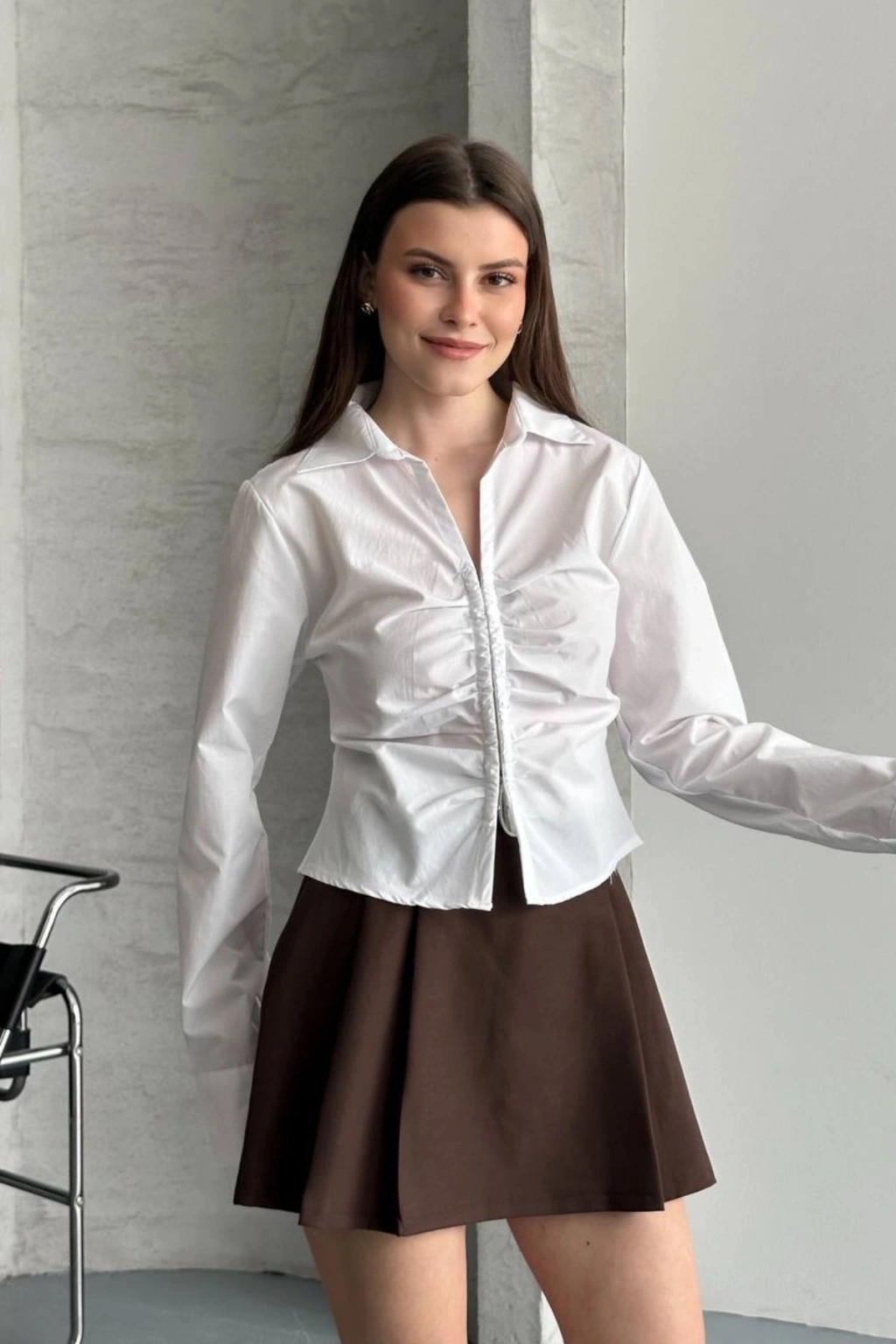 Kadın Beyaz Önü Büzgülü Bel Oturtmalı Uzun Kollu Şık Gömlek