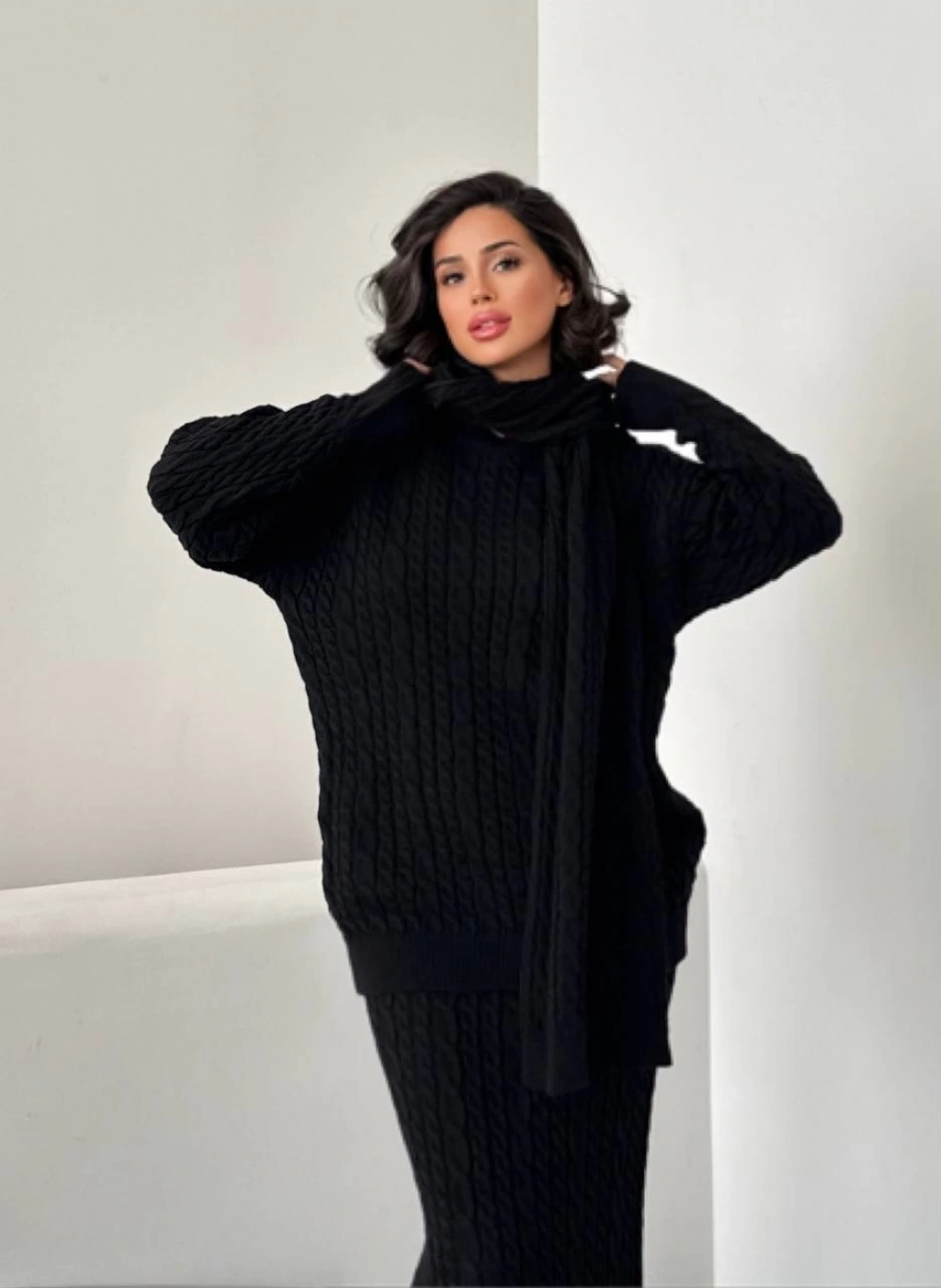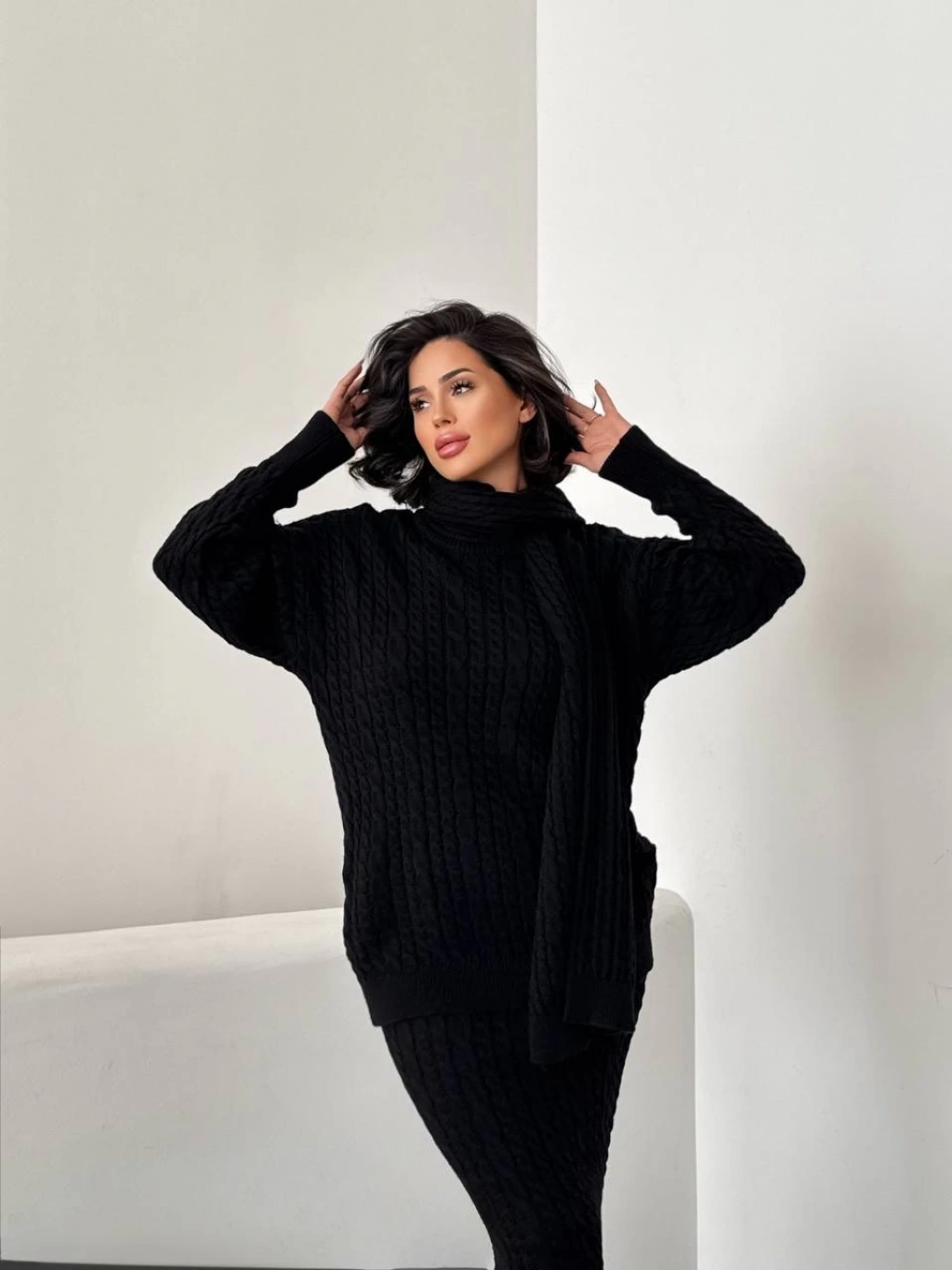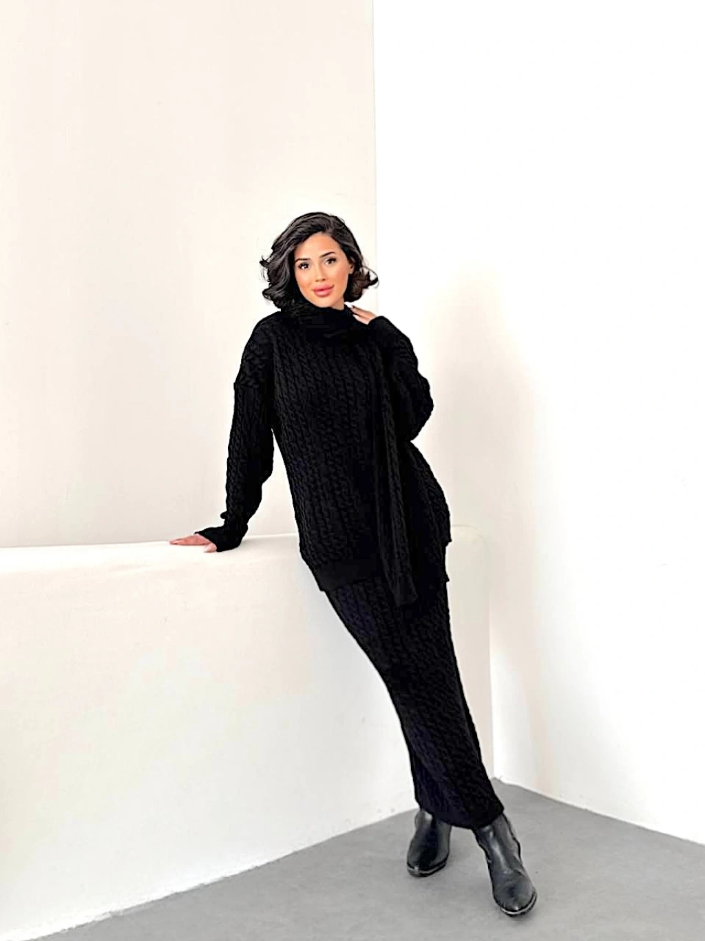Kadın Siyah Atkılı Saç Örgülü Etek Kazak Atkı 3'lü Takım