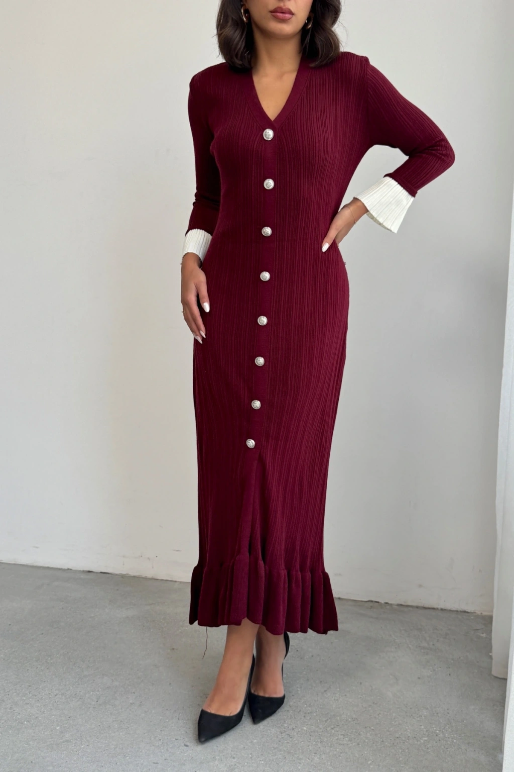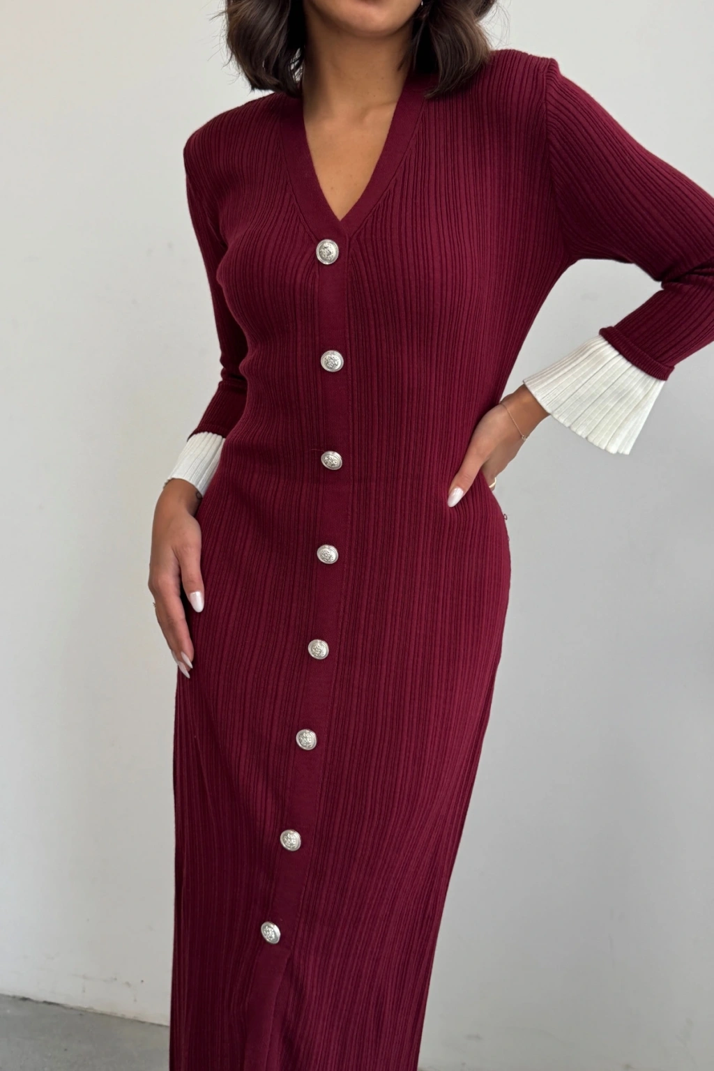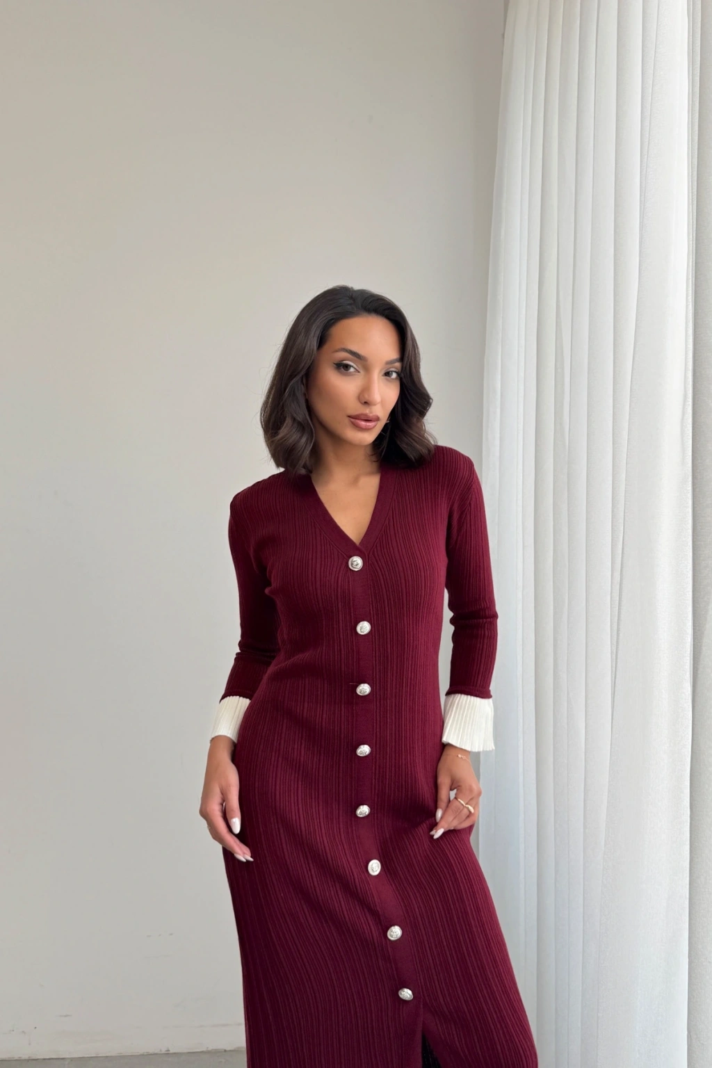 Kadın Bordo Şık Bilek Boy Kol Boydan Düğmeli Uzun Triko Elbise