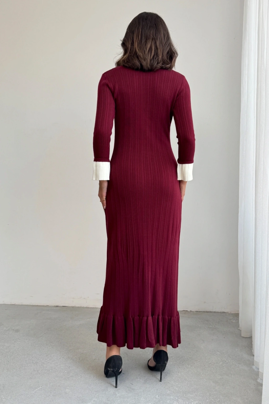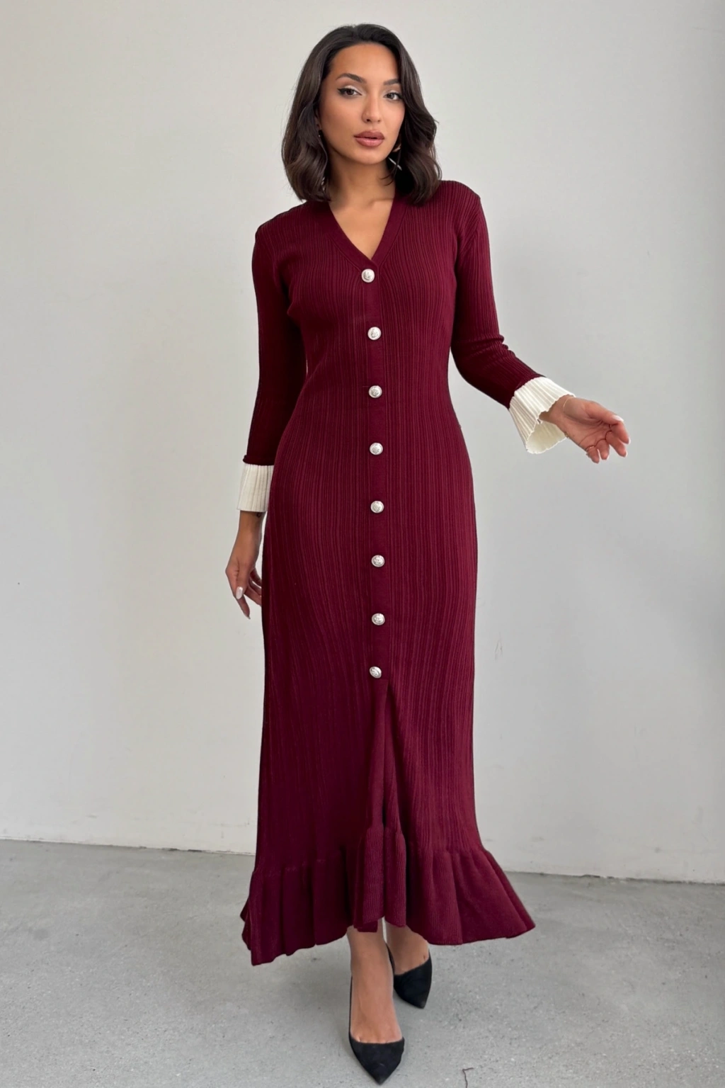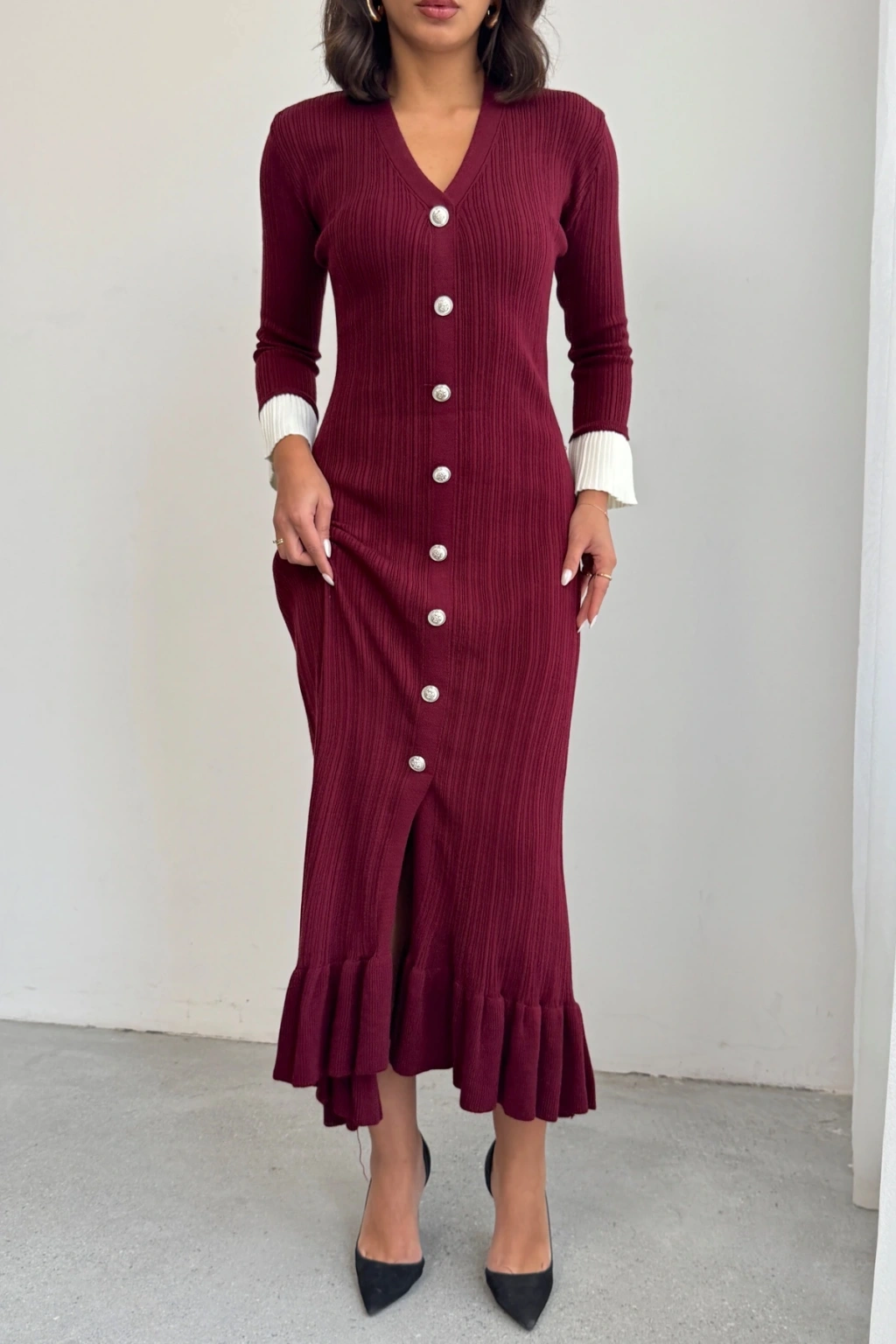 Kadın Bordo Şık Bilek Boy Kol Boydan Düğmeli Uzun Triko Elbise