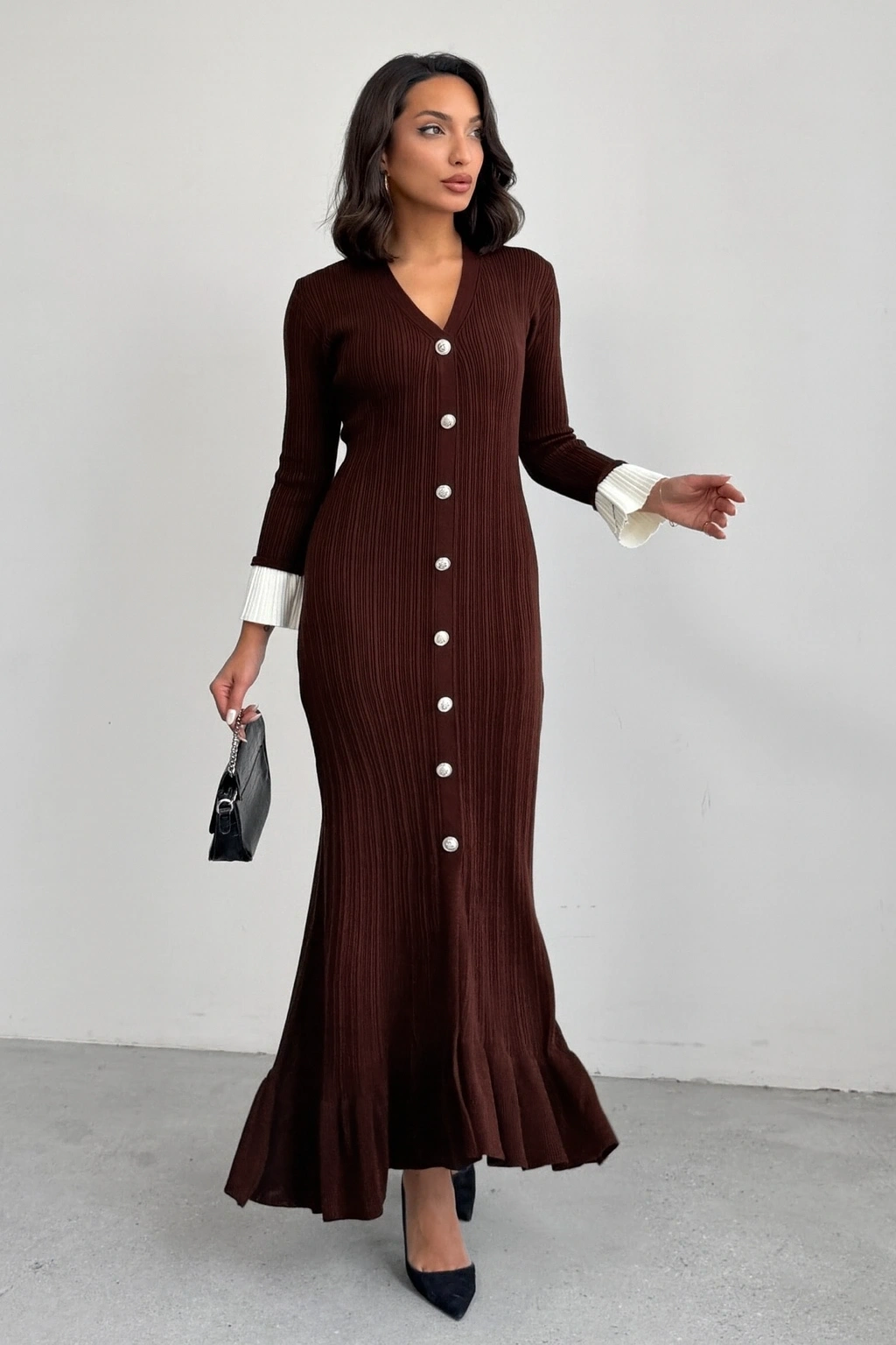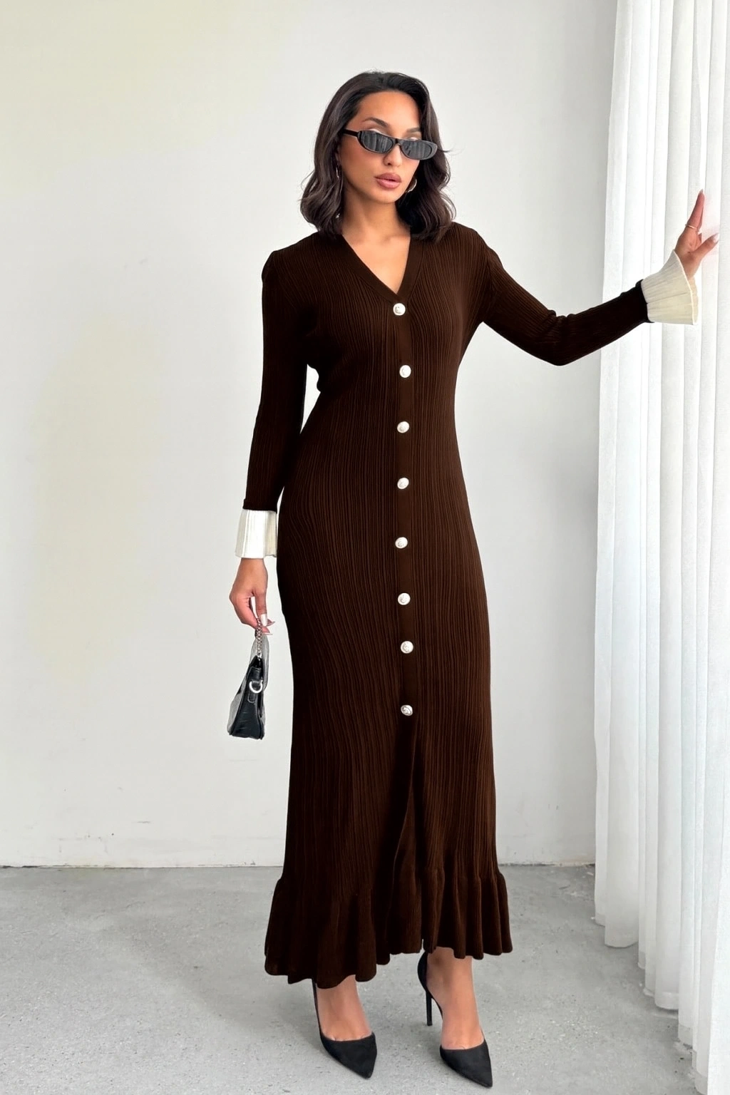 Kadın Kahverengi Kol Düğme ve Fırfır Detaylı Şık Uzun Triko Elbise (Yeni Renk)