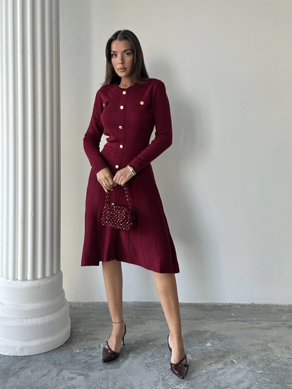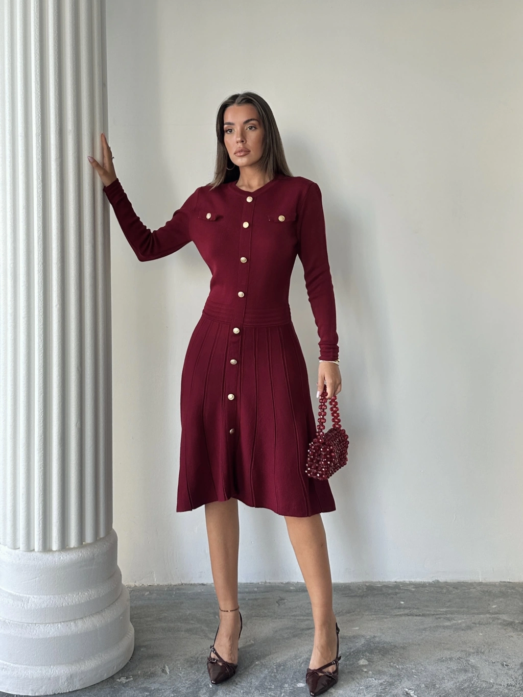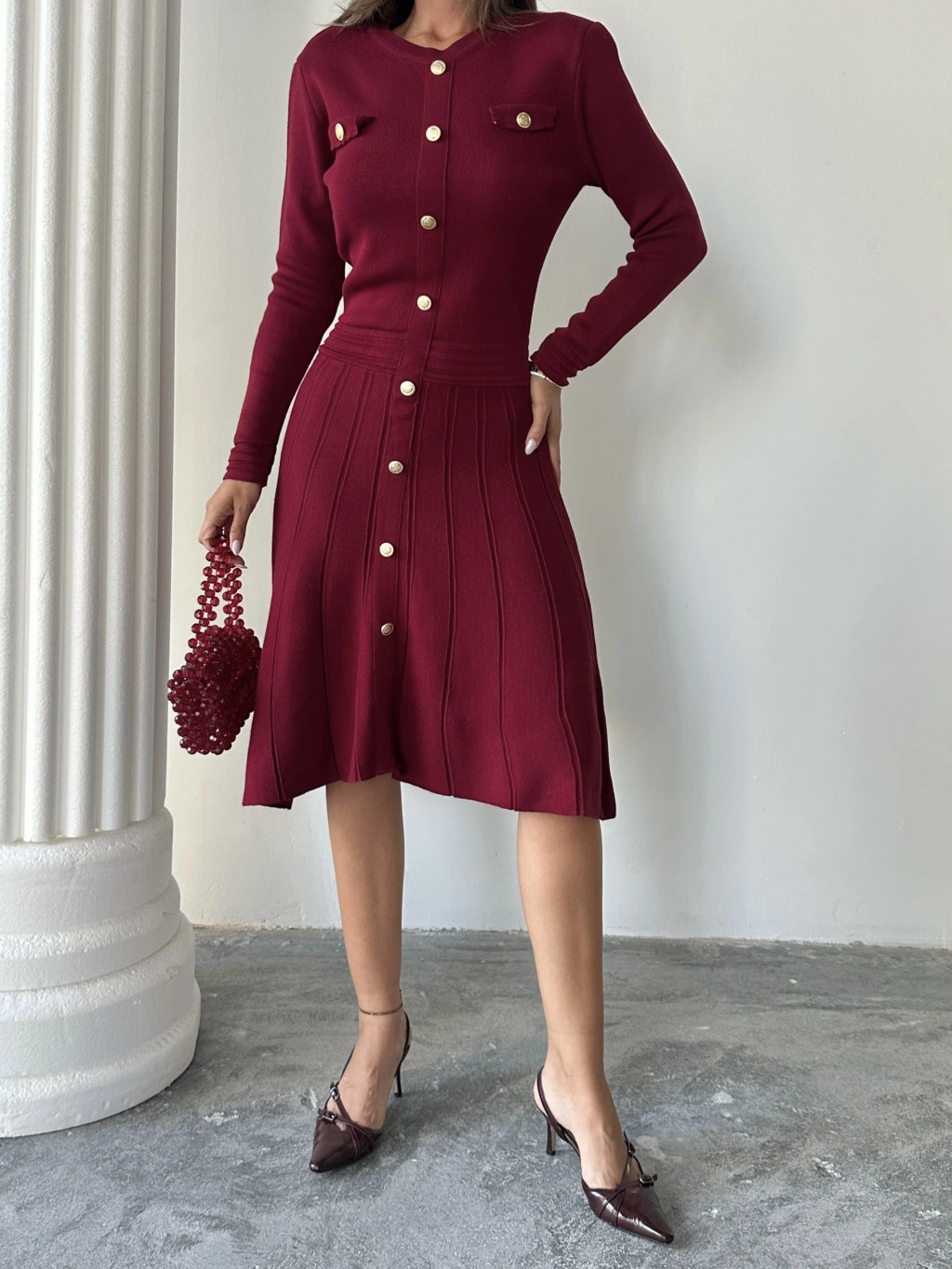 Kadın Bordo Şık Gold Düğme Detaylı Zarif Uzun Kol Triko Elbise