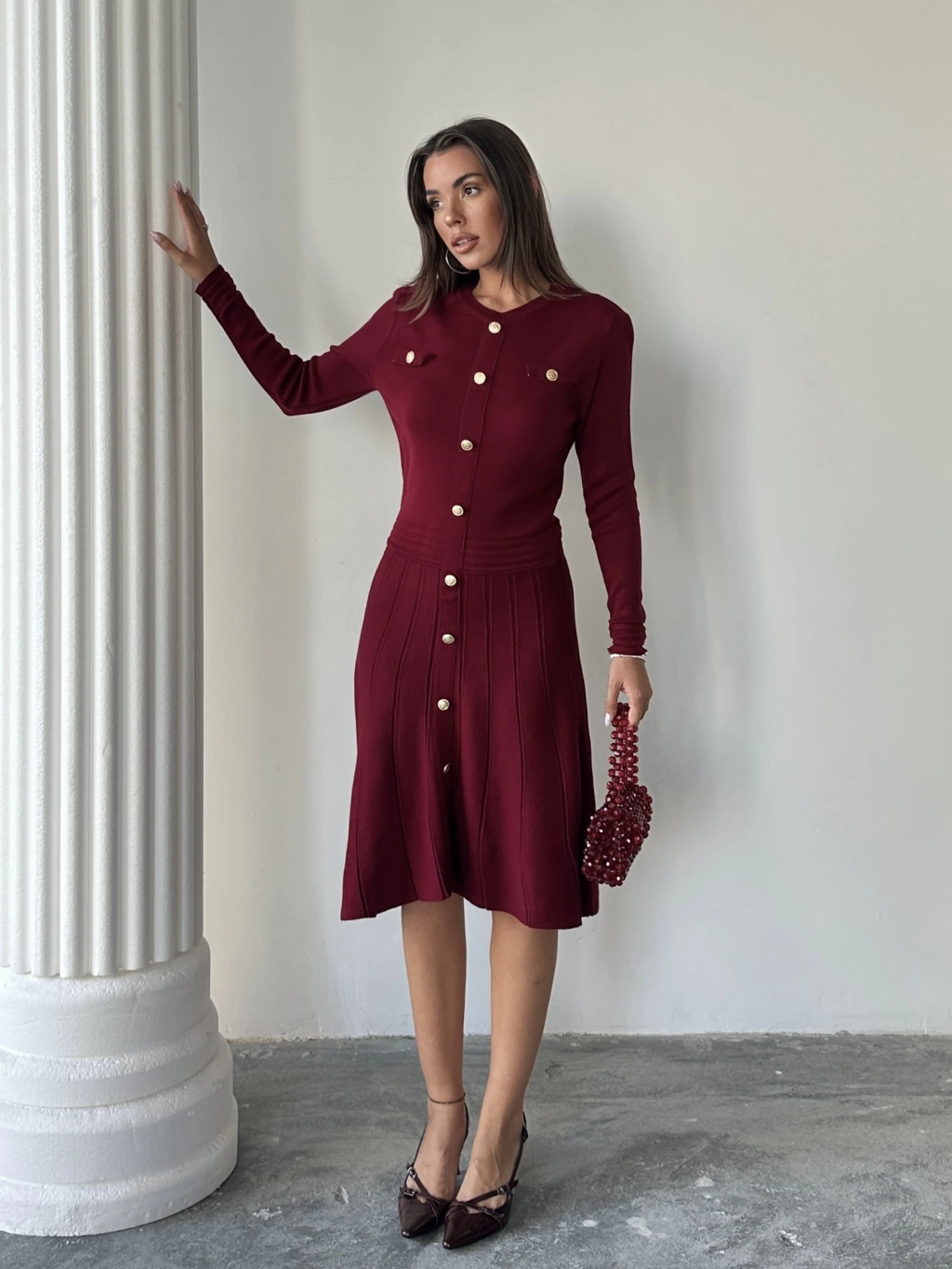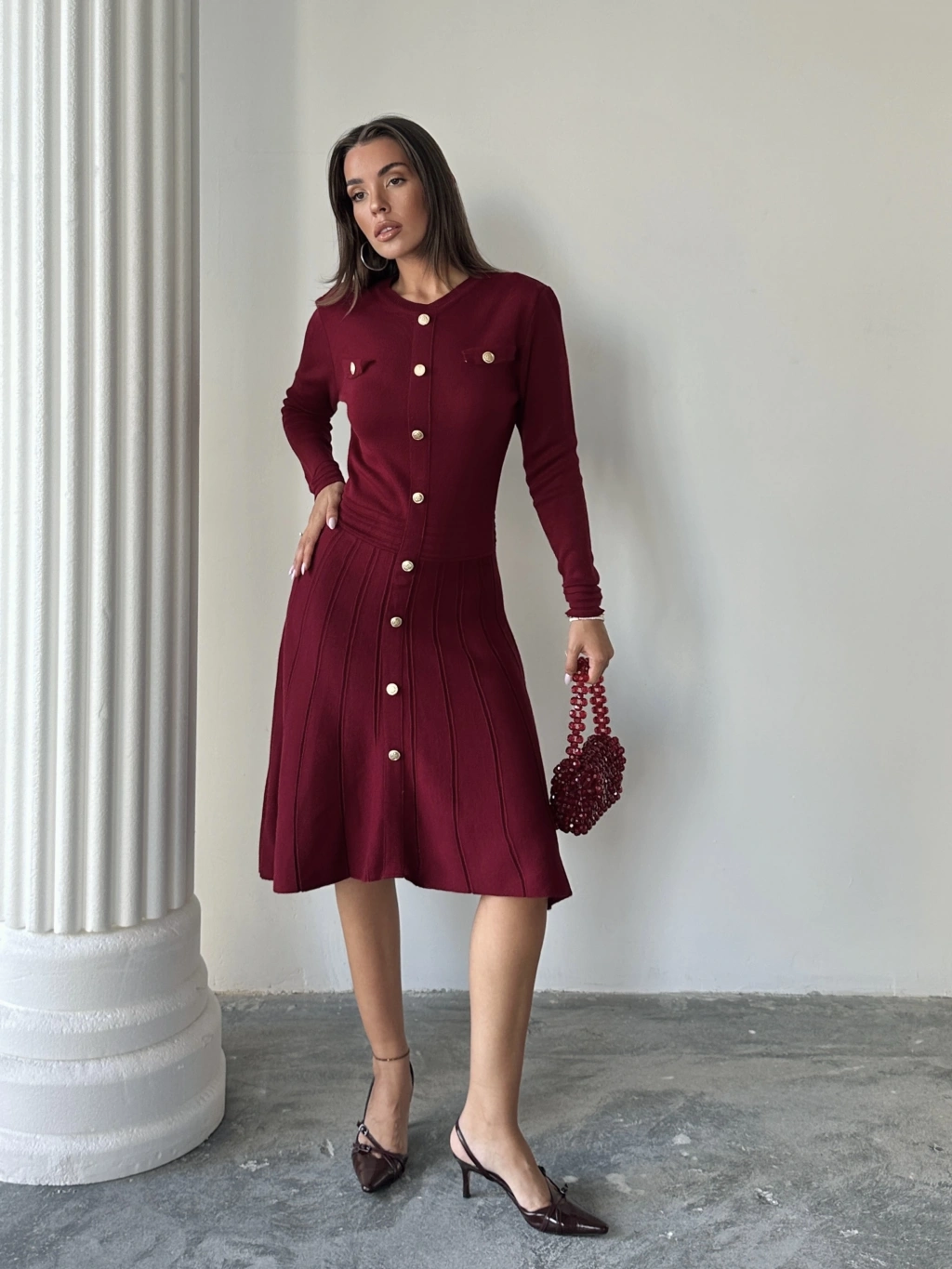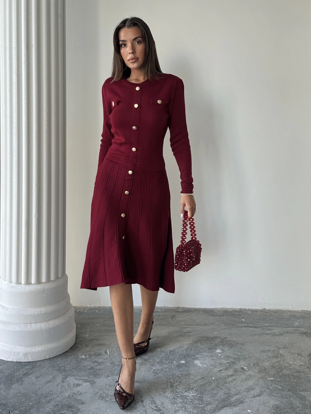 Kadın Bordo Şık Gold Düğme Detaylı Zarif Uzun Kol Triko Elbise