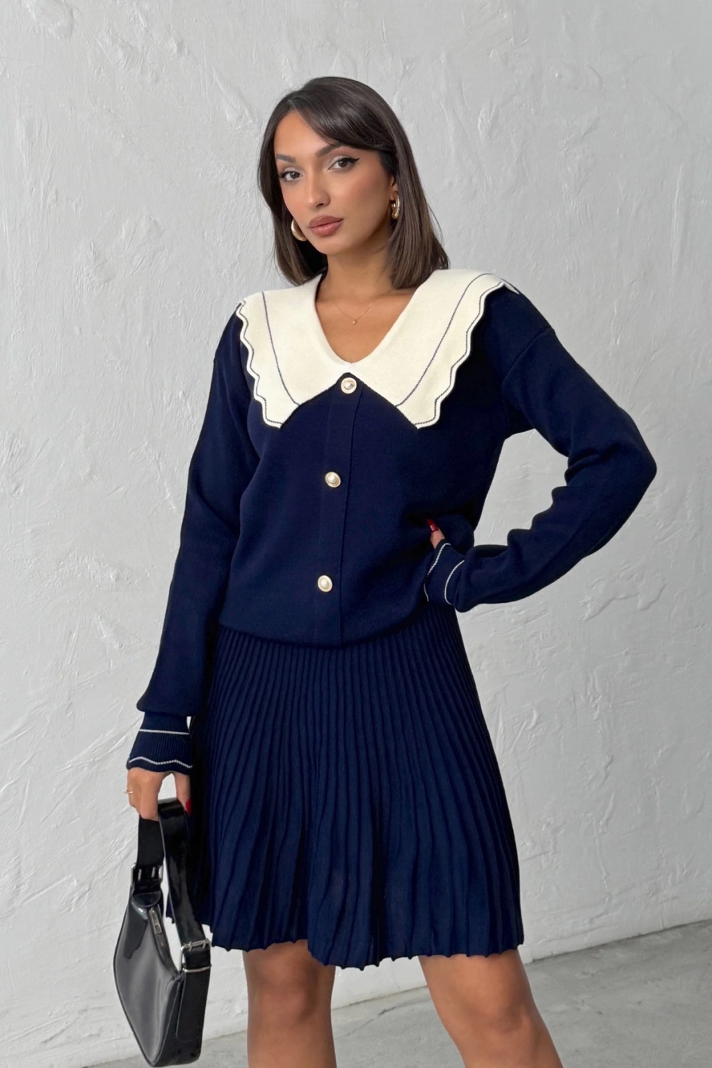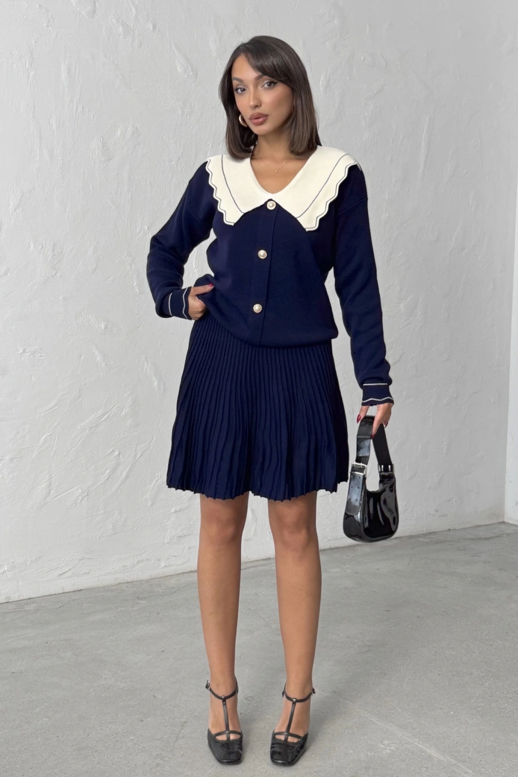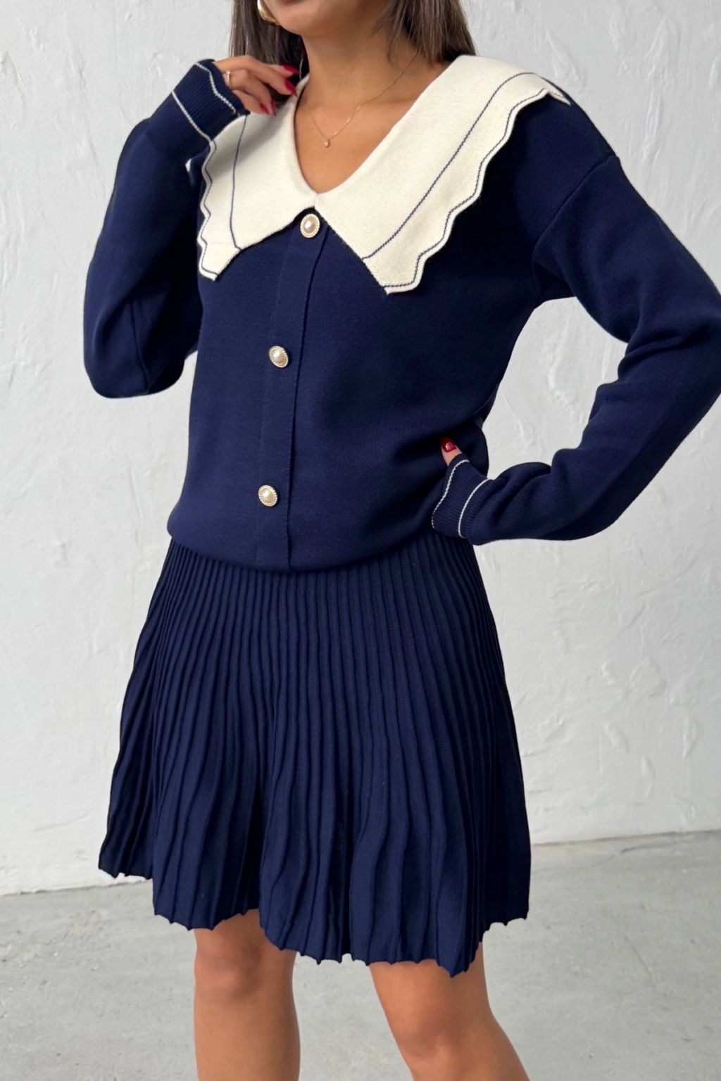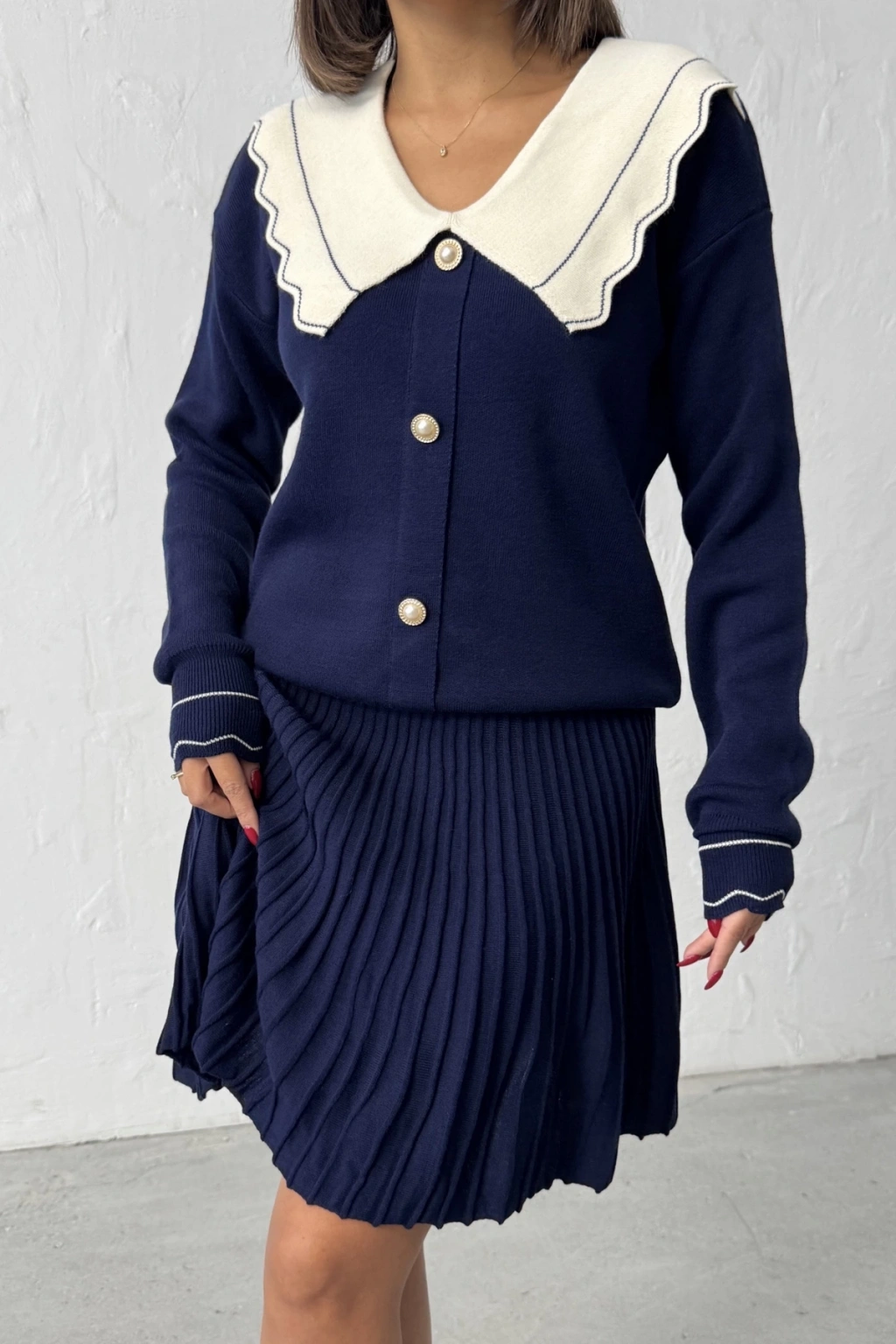 Kadın Lacivert Şık Yaka Detaylı Hırka Bluz Etek Alt Üst İkili Takım (Yeni Renk)