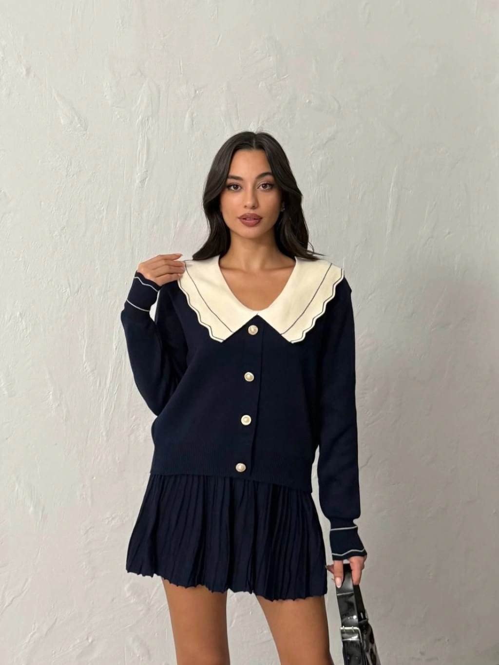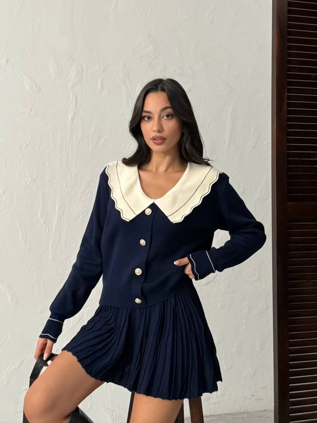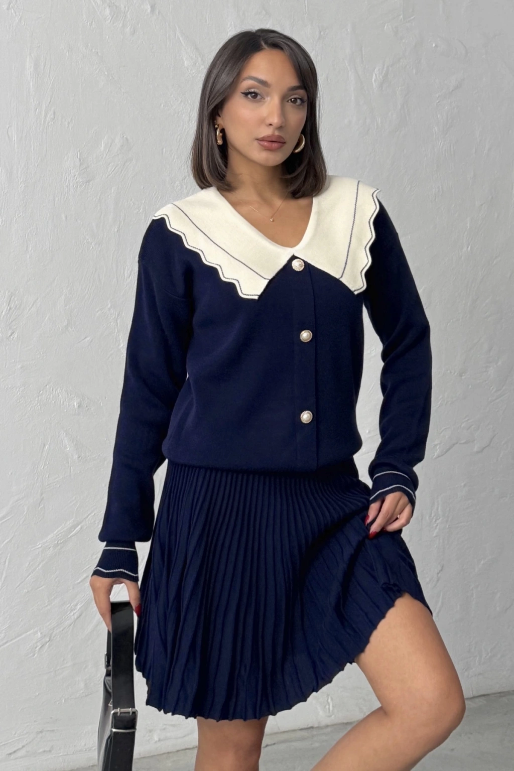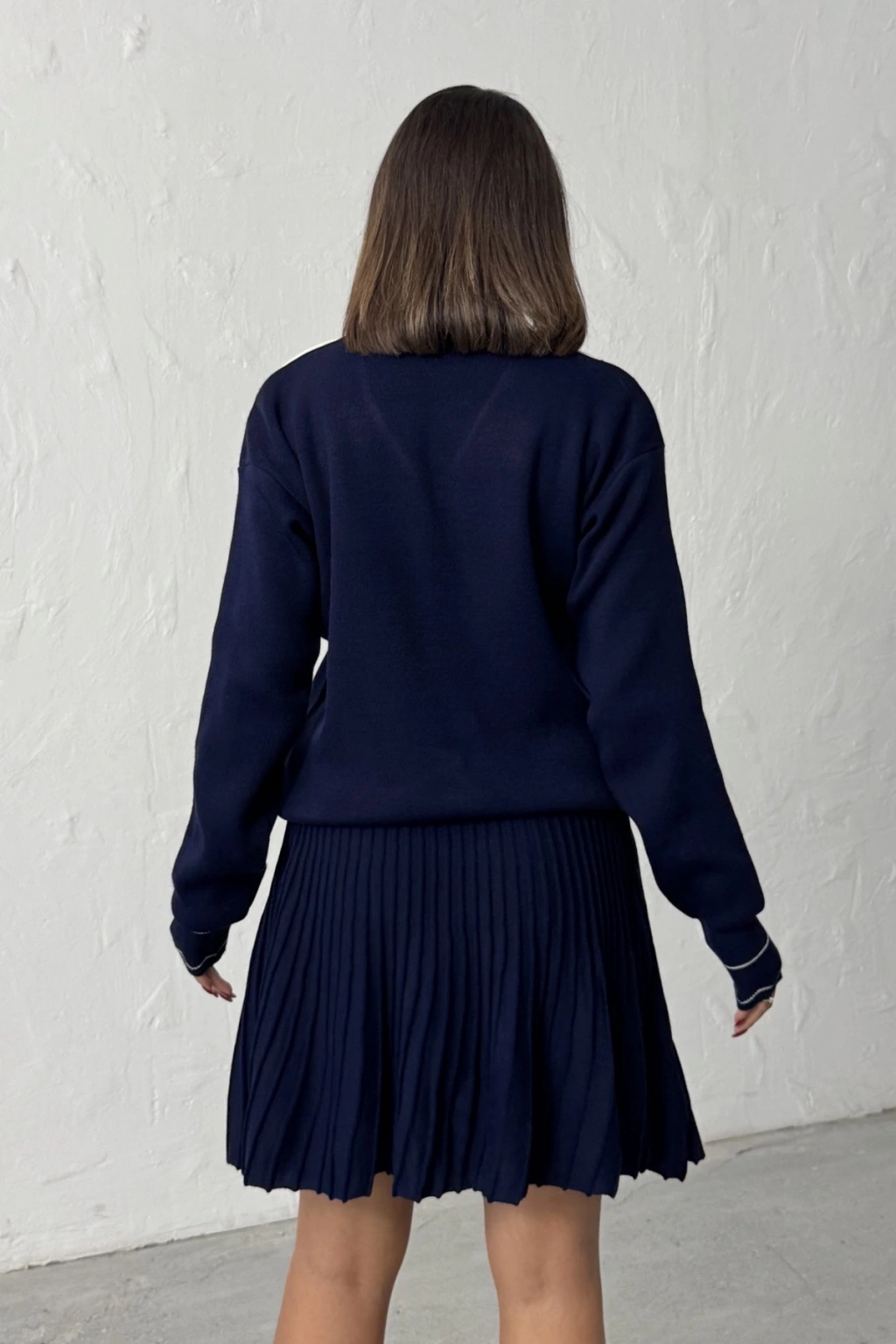 Kadın Lacivert Şık Yaka Detaylı Hırka Bluz Etek Alt Üst İkili Takım (Yeni Renk)