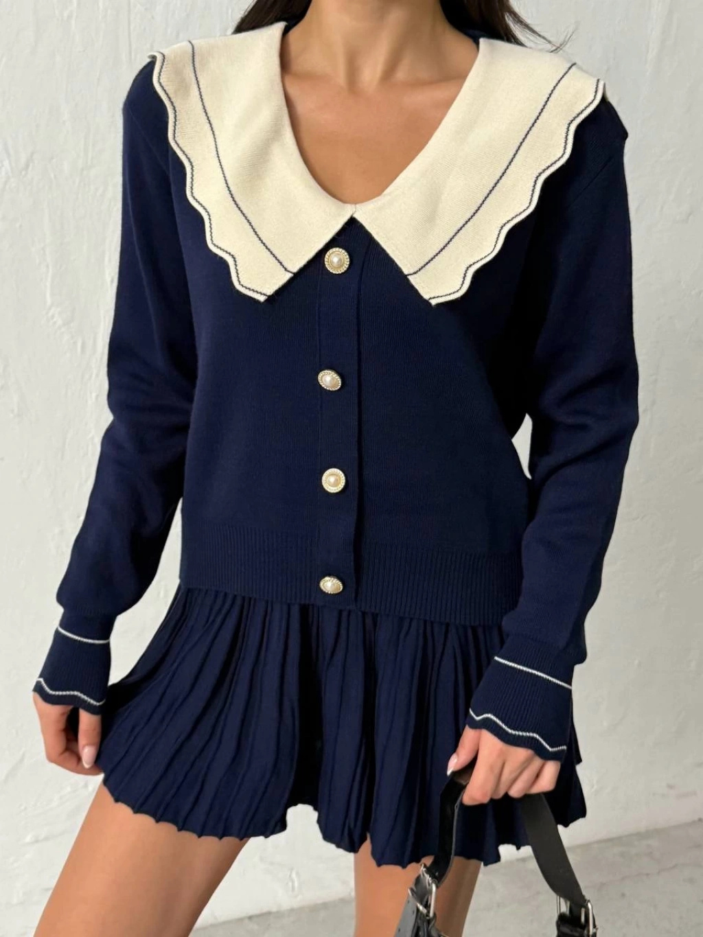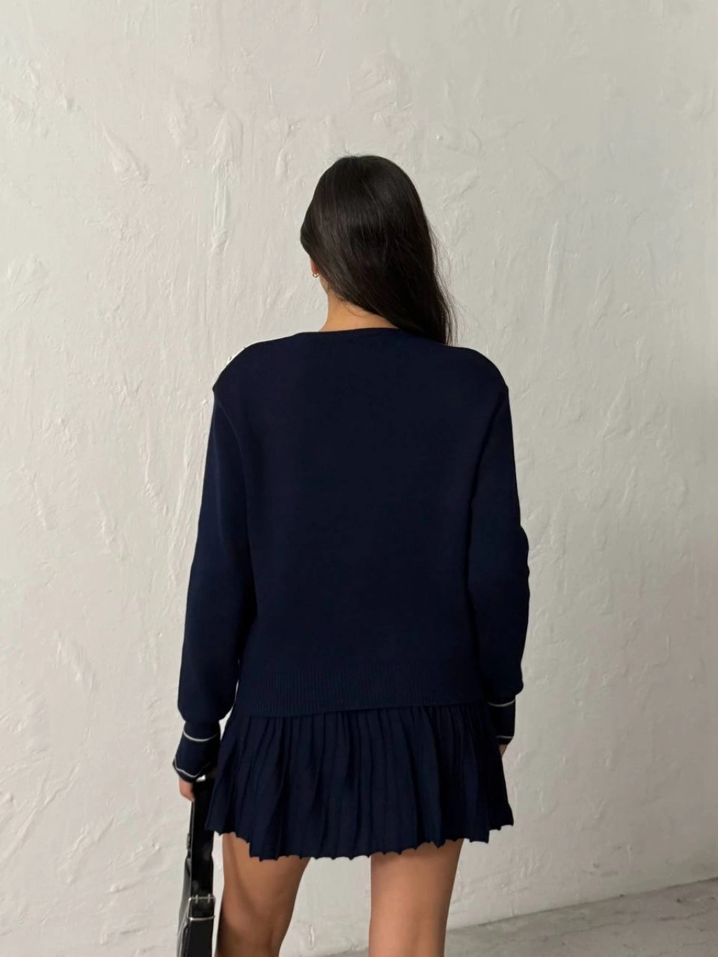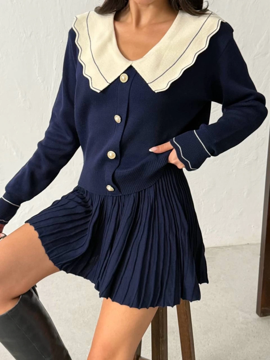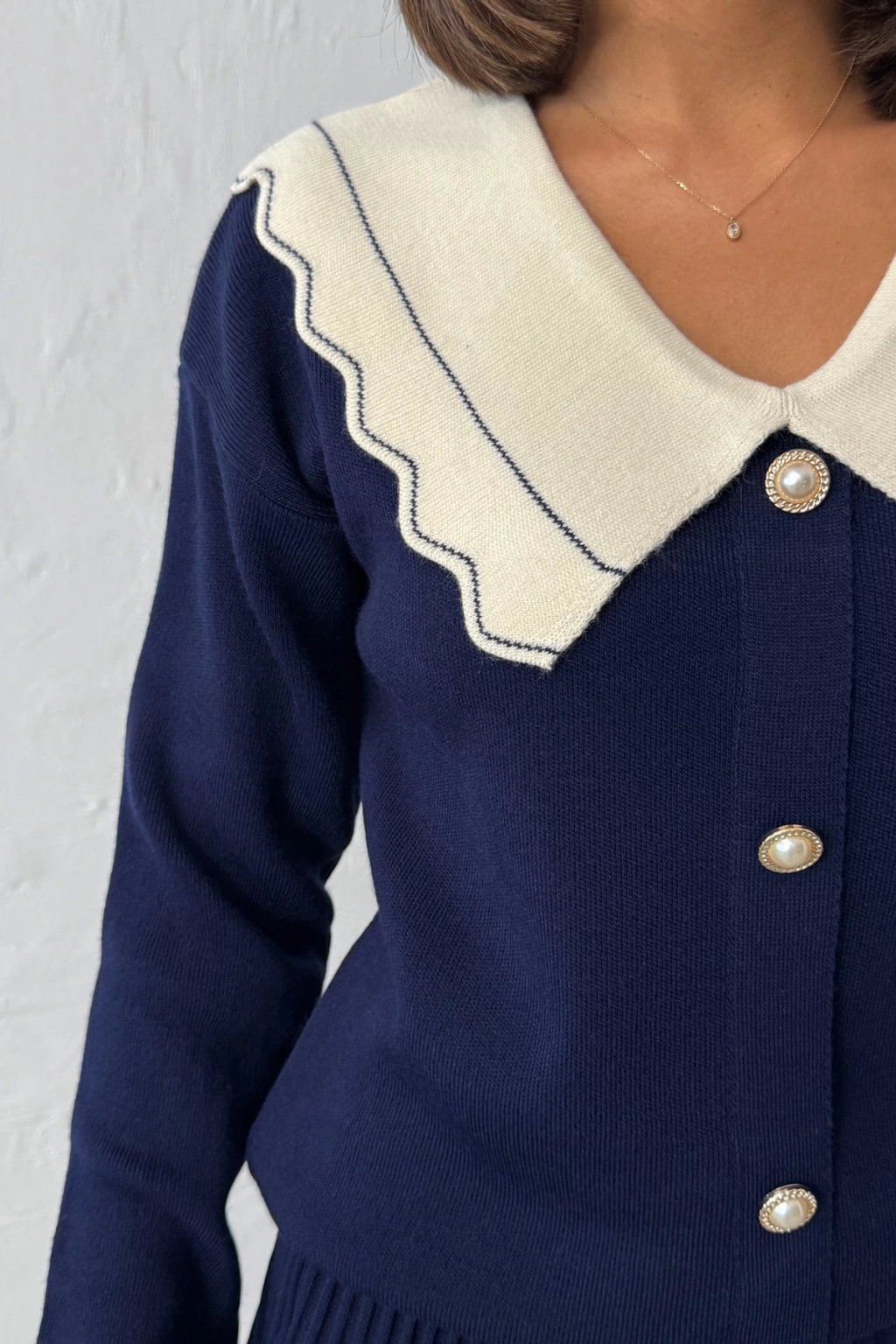 Kadın Lacivert Şık Yaka Detaylı Hırka Bluz Etek Alt Üst İkili Takım (Yeni Renk)