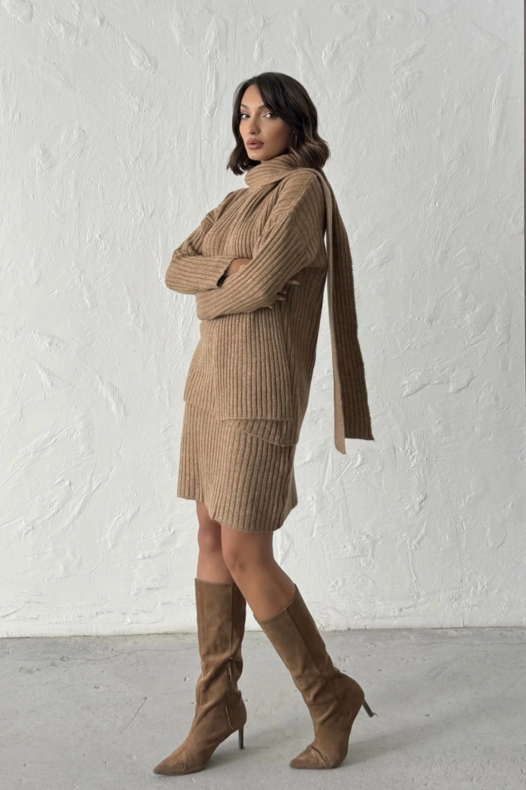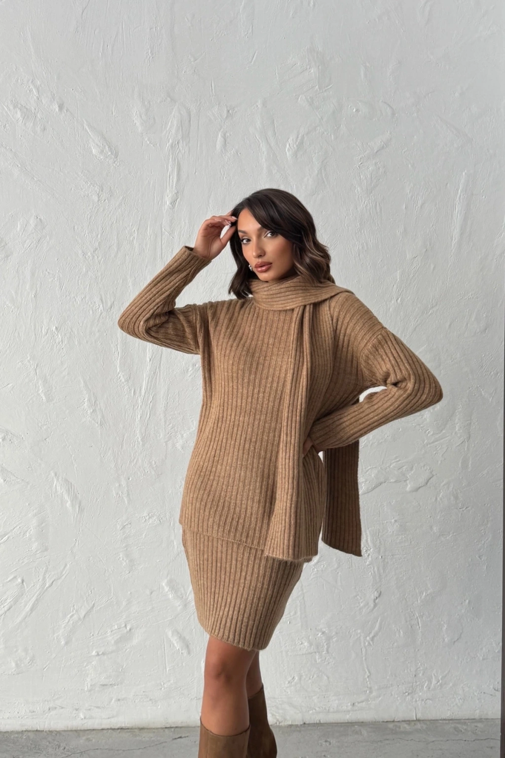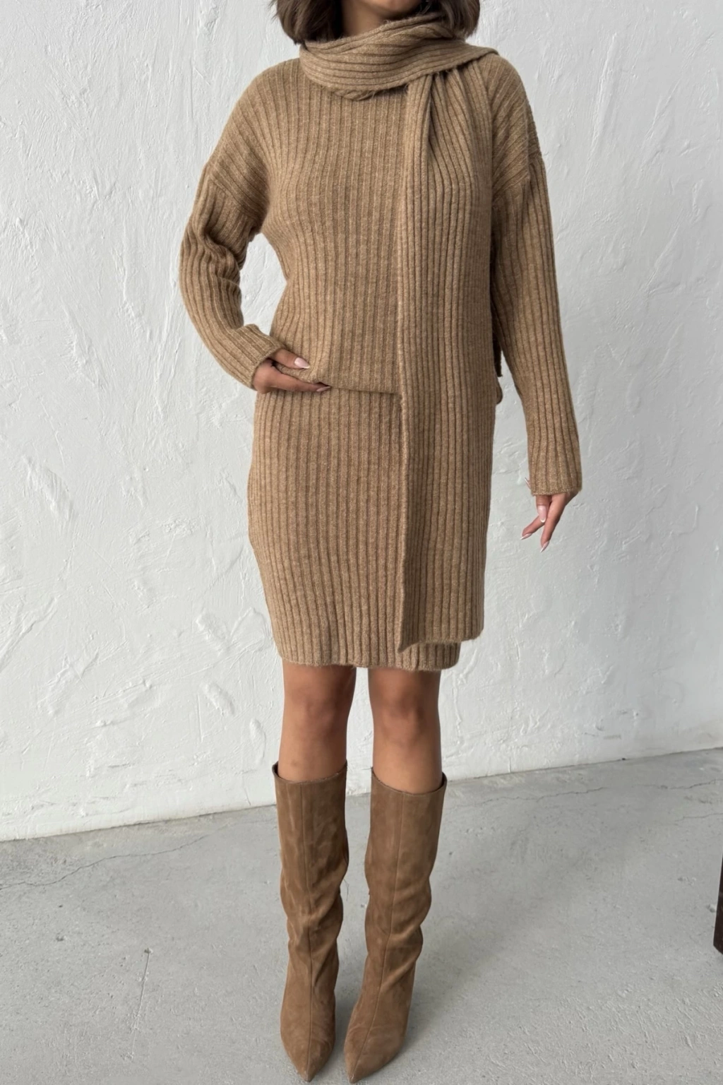 Detay: Rahat kesim kazak, uyumlu etek ve modern atkı