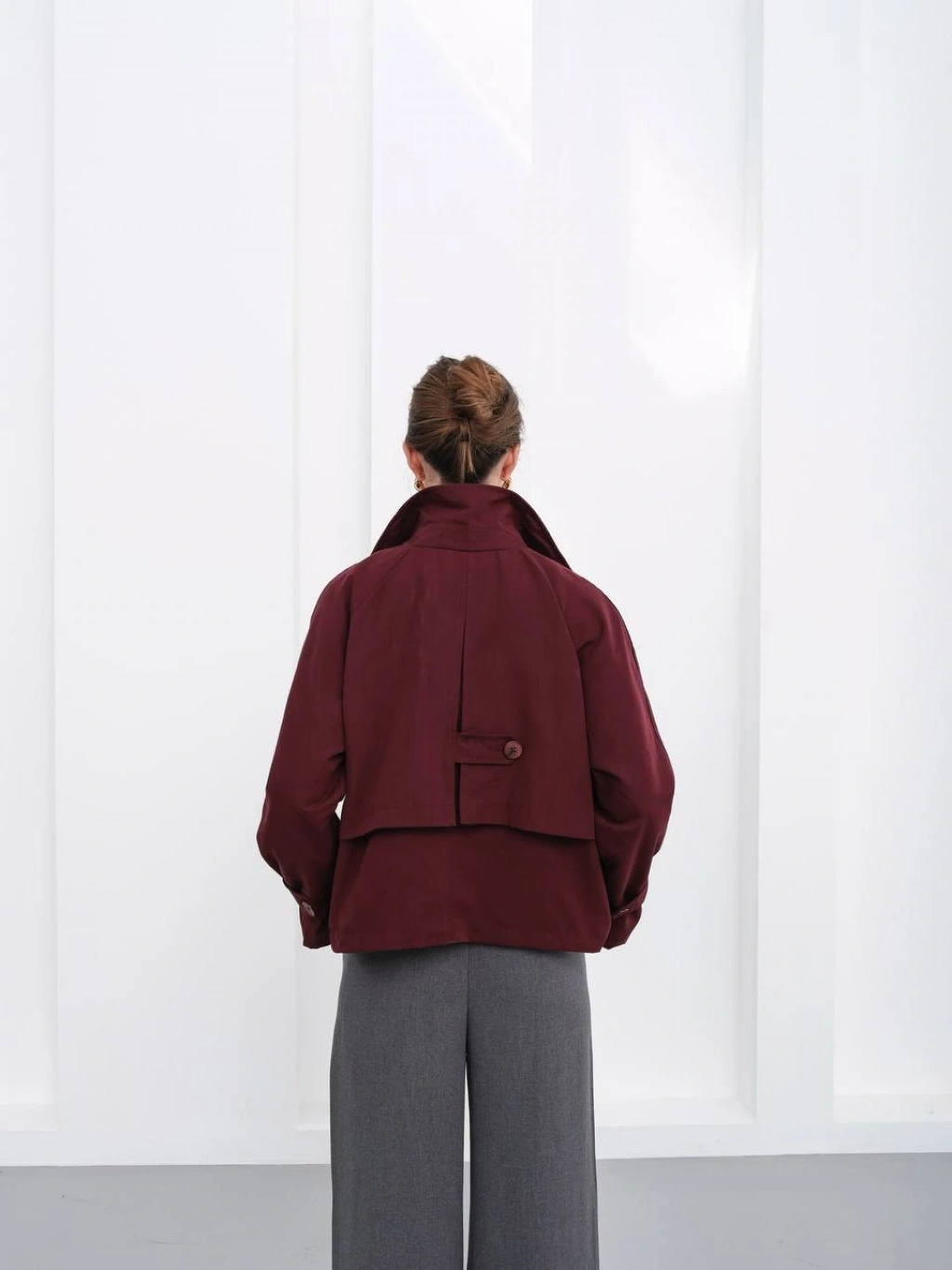 Kadın Bordo Gold Düğme ve Kemer Detaylı Kaşe Panço Ceket