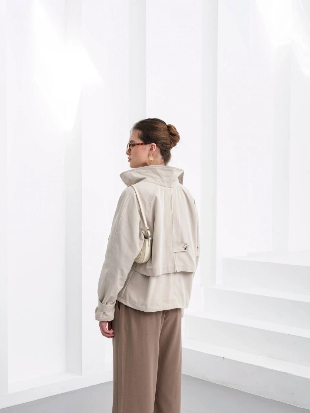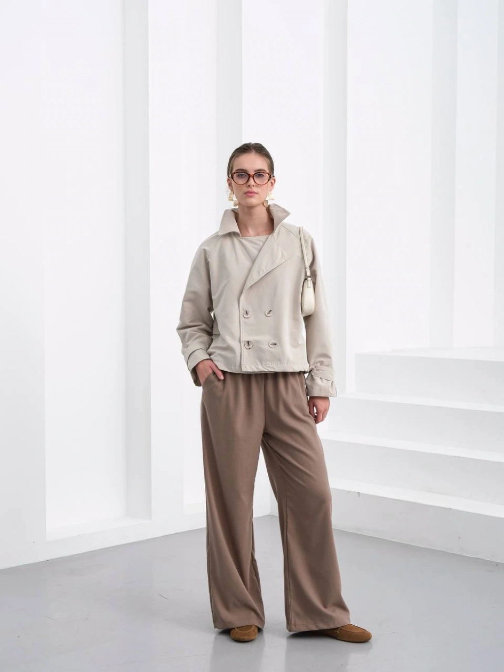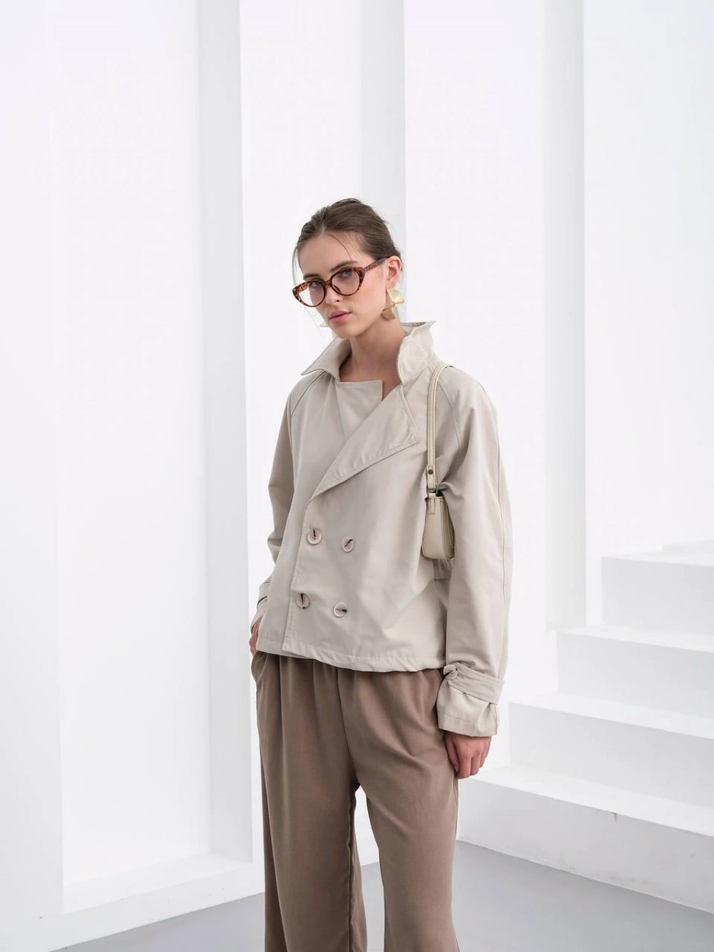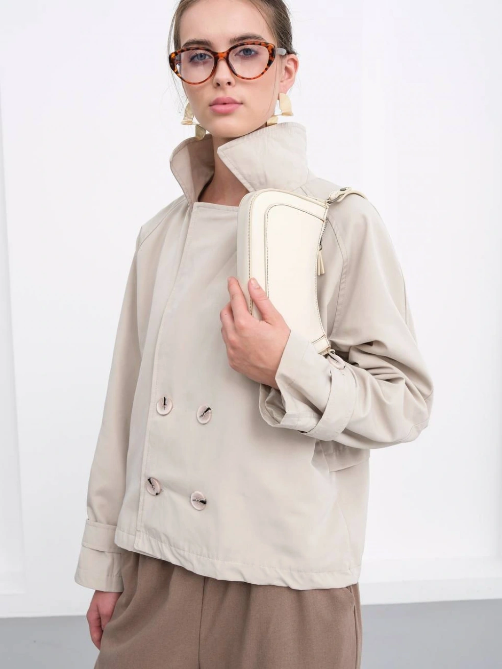 Kadın Çift Düğme detaylı Kruvaze Yaka Astarlı Kısa Premium Kalite Trençkot Ceket
