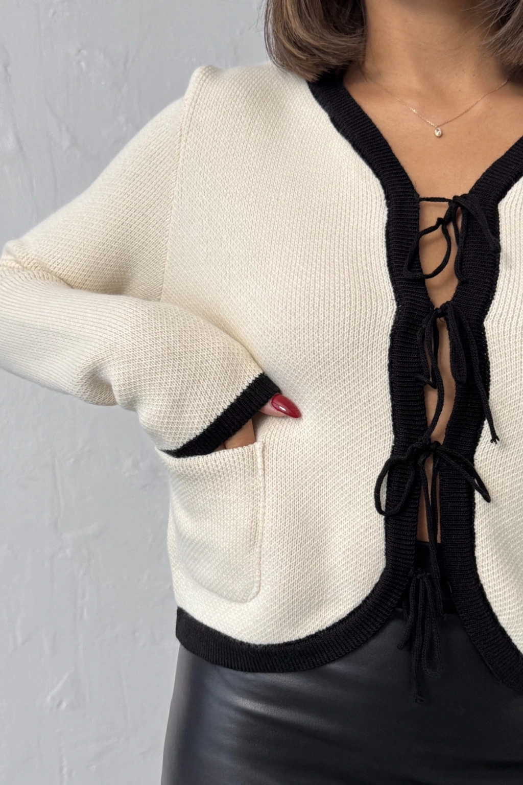 Kadın Siyah Bağcıklı Şık Cep Deyaylı Zarif Triko Hırka