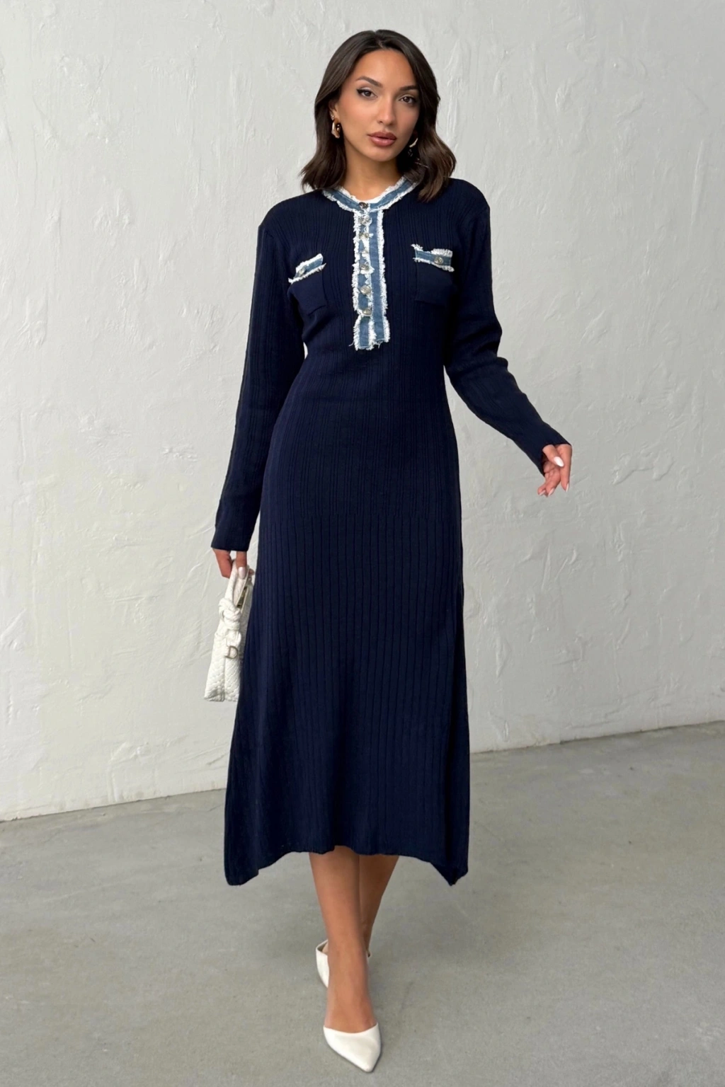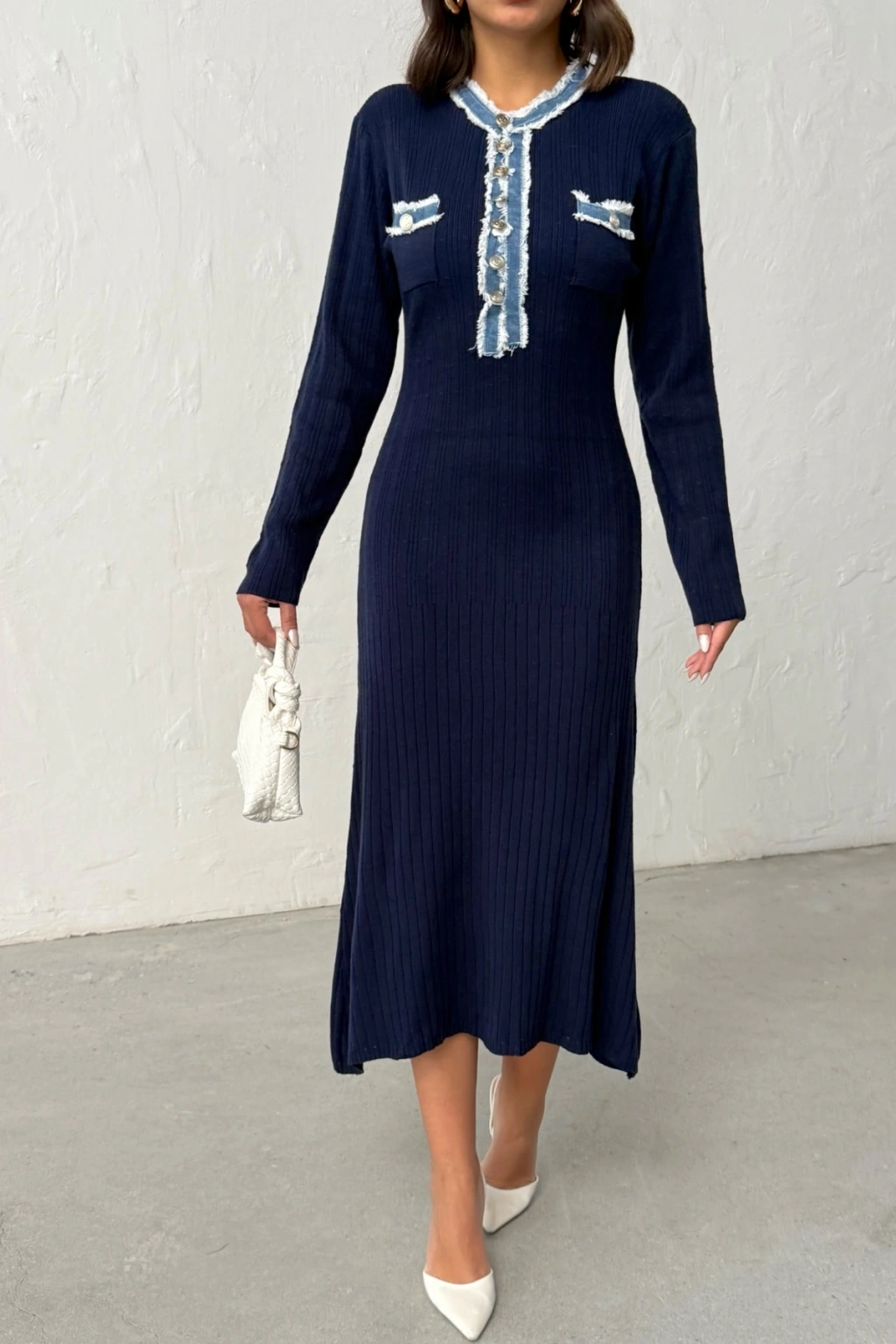 Kadın Lacivert Düğmeli Jean Detaylı Triko Elbise