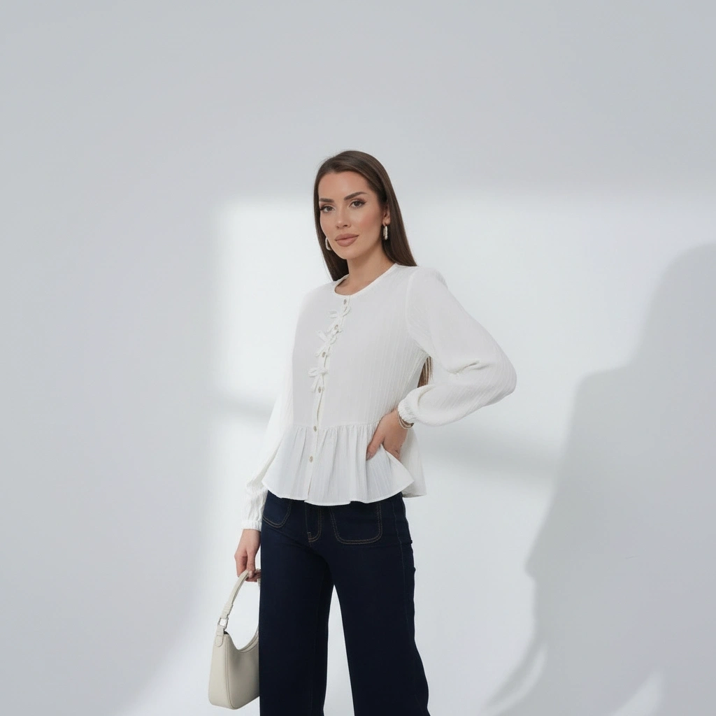 Kadın Beyaz Önü Bağcıklı Müslin Bluz