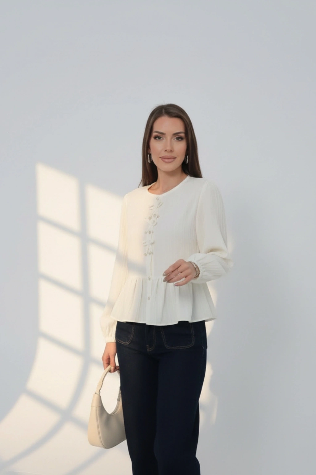 Kadın Ekru Fiyonk Detaylı Düğmeli Uzun Kol Gömlek Bluz
