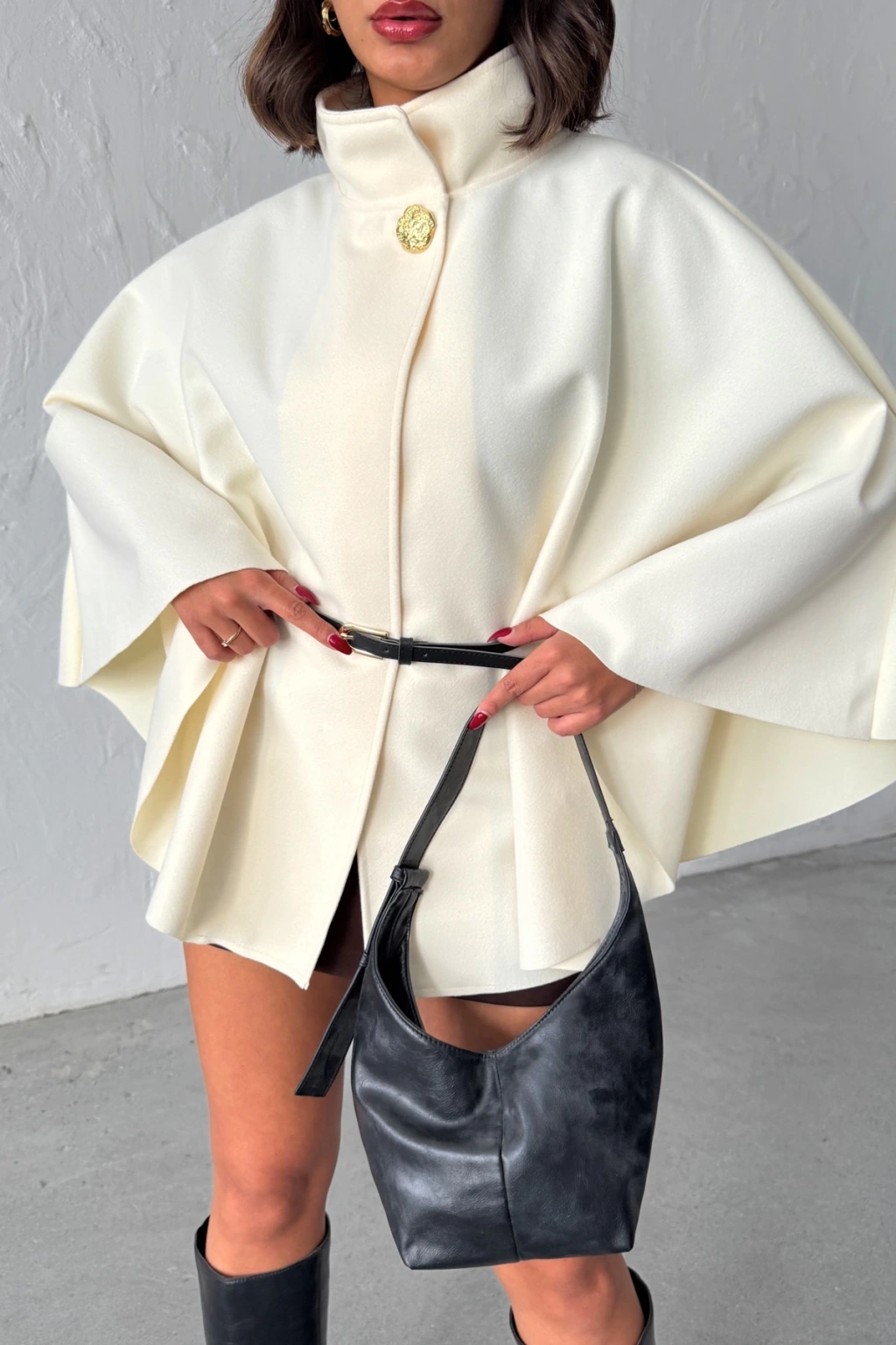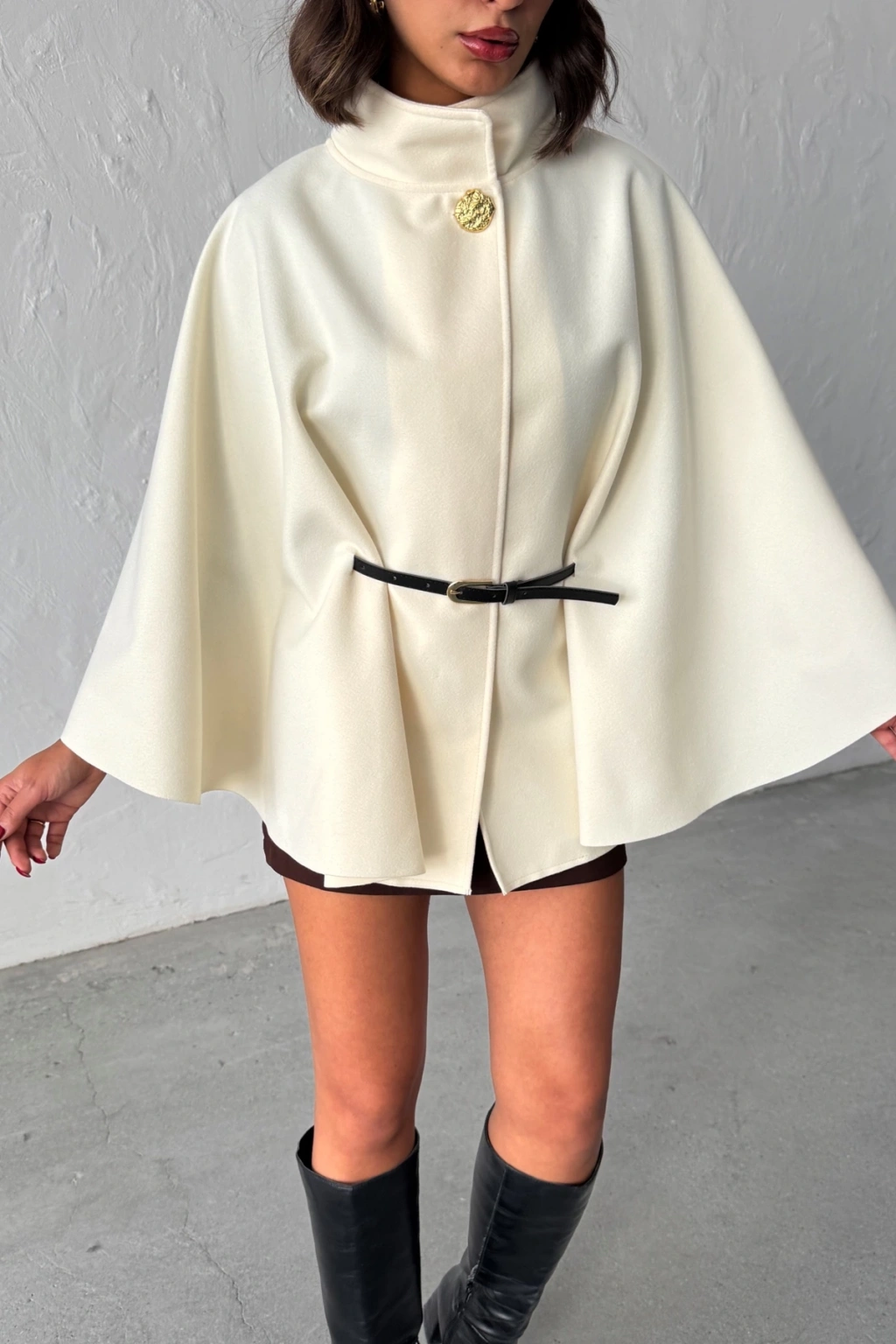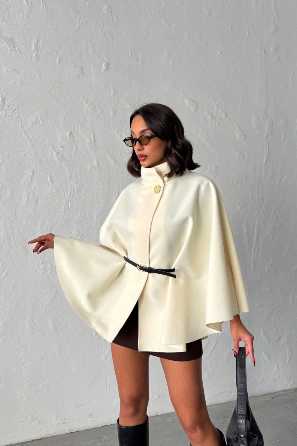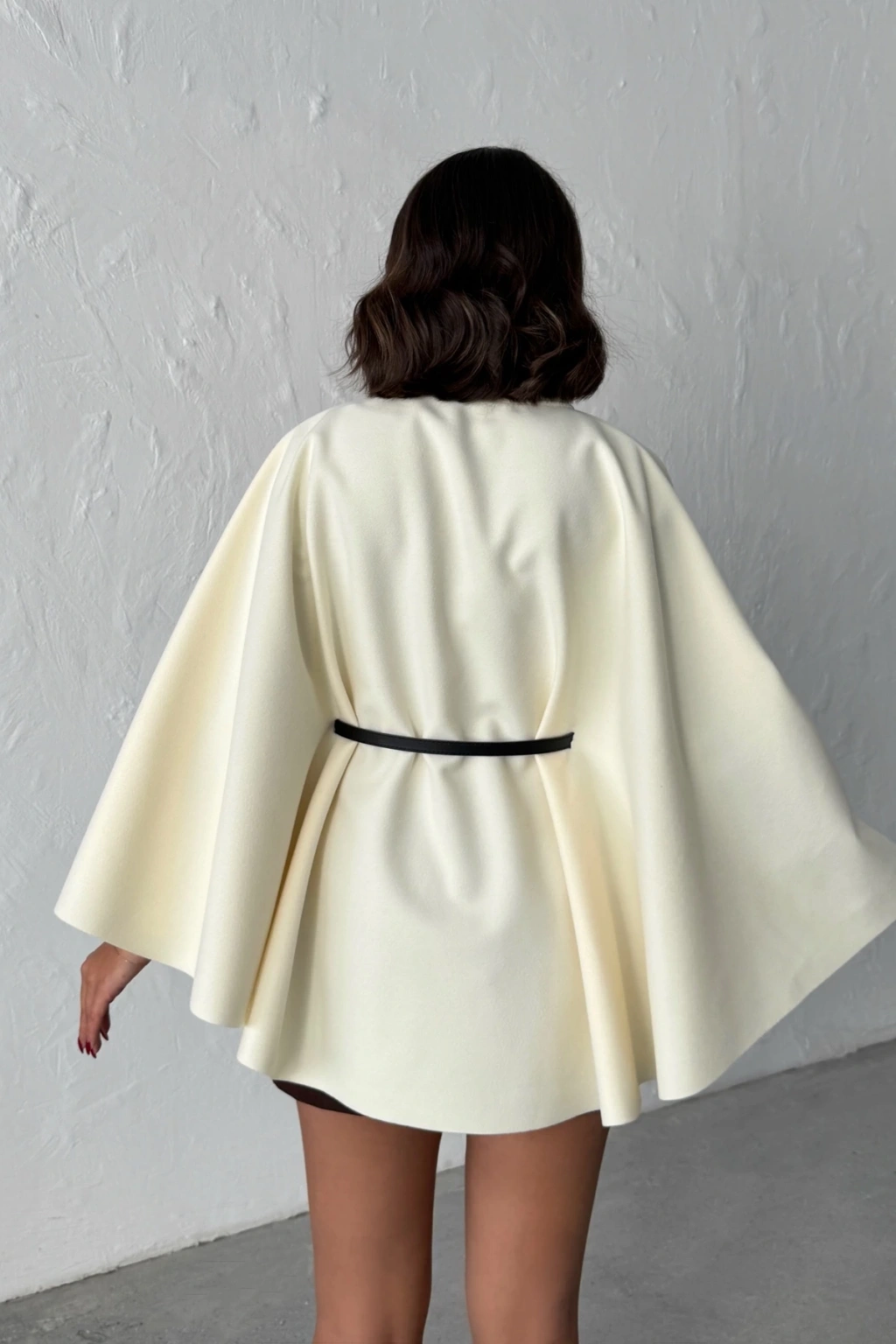 Kadın Ekru Gold Düğme ve Kemer Detaylı Kaşe Panço Ceket