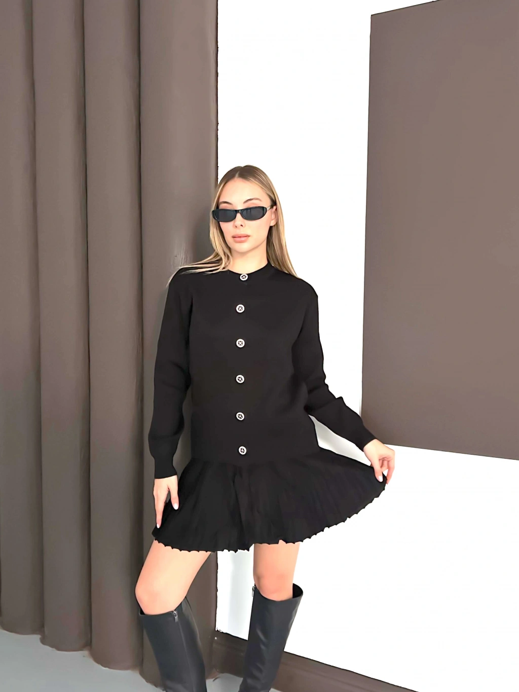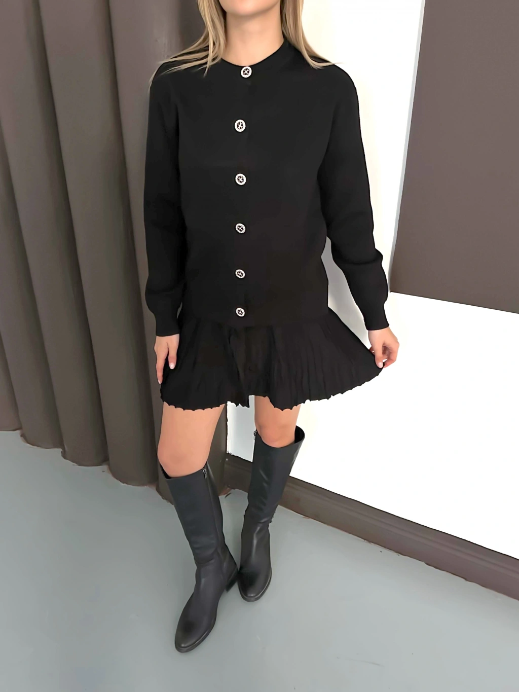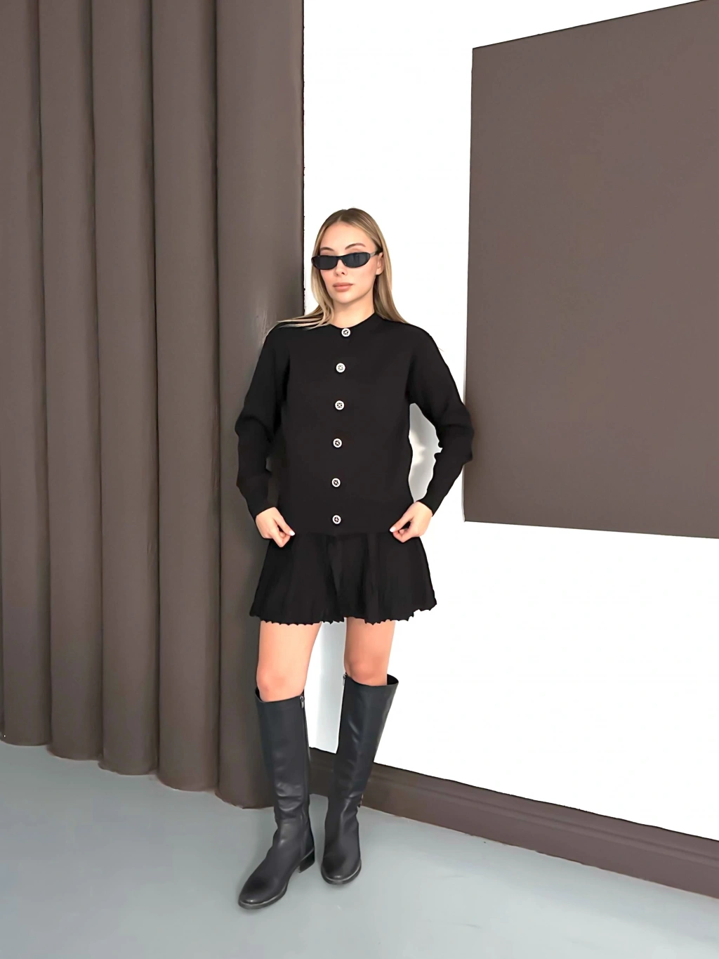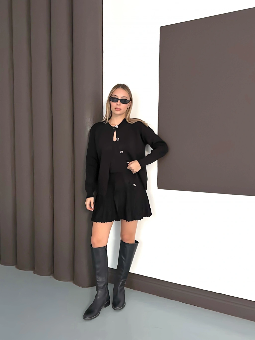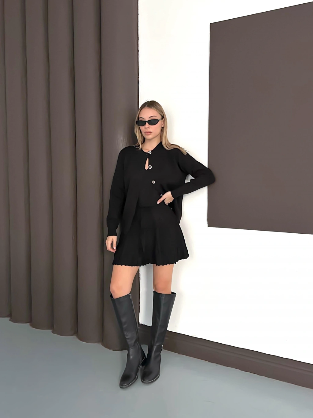 Kadın Siyah Hırka Crop Etek Üçlü Triko Takım