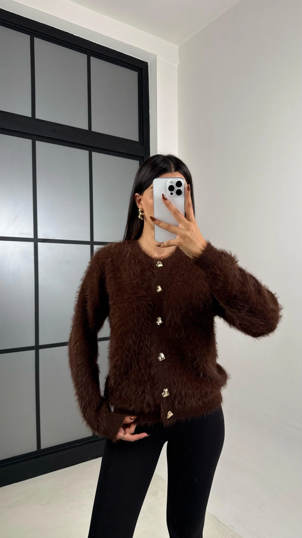 Kadın Acı Kahve Kalp Düğme Detaylı Yumuşak Dokulu Premium Kalite Hırka