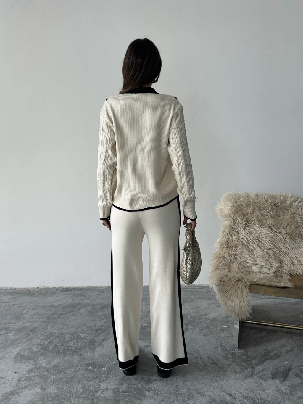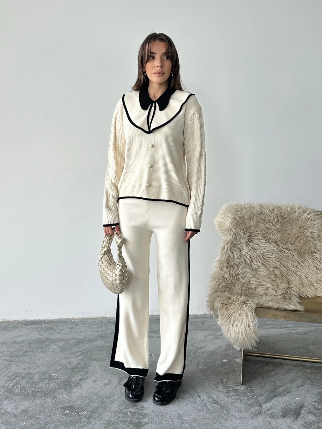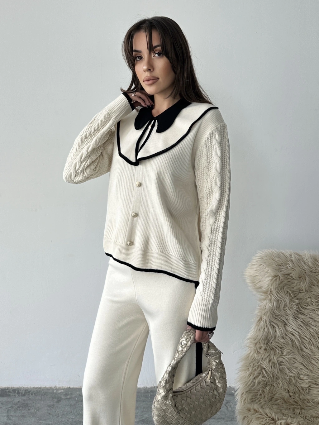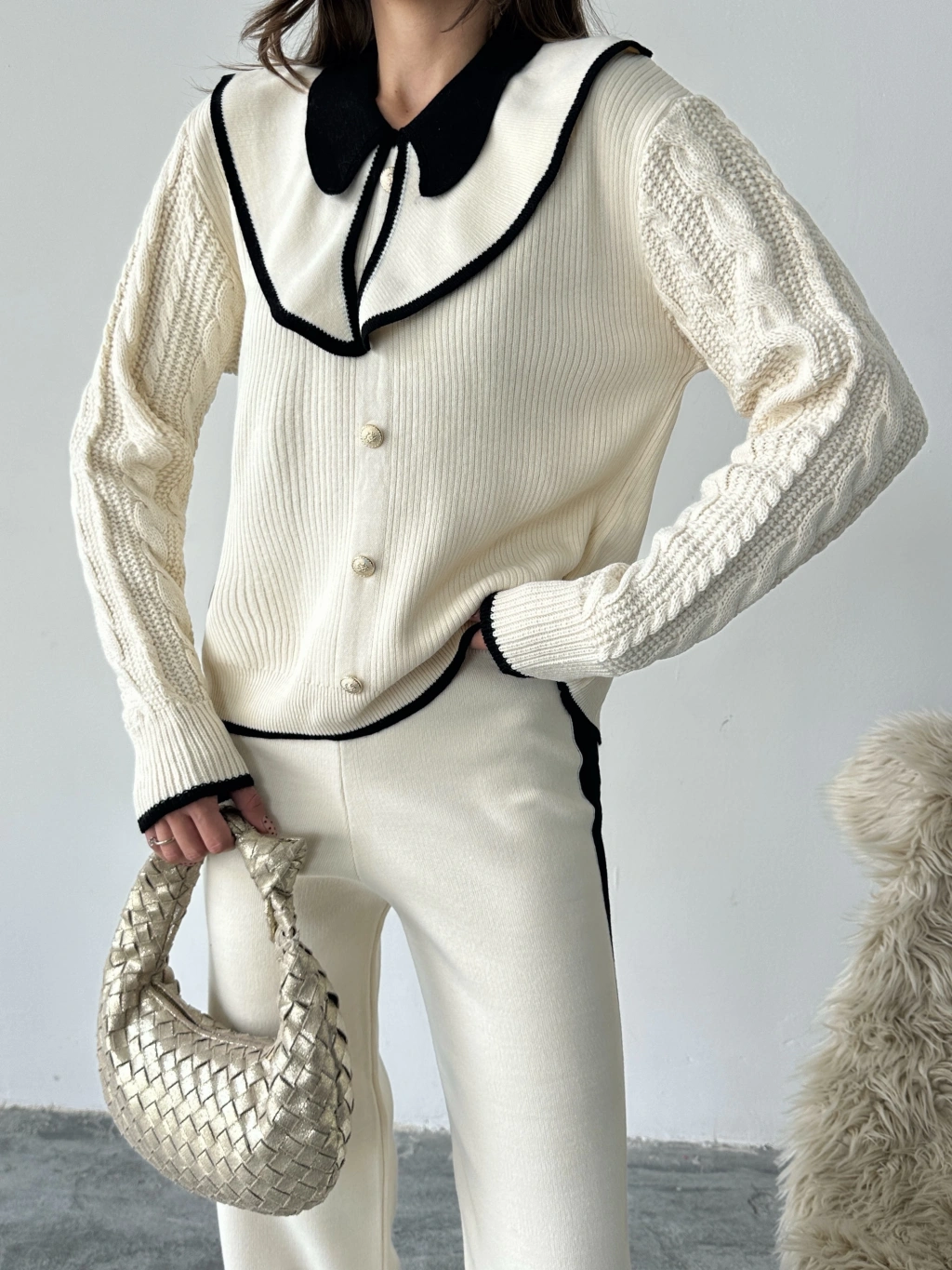 Kadın Ekru Kolu Saç Örgü Ve Şerit Detaylı Bebe Yaka Alt Üst Şık Triko Takım